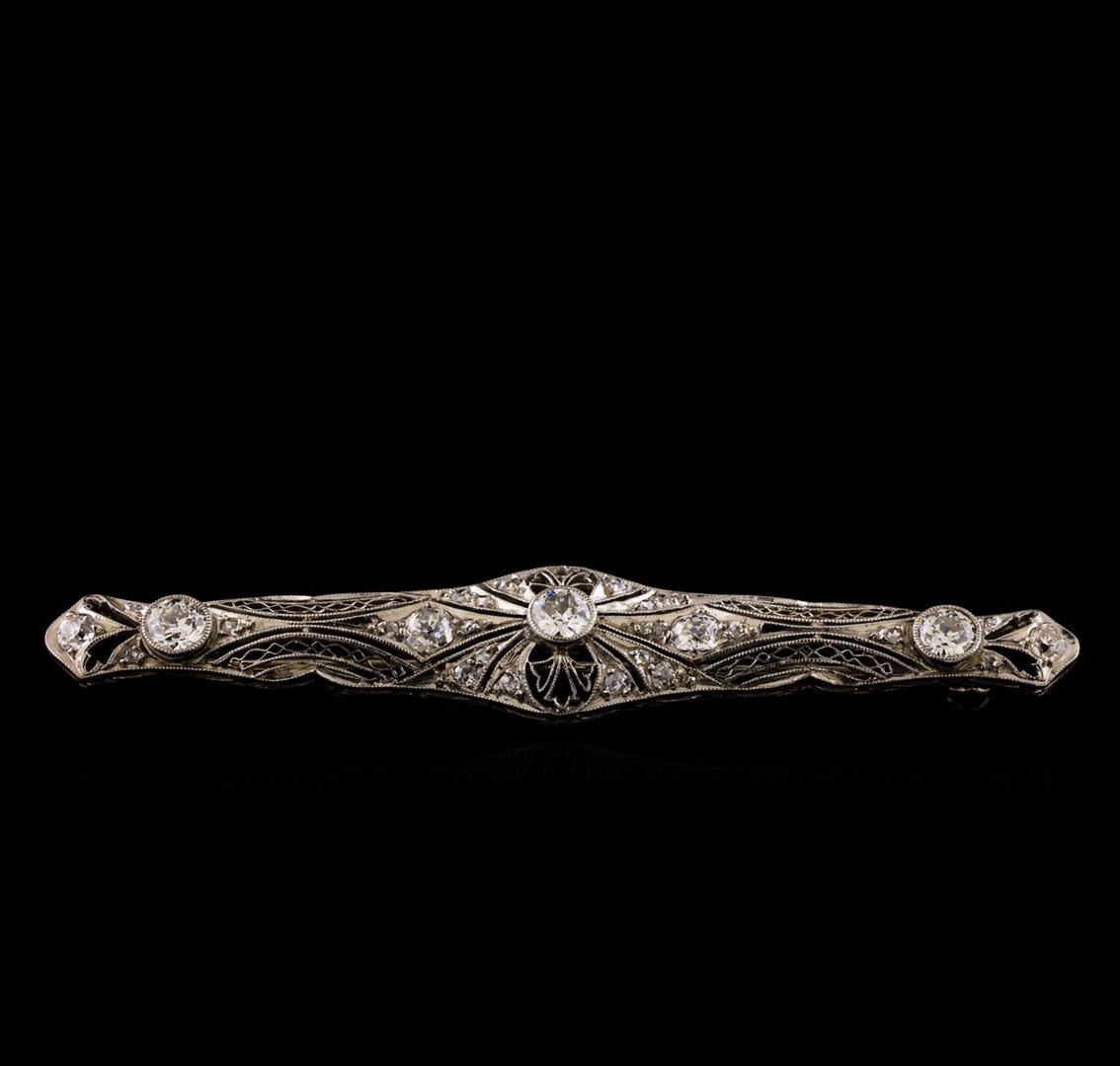 One electronically tested platinum ladies cast & assembled diamond brooch. The brooch is completed by a horizontally placed pin. Bright polish finish with milgrain detailing throughout. Area measurements 2.75 x 0.55 inches. The brooch is reminiscent of the jewelry designs from the Art Deco Period. The Paris Exposition of Decorative Arts and Modern Manufacturers in 1925 gave the movement its name. The Art Deco Period is characterized with jewelry designs composed of bold geometric designs, & cubism. Condition is good. Containing: Three bezel set Old European cut diamonds, measuring 4.30 - 4.20 x 2.20mm (depth est.) approximate total weight of 3 Stones = 0.82ct. Cutting style circa late 19th century. Graded in the setting. Clarity: SI-1 to SI-2. Color: H - I Four bead set Old European cut diamonds, measuring 3.50 - 3.10 x 2.20mm (depth est.) approximate total weight of 4 Stones = 0.68ct. Cutting style circa early and late 19th century. Graded in the setting. Clarity: SI-1 to SI-2. Color: H - I Twenty-Two bead set rose cut diamonds, measuring 1.70 - 1.30 x 0.70mm (depth est.) approximate total weight of 22 Stones = 0.20 ct. Graded in the setting. Clarity: SI-1 to I-1. Color: H - I. Total Weight of Diamonds 1.70 ct. Total Weight of Brooch 8.46 grams. AIG Appraised.