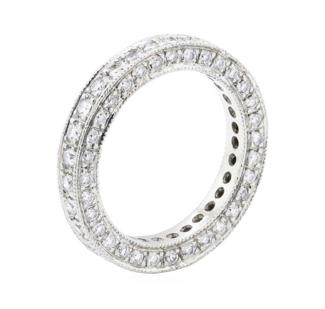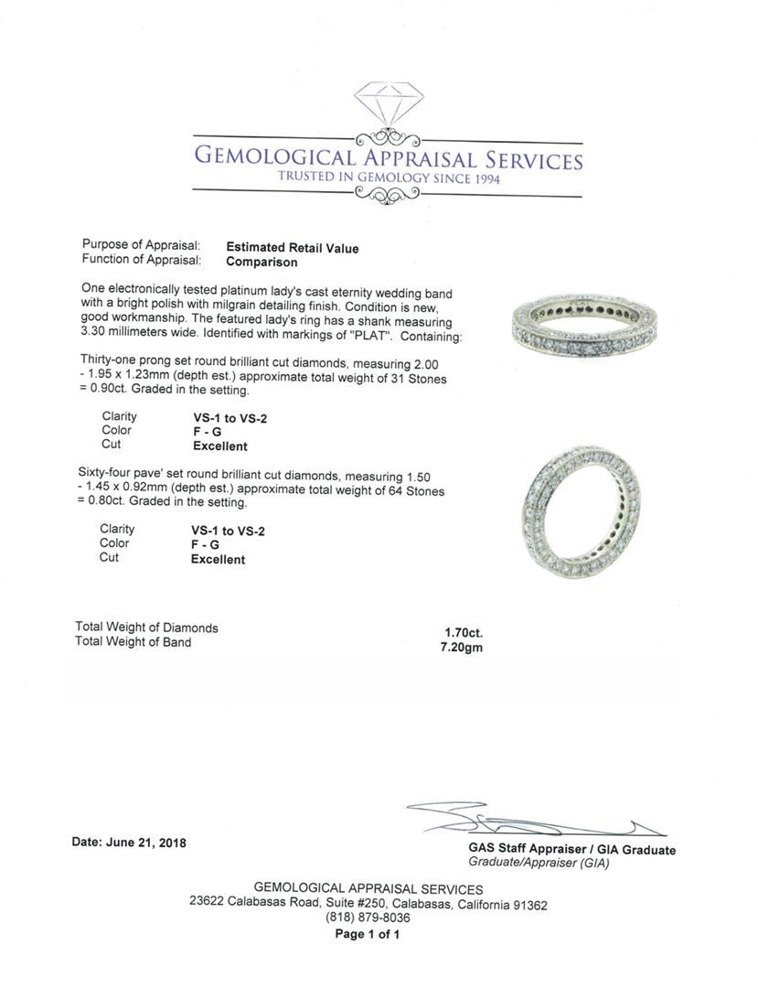 One electronically tested platinum lady's cast eternity wedding band with a bright polish with milgrain detailing finish. The featured lady's ring has a shank measuring 3.30 millimeters wide. Identified with markings of 'PLAT'. Condition is new, good workmanship. Containing: Thirty-One prong set round brilliant cut diamonds, measuring 2.00 - 1.95 x 1.23mm (depth est.) approximate total weight of 31 Stones = 0.90ct. Graded in the setting. Color F - G Clarity VS-1 to VS-2 Cut Excellent Sixty-Four pave' set round brilliant cut diamonds, measuring 1.50 - 1.45 x 0.92mm (depth est.) approximate total weight of 64 Stones = 0.80ct. Graded in the setting. Color F - G Clarity VS-1 to VS-2 Cut Excellent. Total Weight of Diamonds 1.70ct. Total Weight of Band 7.20gm. GAS Appraised.