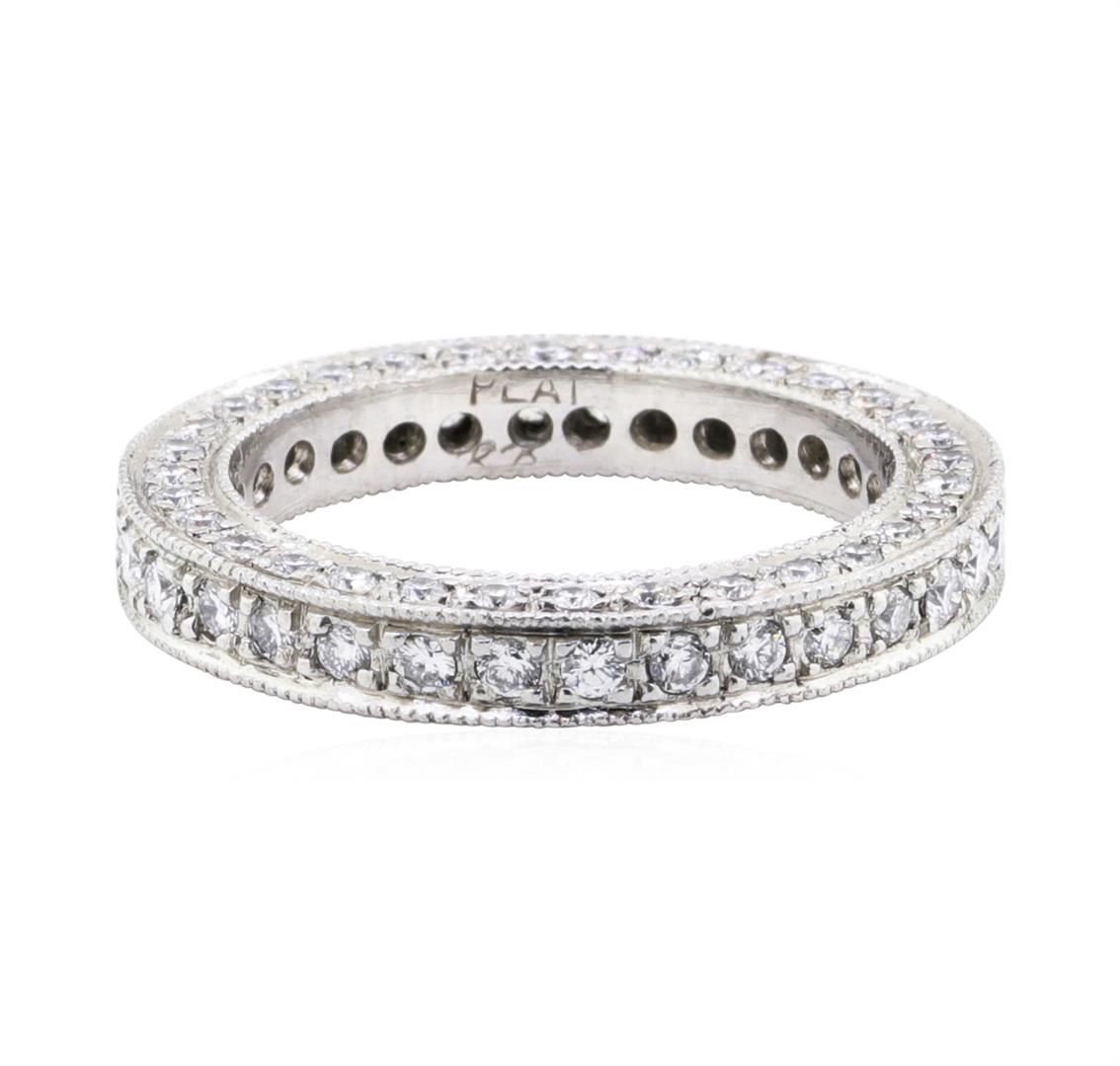 One electronically tested platinum lady's cast eternity wedding band with a bright polish with milgrain detailing finish. The featured lady's ring has a shank measuring 3.30 millimeters wide. Identified with markings of 'PLAT'. Condition is new, good workmanship. Containing: Thirty-One prong set round brilliant cut diamonds, measuring 2.00 - 1.95 x 1.23mm (depth est.) approximate total weight of 31 Stones = 0.90ct. Graded in the setting. Color F - G Clarity VS-1 to VS-2 Cut Excellent Sixty-Four pave' set round brilliant cut diamonds, measuring 1.50 - 1.45 x 0.92mm (depth est.) approximate total weight of 64 Stones = 0.80ct. Graded in the setting. Color F - G Clarity VS-1 to VS-2 Cut Excellent. Total Weight of Diamonds 1.70ct. Total Weight of Band 7.20gm. GAS Appraised.