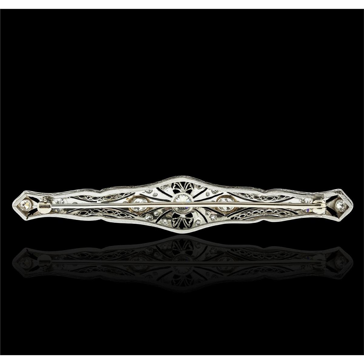 One electronically tested platinum ladies cast & assembled diamond brooch. The brooch is completed by a horizontally placed pin. Bright polish finish with milgrain detailing throughout. Area measurements 2.75 x 0.55 inches. The brooch is reminiscent of the jewelry designs from the Art Deco Period. The Paris Exposition of Decorative Arts and Modern Manufacturers in 1925 gave the movement its name. The Art Deco Period is characterized with jewelry designs composed of bold geometric designs, & cubism. Condition is good. Containing: Three bezel set Old European cut diamonds, measuring 4.30 - 4.20 x 2.20mm (depth est.) approximate total weight of 3 Stones = 0.82ct. Cutting style circa late 19th century. Graded in the setting. Clarity: SI-1 to SI-2. Color: H - I Four bead set Old European cut diamonds, measuring 3.50 - 3.10 x 2.20mm (depth est.) approximate total weight of 4 Stones = 0.68ct. Cutting style circa early and late 19th century. Graded in the setting. Clarity: SI-1 to SI-2. Color: H - I Twenty-Two bead set rose cut diamonds, measuring 1.70 - 1.30 x 0.70mm (depth est.) approximate total weight of 22 Stones = 0.20ct. Graded in the setting. Clarity: SI-1 to I-1. Color: H - I. Total Weight of Diamonds 1.70ct. Total Weight of Brooch 8.46 grams. AIG Appraised at $7,290.00.