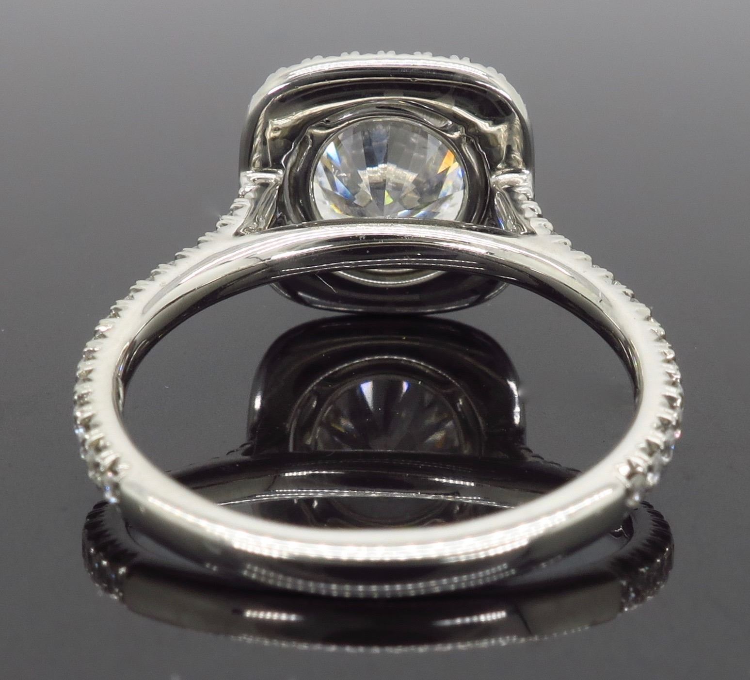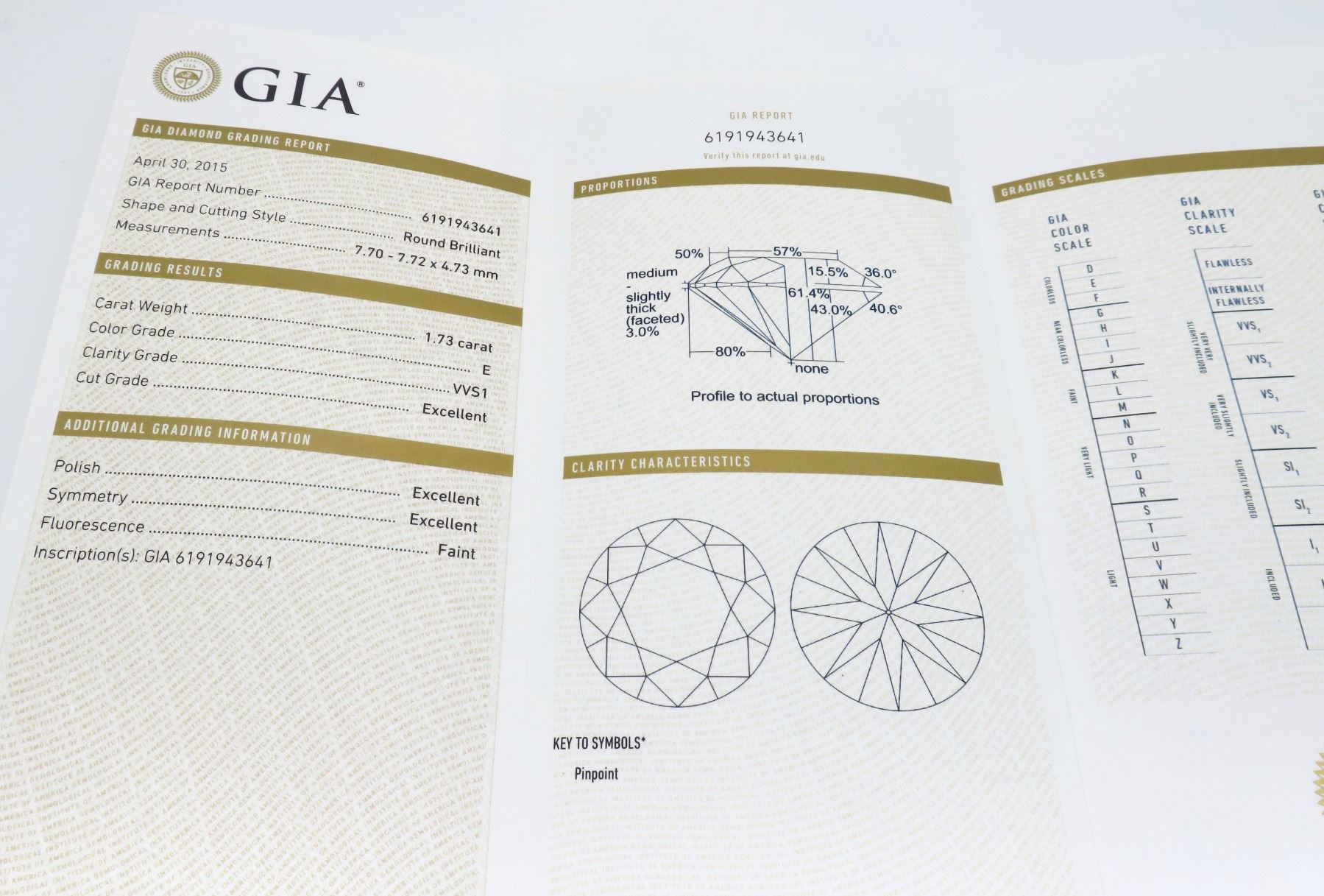 One Platinum 1.73ct GIA Cert Diamond Ring. (1) GIA Certified round Diamond with a total weight of 1.73cts with a color of E and clarity of VVS-1. Round side Diamonds with a weight of 0.27cts with a color of G-H and clarity of VS-2 to SI-2. Total weight of this ring is 4.6 grams. Ring size is 5.75.