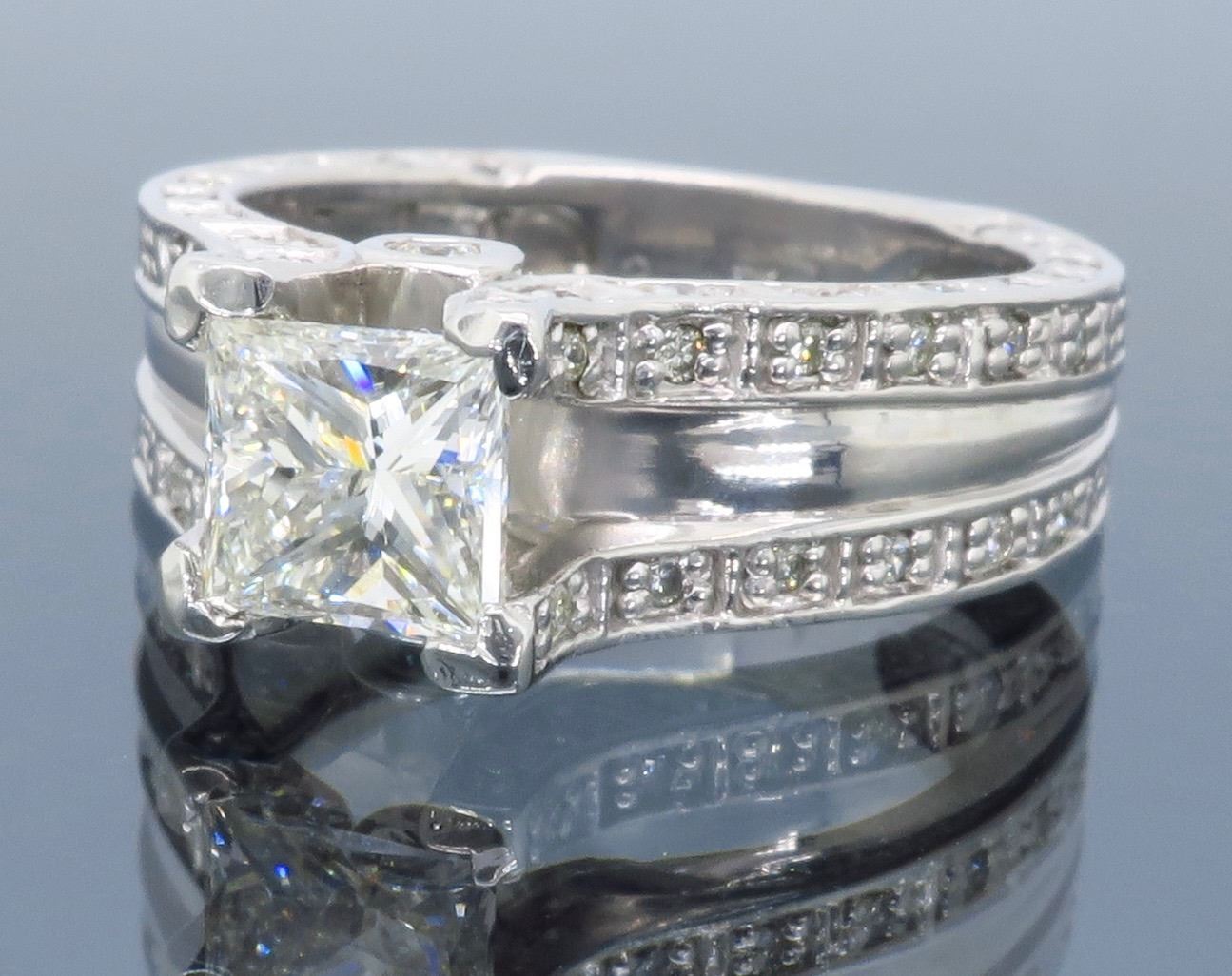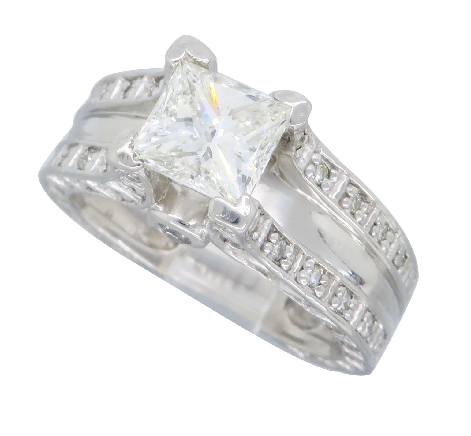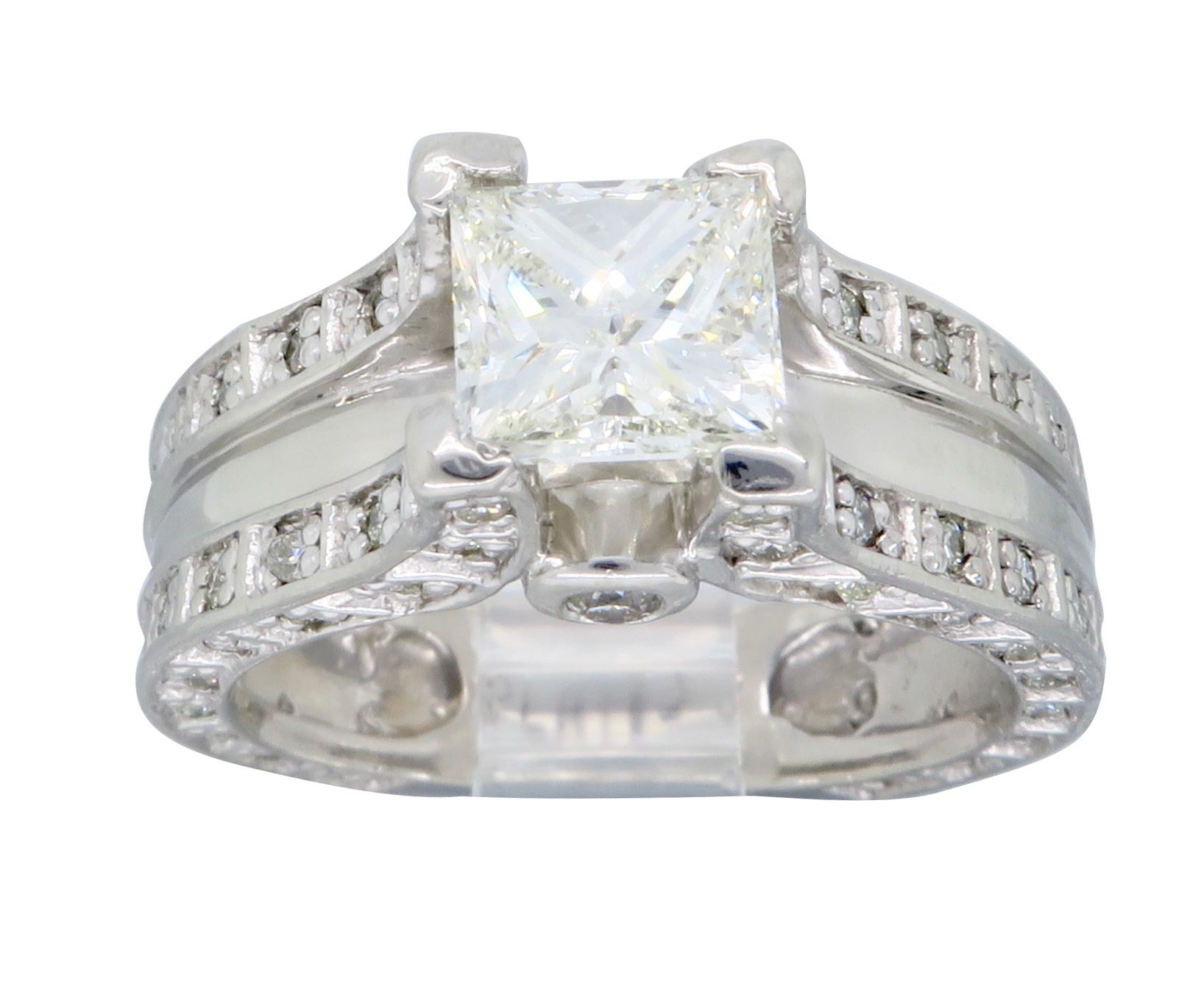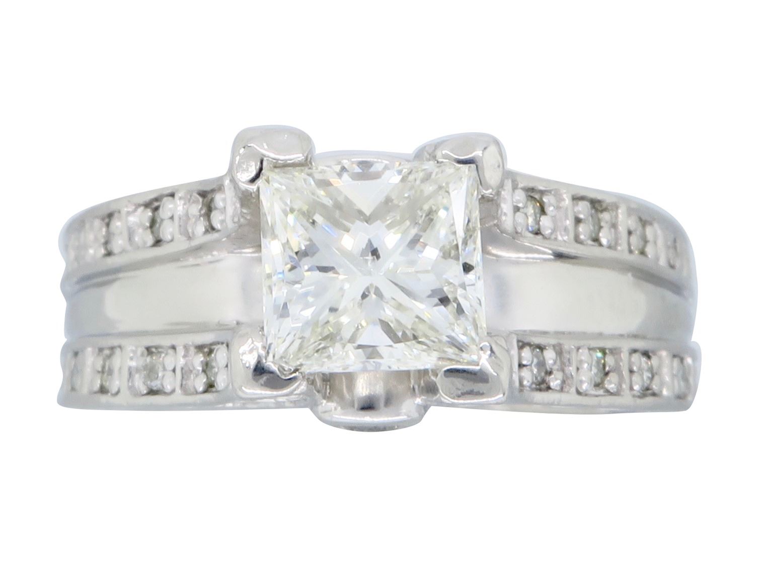 One Platinum 1.75ctw Diamond Ring. (1) Princess cut center Diamond with a total weight of 1.05cts with a color of I-J and clarity of VS-2 to SI-1. (82) round Diamonds with a total weight of 0.70cts. Total weight of this ring is 9.5 grams. Ring size is 5.5.