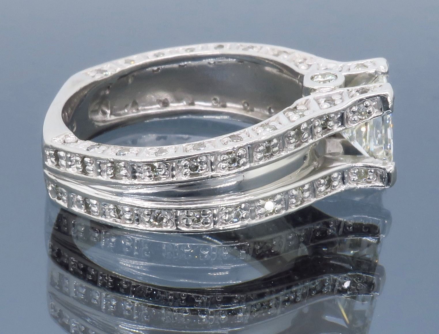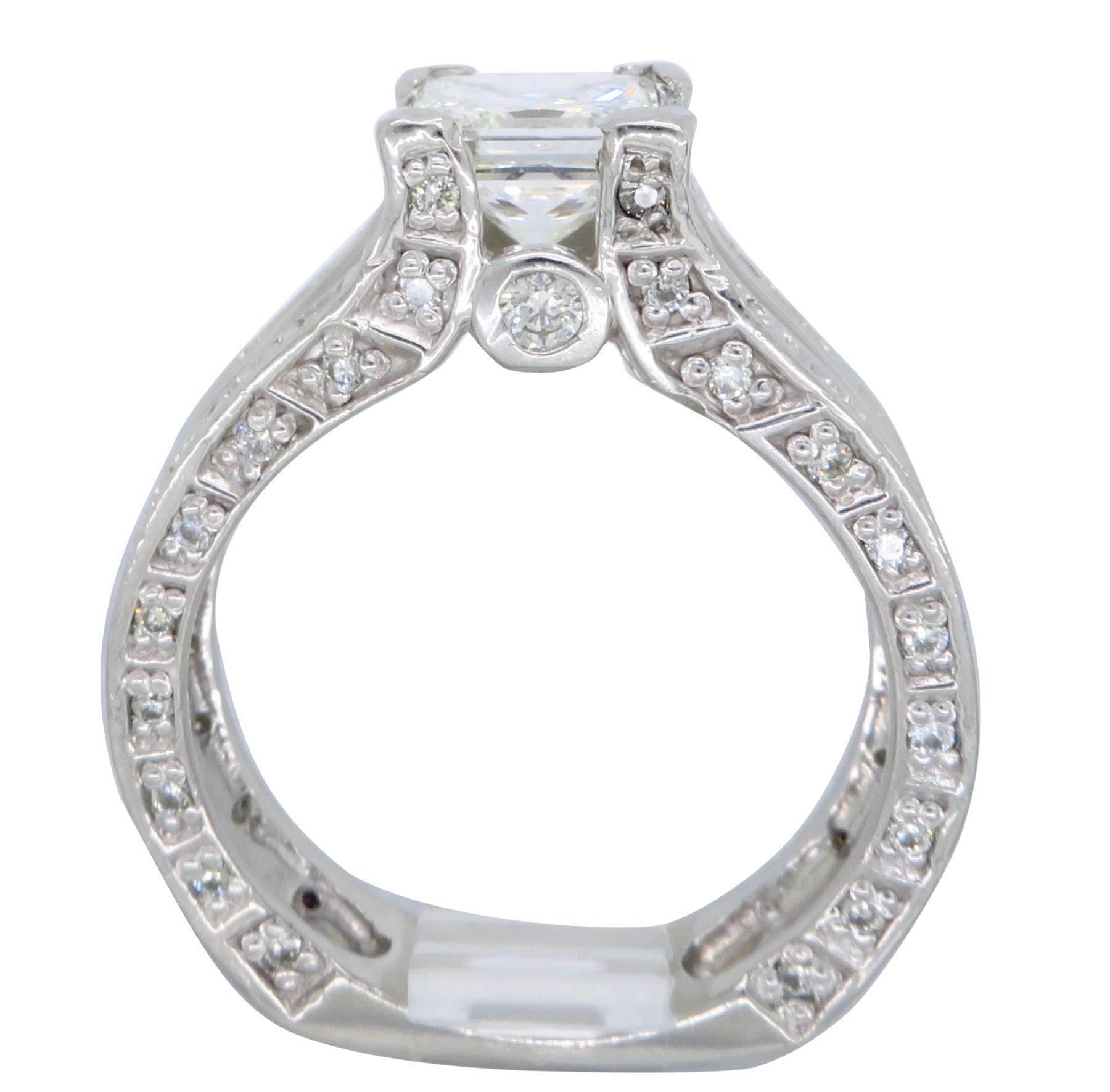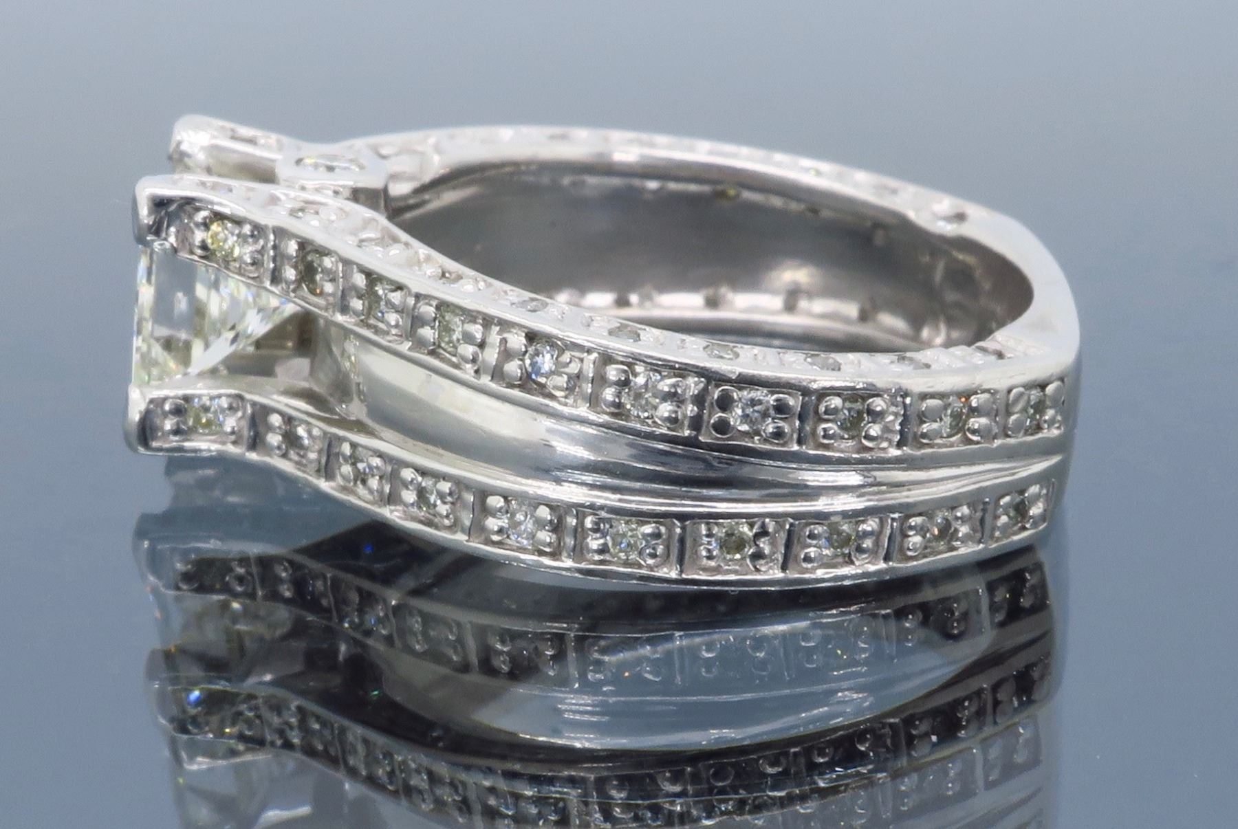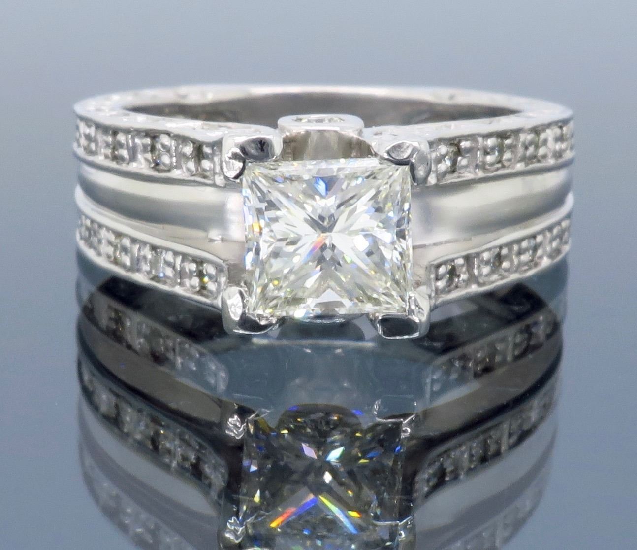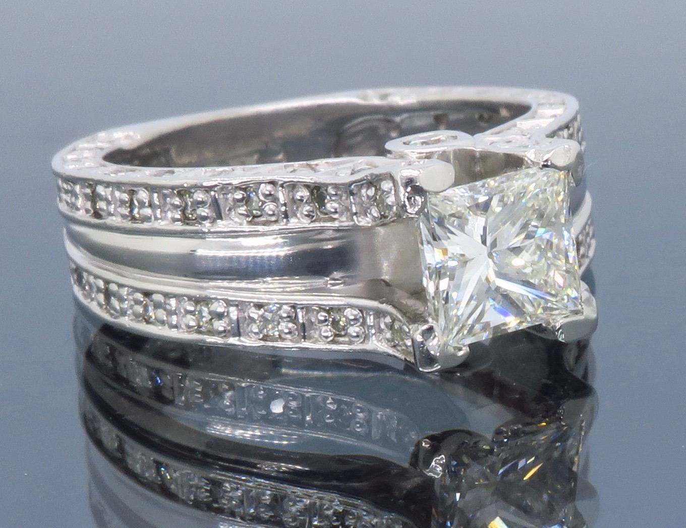 One Platinum 1.75ctw Diamond Ring. (1) Princess cut center Diamond with a total weight of 1.05cts with a color of I-J and clarity of VS-2 to SI-1. (82) round Diamonds with a total weight of 0.70cts. Total weight of this ring is 9.5 grams. Ring size is 5.5.