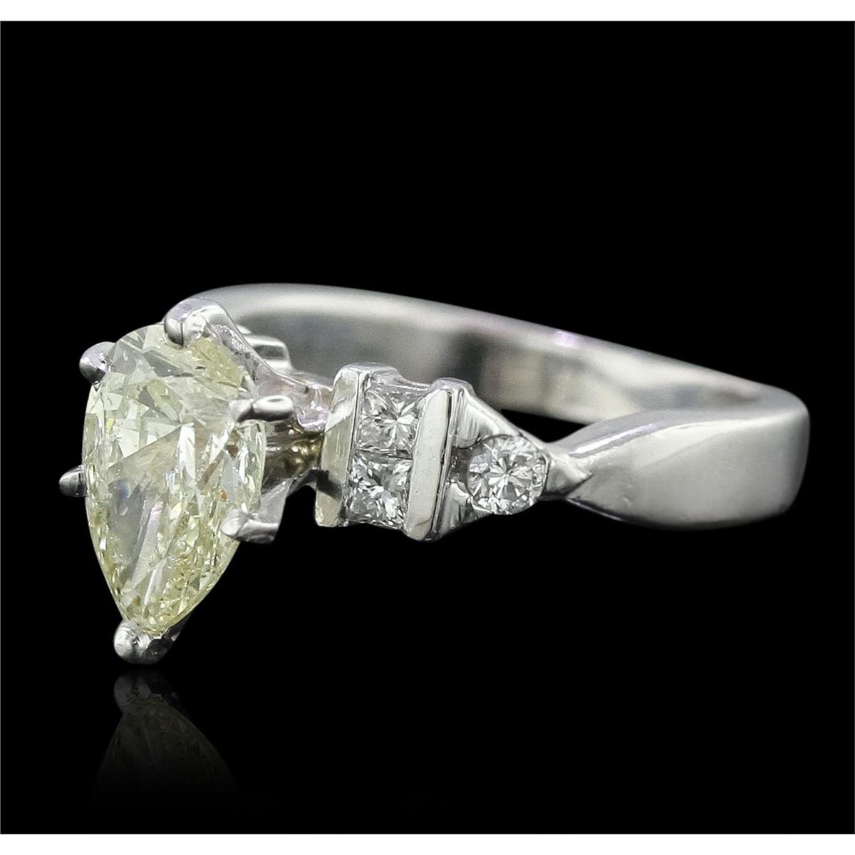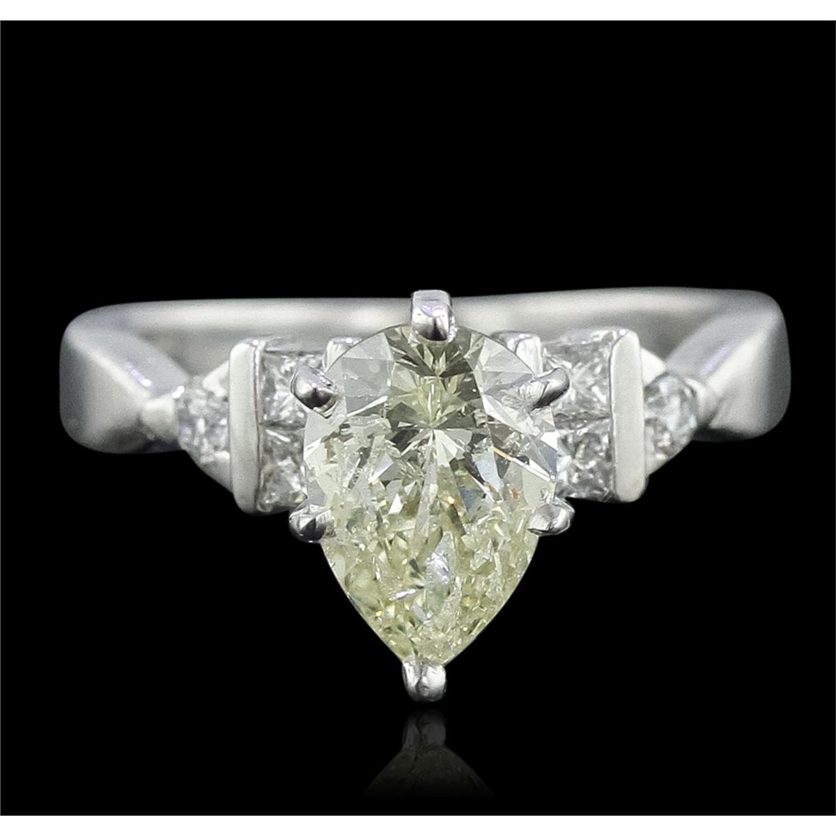 One electronically tested platinum Ladies combination cast & assembled engagement ring with a bright polish finish. Condition is new. Identified with markings of "PT 950". Containing: One prong set pear shaped cut diamond, measuring 10.00 x 6.41 x 4.04mm (depth est.) approximate weight of 1.53ct. Clarity: SI-2, Cut is Good. Two prong set round brilliant cut diamonds, measuring 2.30 - 2.30 x 1.38mm (depth est.) approximate total weight of 2 Stones = 0.09ct. Clarity: SI-1 to SI-2. Color: G - H, Cut is Good. Four channel set princess cut diamonds, measuring 1.90 x 1.90 x 1.43mm (depth est.) approximate total weight of 4 Stones = 0.17ct. Clarity: VS-2. Color: I - J, Cut is Very Good. Total Weight of Diamonds 1.79ct. Total Weight of Engagement Ring 6.40 grams. GGL Appraised at $13,795.00.