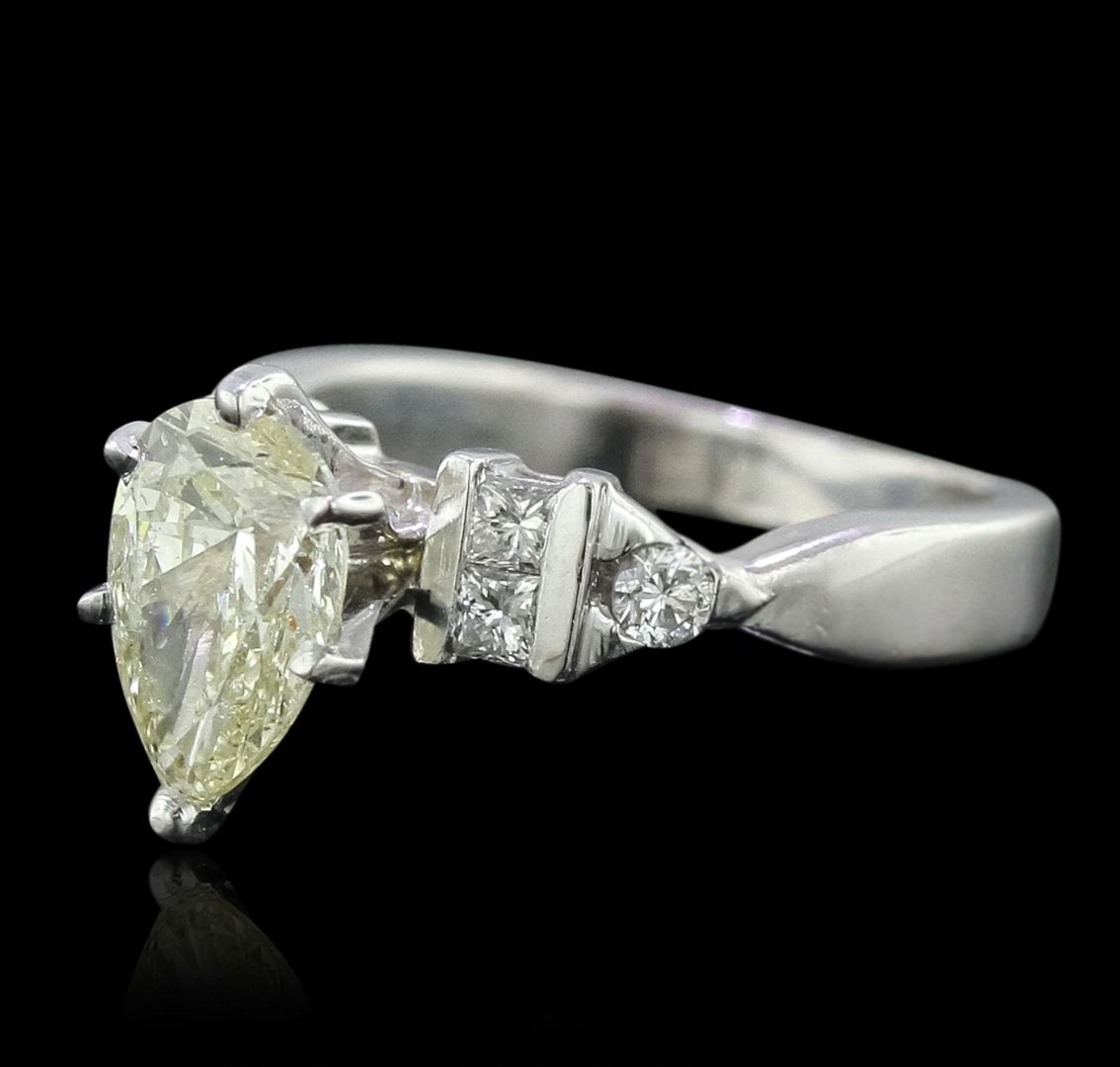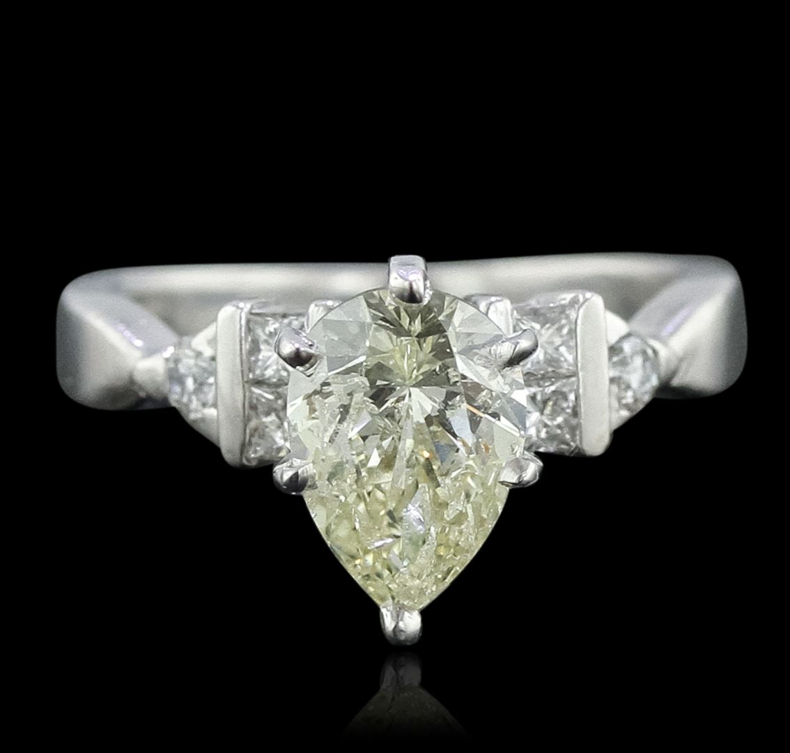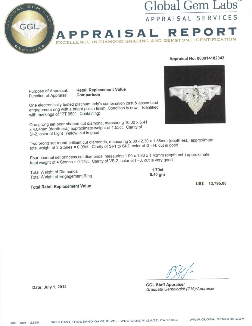 One electronically tested platinum Ladies combination cast & assembled engagement ring with a bright polish finish. Condition is new. Identified with markings of "PT 950". Containing: One prong set pear shaped cut diamond, measuring 10.00 x 6.41 x 4.04mm (depth est.) approximate weight of 1.53ct. Clarity: SI-2, Cut is Good. Two prong set round brilliant cut diamonds, measuring 2.30 - 2.30 x 1.38mm (depth est.) approximate total weight of 2 Stones = 0.09ct. Clarity: SI-1 to SI-2. Color: G - H, Cut is Good. Four channel set princess cut diamonds, measuring 1.90 x 1.90 x 1.43mm (depth est.) approximate total weight of 4 Stones = 0.17ct. Clarity: VS-2. Color: I - J, Cut is Very Good. Total Weight of Diamonds 1.79ct. Total Weight of Engagement Ring 6.40 grams. GGL Appraised at $13,795.00.