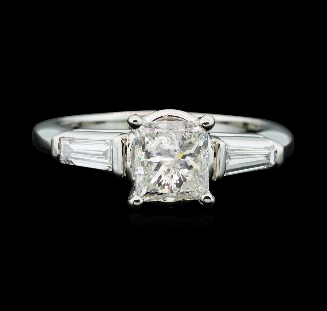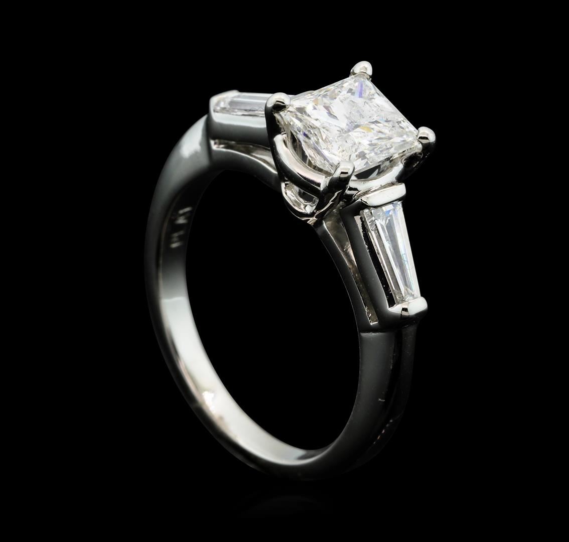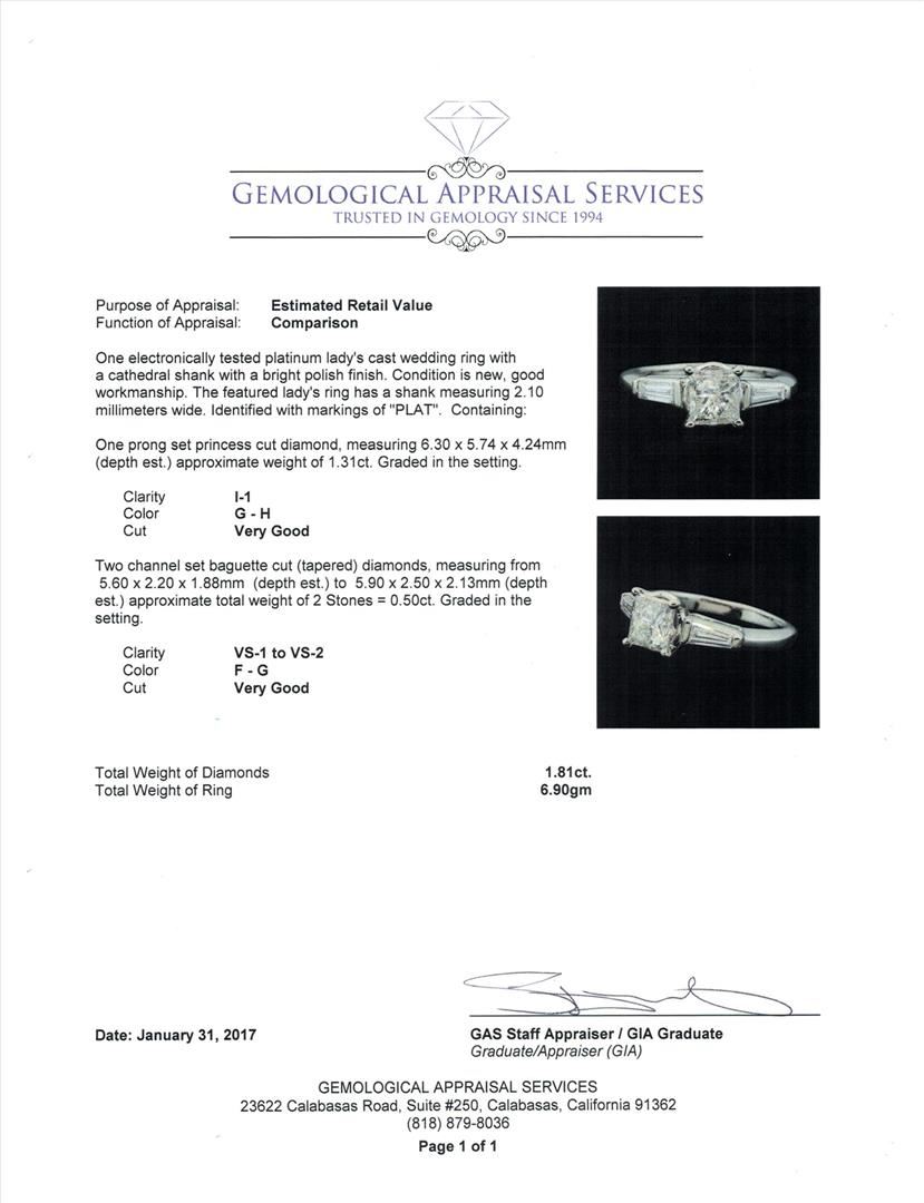 One electronically tested platinum lady's cast wedding ring with a cathedral shank with a bright polish finish. The featured lady's ring has a shank measuring 2.10 millimeters wide. Identified with markings of "PLAT". Condition is new, good workmanship. Containing: One prong set princess cut diamond, measuring 6.30 x 5.74 x 4.24mm (depth est.) approximate weight of 1.31ct. Graded in the setting. Clarity: I-1. Color: G - HCut Very Good Two channel set baguette cut (tapered) diamonds, measuring from 5.60 x 2.20 x 1.88mm (depth est.) to 5.90 x 2.50 x 2.13mm (depth est.) approximate total weight of 2 Stones = 0.50ct. Graded in the setting. Clarity: VS-1 to VS-2. Color: F - GCut Very Good. Total Weight of Diamonds 1.81ct. Total Weight of Ring 6.90gm. GAS Appraised.