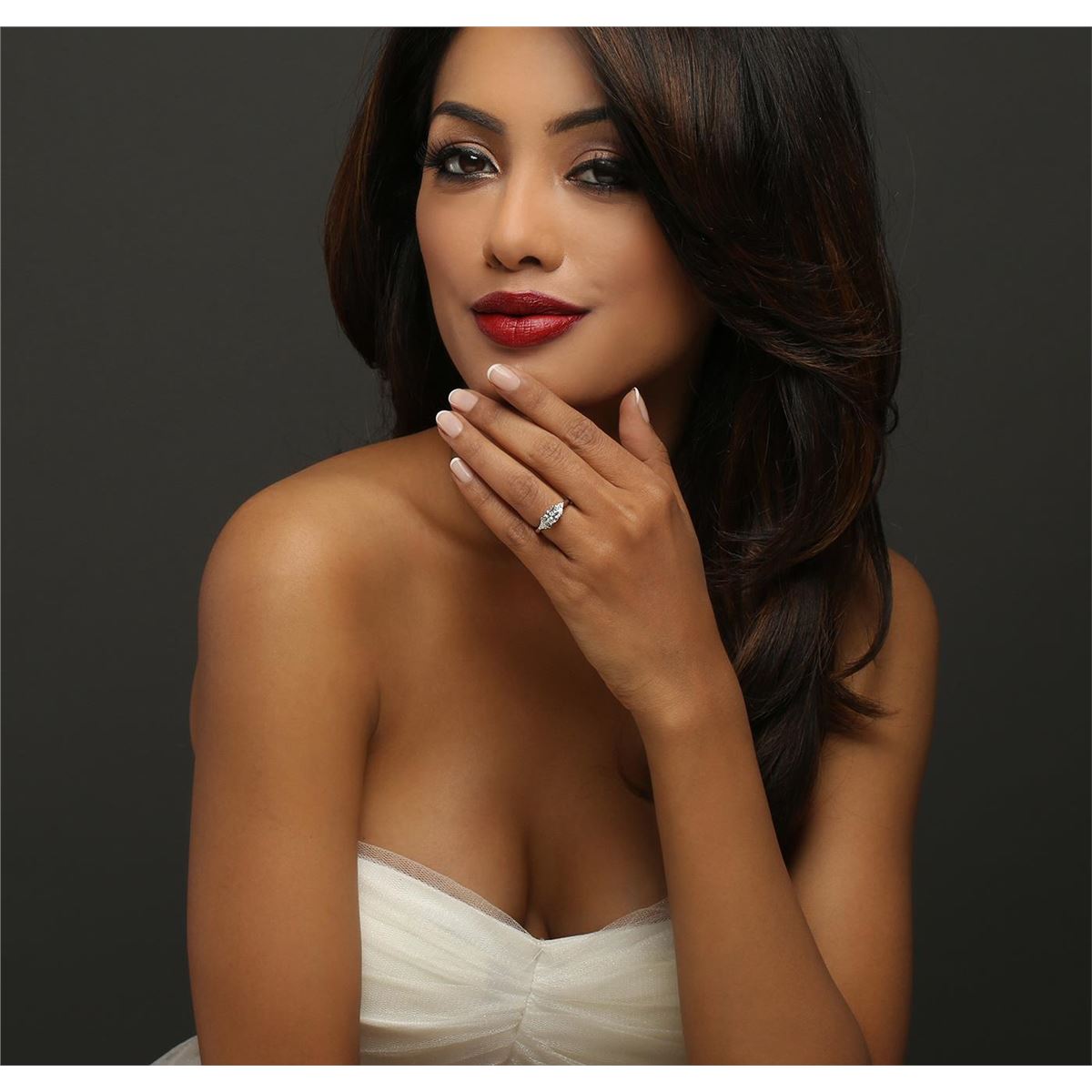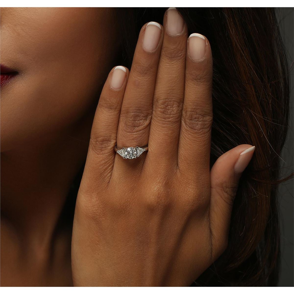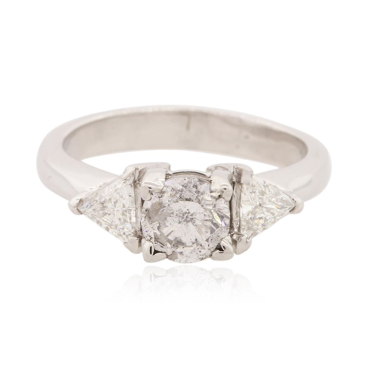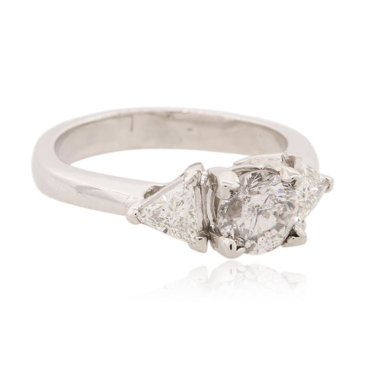One electronically tested platinum ladies combination cast & assembled engagement ring with a flat shank with a bright polish finish. Condition is new. Containing: One prong set round brilliant cut diamond, measuring 5.80 - 5.78 x 3.47mm (depth est.) approximate weight of 0.71ct. Clarity: I-2. Color: J, Cut is Good. Two prong set triangle brilliant cut diamonds, measuring 5.40 x 5.40 x 3.35mm (depth est.) approximate total weight of 2 Stones = 1.11ct. Clarity: SI-1 to SI-2. Color: J, Cut is Good. All diamonds are graded in the mounting, unless otherwise stated. Total Weight of Diamonds 1.82ct. Total Weight of Ring 6.60 grams. GGL Appraised at $11,425.00.