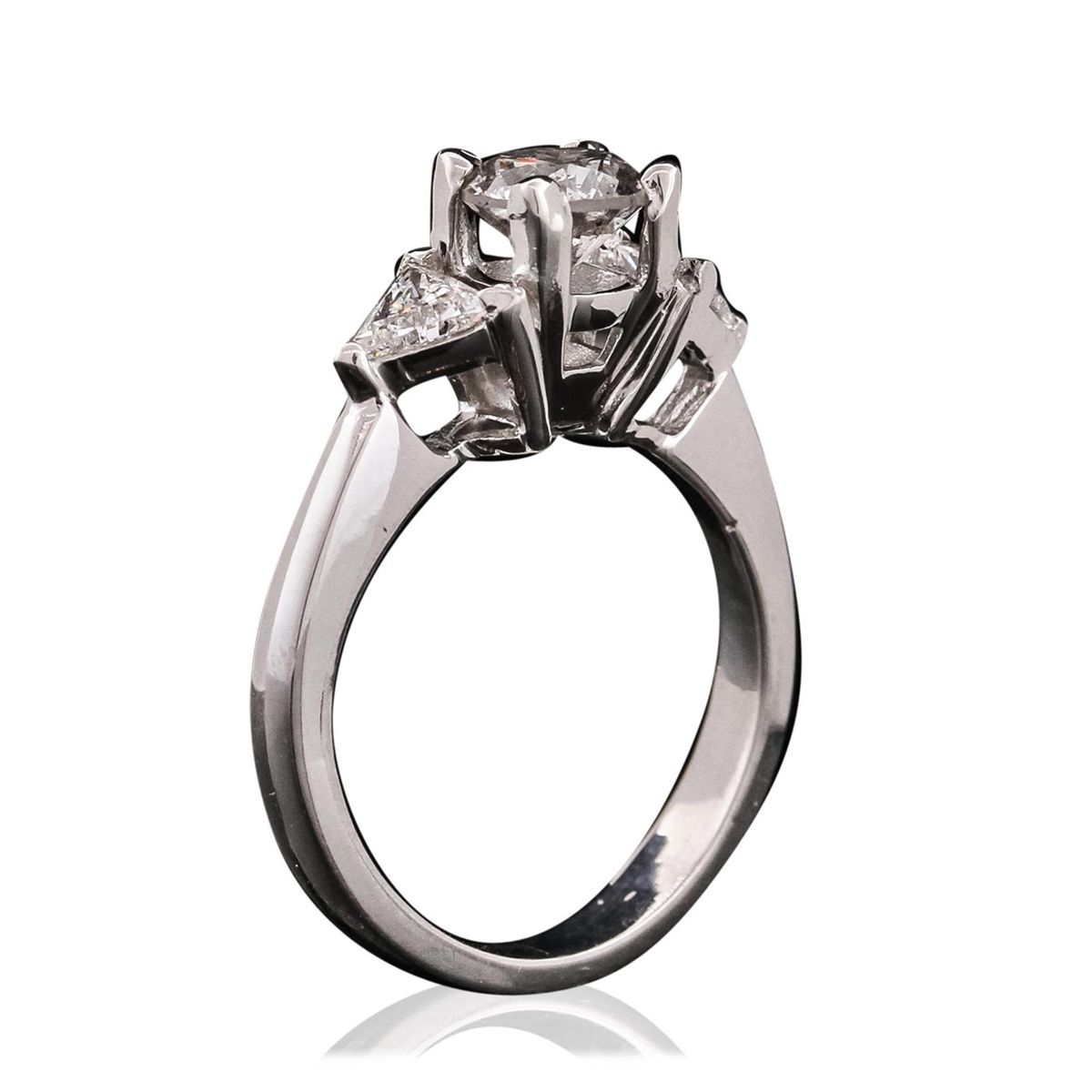 One electronically tested platinum ladies combination cast & assembled engagement ring with a flat shank with a bright polish finish. Condition is new. Containing: One prong set round brilliant cut diamond, measuring 5.80 - 5.78 x 3.47mm (depth est.) approximate weight of 0.71ct. Clarity: I-2. Color: J, Cut is Good. Two prong set triangle brilliant cut diamonds, measuring 5.40 x 5.40 x 3.35mm (depth est.) approximate total weight of 2 Stones = 1.11ct. Clarity: SI-1 to SI-2. Color: J, Cut is Good. All diamonds are graded in the mounting, unless otherwise stated. Total Weight of Diamonds 1.82ct. Total Weight of Ring 6.60 grams. GGL Appraised at $11,425.00.