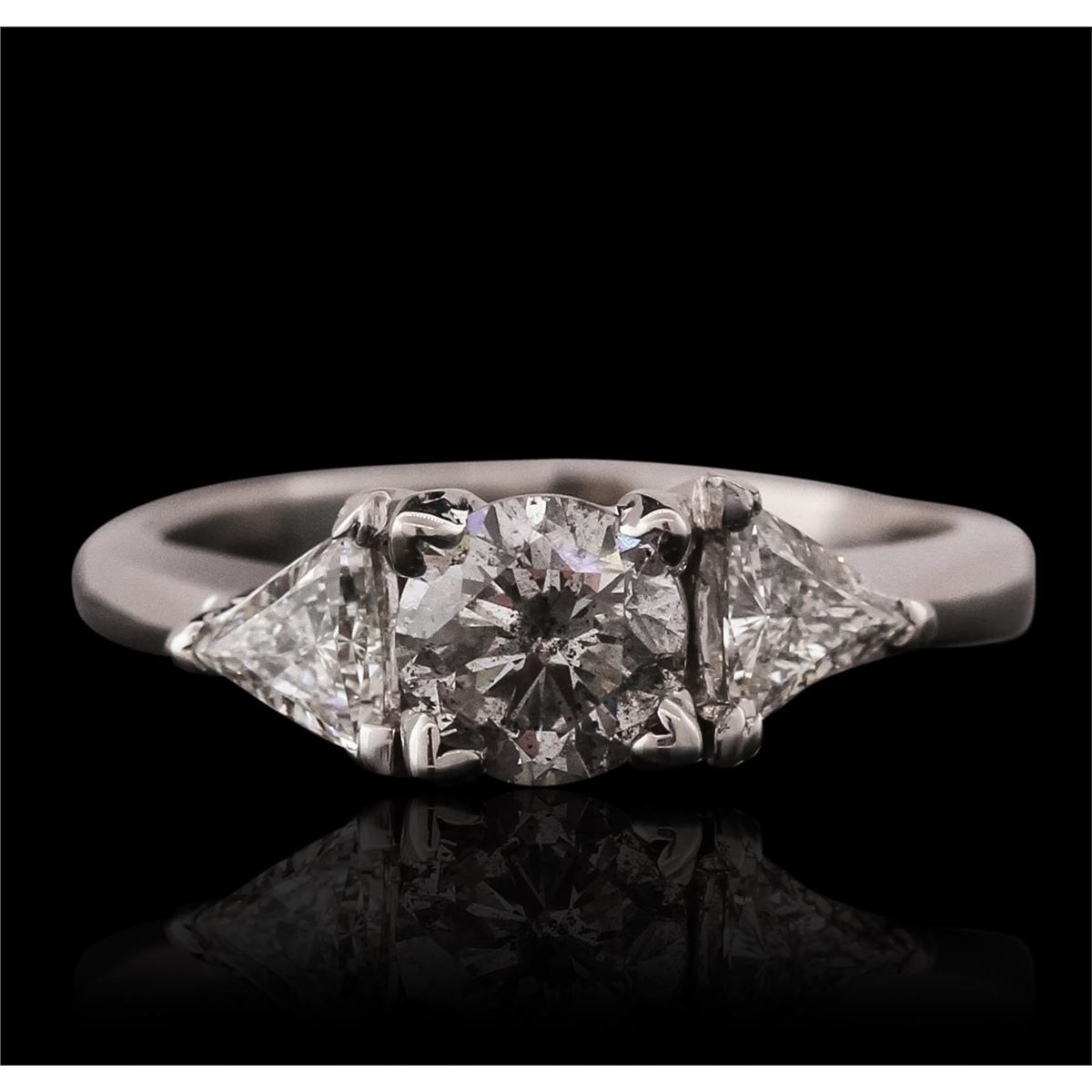 One electronically tested platinum ladies combination cast & assembled engagement ring with a flat shank with a bright polish finish. Condition is new. Containing: One prong set round brilliant cut diamond, measuring 5.80 - 5.78 x 3.47mm (depth est.) approximate weight of 0.71ct. Clarity: I-2. Color: J, Cut is Good. Two prong set triangle brilliant cut diamonds, measuring 5.40 x 5.40 x 3.35mm (depth est.) approximate total weight of 2 Stones = 1.11ct. Clarity: SI-1 to SI-2. Color: J, Cut is Good. All diamonds are graded in the mounting, unless otherwise stated. Total Weight of Diamonds 1.82ct. Total Weight of Ring 6.60 grams. GGL Appraised at $11,425.00.