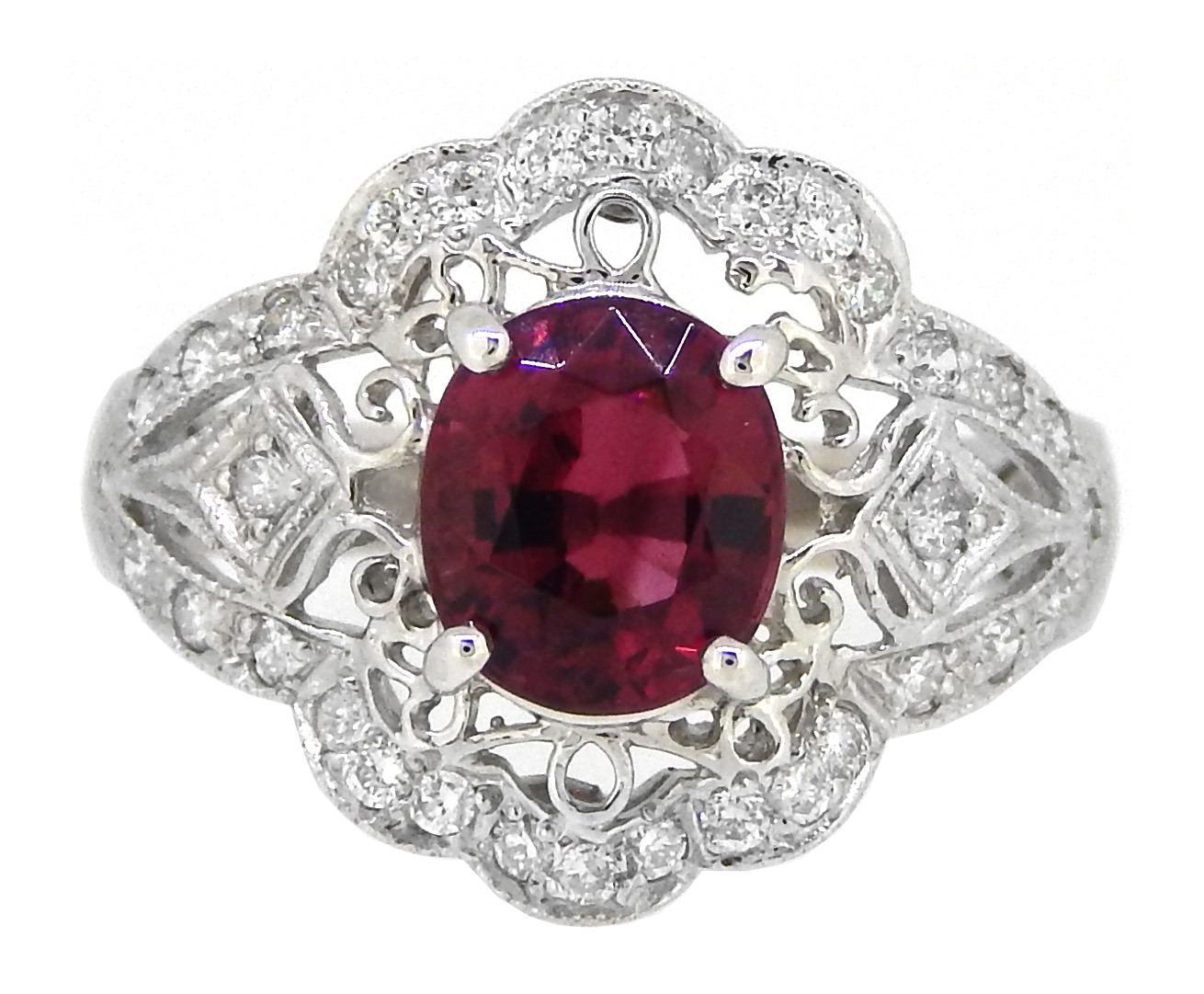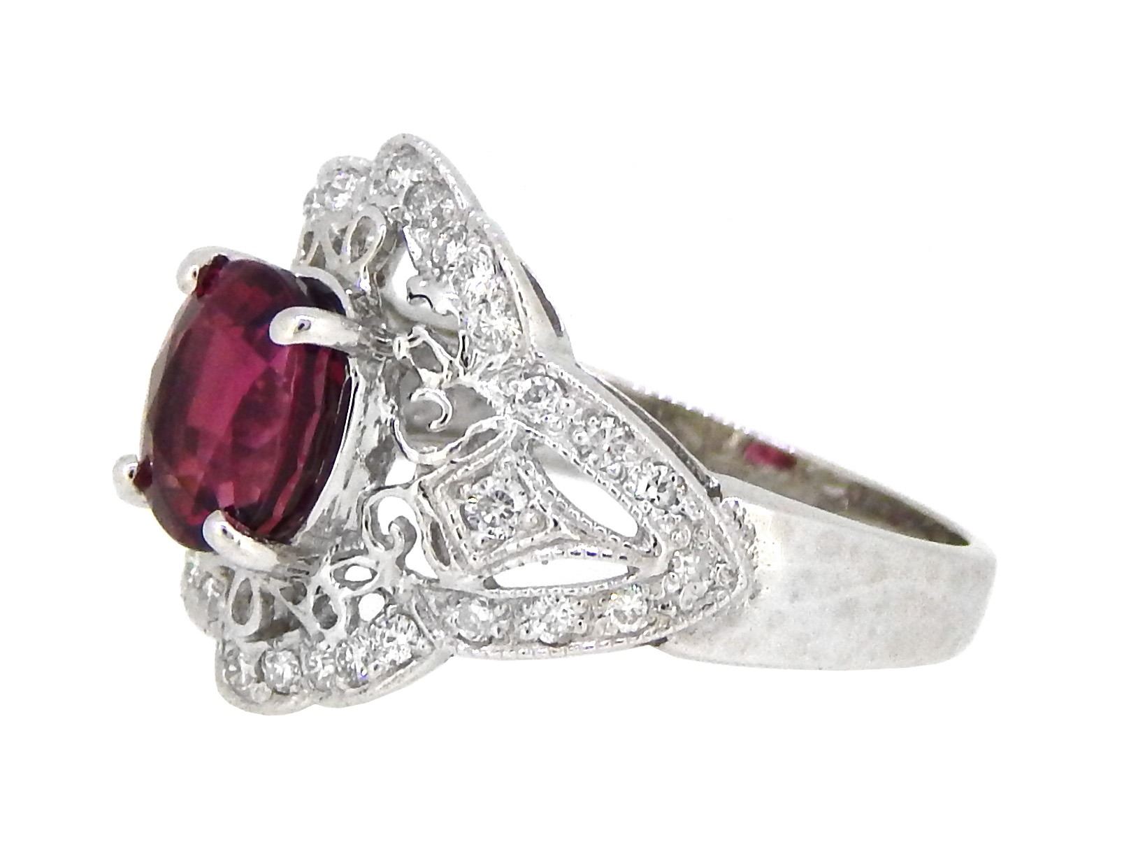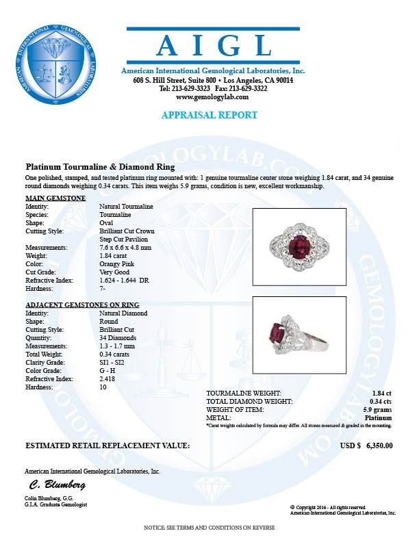 One Platinum 1.84ct Tourmaline and Diamond Ring. (1) Tourmaline with a total weight of 1.84cts. (34) diamonds with a total weight of 0.34cts. Total weight of the ring is 5.9 grams.