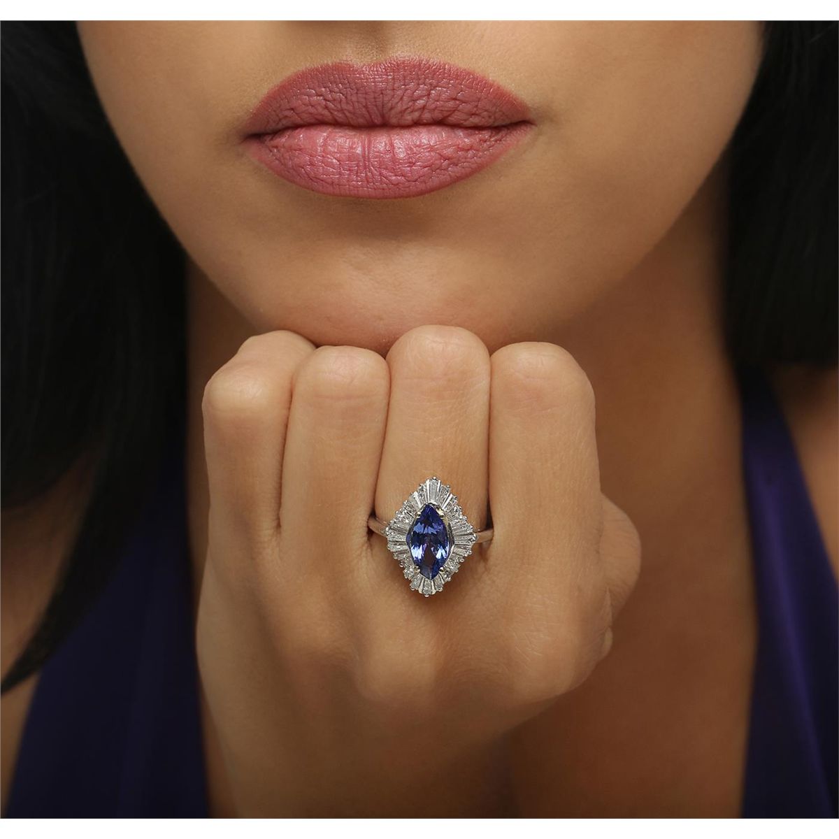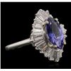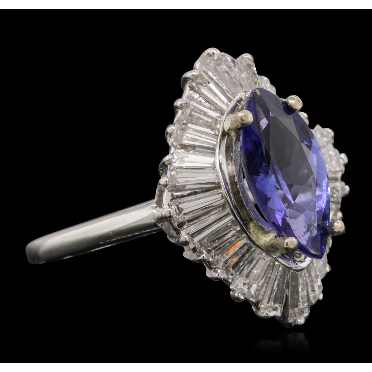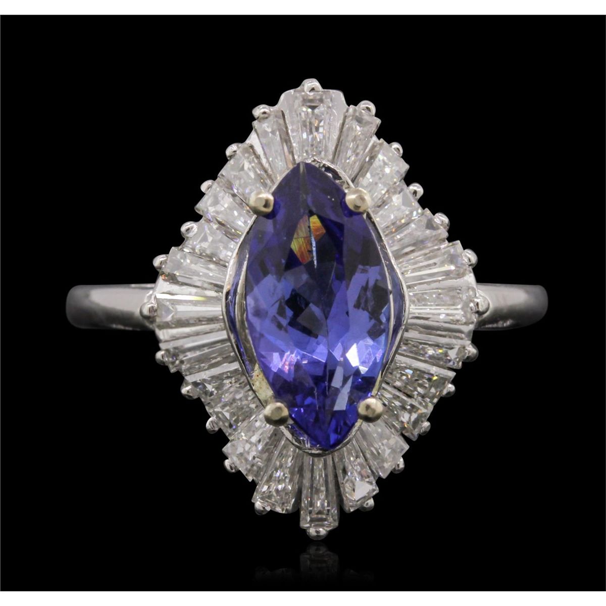 One electronically tested platinum ladies cast tanzanite and diamond ring with a bright polish finish. Condition is new, good workmanship. The featured tanzanite is set within a diamond bezel, completed by a one and one-half millimeter wide band. Identified with markings of "10%. IRID PLAT". Containing: One prong set marquise mixed cut natural tanzanite, measuring 12.20 x 6.00 x 4.00mm, approximate weight of 1.86ct., clarity is eye clean, type I, medium dark, very slightly grayish, violetish blue color, (GIA vB 6/3), cut is good. Transmitting light with no distortion, transparent. Graded in the setting. Tanzanite is a very rare gemstone that is only found in the country of Tanzania. Originally discovered in 1967. Tiffany & Company, named the stone Tanzanite. It is found in the Usumburu Mountains that border the Umba Valley of northern Tanzania. Tanzanite occurs in gray, brown, violet, blue, reddish-purple, & green. The gem is interesting because of its exceptional pleochroism. Rotated in different directions a tanzanite will exhibit multiple changes of color. Tanzanite has a low tolerance to ultrasonic cleaning, and should not be cleaned using this method. Twenty-Four prong set baguette cut (tapered) diamonds, measuring from 3.30 x 1.30 x 0.91mm (depth est.) to 3.90 x 1.60 x 1.12mm (depth est.) approximate total weight of 24 Stones = 1.26ct. Graded in the setting. Clarity: VS-1 to SI-1. Color: G - I. Total Weight of Colored Stones 1.86ct. Total Weight of Diamonds 1.26ct. Total Weight of Ring 7.73 grams. AIG Appraised at $11,155.00.