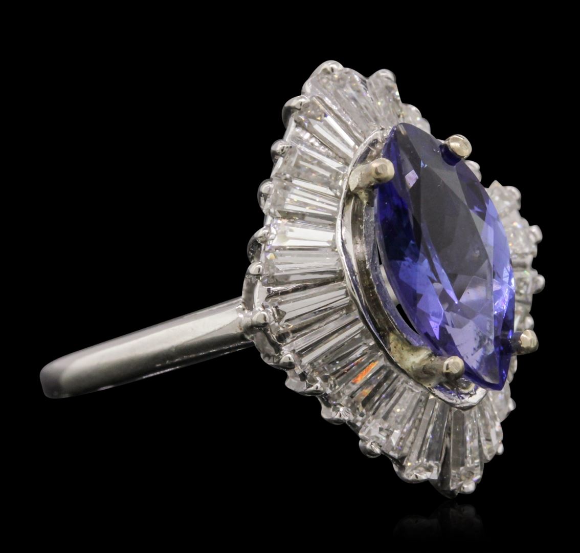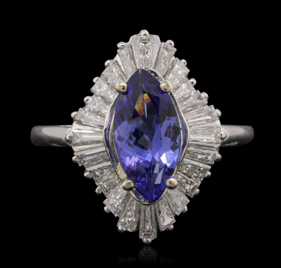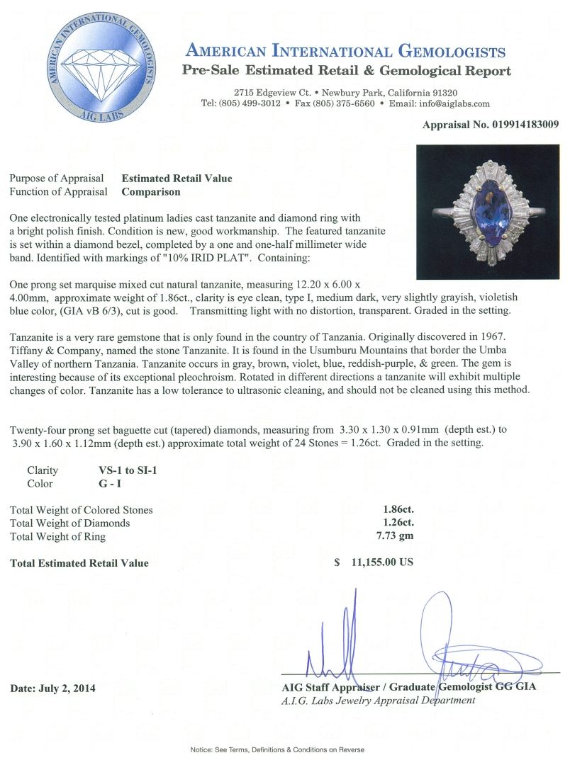 One electronically tested platinum ladies cast tanzanite and diamond ring with a bright polish finish. Condition is new, good workmanship. The featured tanzanite is set within a diamond bezel, completed by a one and one-half millimeter wide band. Identified with markings of "10%. IRID PLAT". Containing: One prong set marquise mixed cut natural tanzanite, measuring 12.20 x 6.00 x 4.00mm, approximate weight of 1.86ct., clarity is eye clean, type I, medium dark, very slightly grayish, violetish blue color, (GIA vB 6/3), cut is good. Transmitting light with no distortion, transparent. Graded in the setting. Tanzanite is a very rare gemstone that is only found in the country of Tanzania. Originally discovered in 1967. Tiffany & Company, named the stone Tanzanite. It is found in the Usumburu Mountains that border the Umba Valley of northern Tanzania. Tanzanite occurs in gray, brown, violet, blue, reddish-purple, & green. The gem is interesting because of its exceptional pleochroism. Rotated in different directions a tanzanite will exhibit multiple changes of color. Tanzanite has a low tolerance to ultrasonic cleaning, and should not be cleaned using this method. Twenty-Four prong set baguette cut (tapered) diamonds, measuring from 3.30 x 1.30 x 0.91mm (depth est.) to 3.90 x 1.60 x 1.12mm (depth est.) approximate total weight of 24 Stones = 1.26ct. Graded in the setting. Clarity: VS-1 to SI-1. Color: G - I. Total Weight of Colored Stones 1.86ct. Total Weight of Diamonds 1.26ct. Total Weight of Ring 7.73 grams. AIG Appraised at $11,155.00.