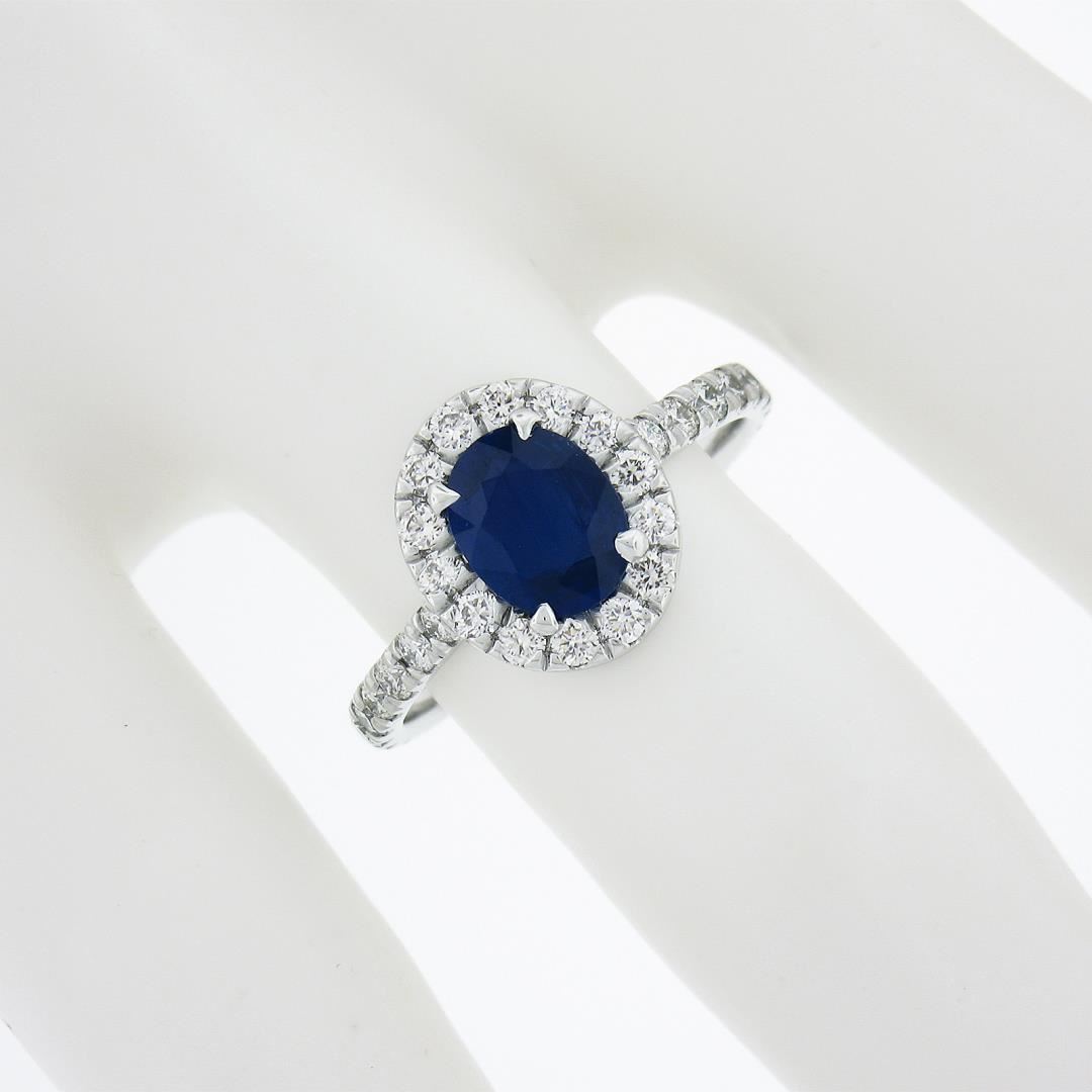 A new solid platinum ring, with 1 GIA graded oval cut natural sapphire (1.10ct), and 38 round cut natrual diamonds (F/G - VS1/VS2 ; 0.80ctw). The ring is size 7.5, weighs a total of 3.65 grams, and measures 11.4mm wide. Comes with all original relevant certifications.