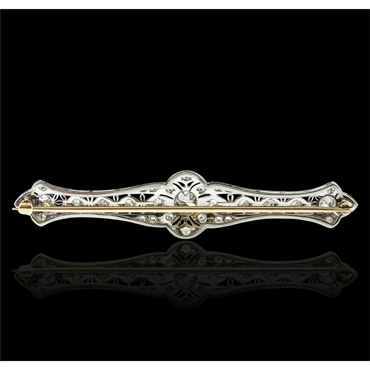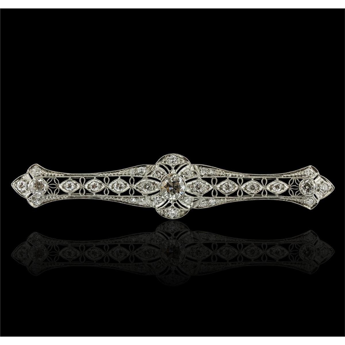 One electronically tested platinum ladies cast & assembled diamond brooch. The brooch is completed by a 14KT yellow gold horizontally placed pin. Bright polish finish with milgrain detailing throughout. Area measurements 2.75 x 0.55 inches. The brooch is reminiscent of the jewelry designs from the Art Deco Period. The Paris Exposition of Decorative Arts and Modern Manufacturers in 1925 gave the movement its name. The Art Deco Period is characterized with jewelry designs composed of bold geometric designs, & cubism. Condition is good. Containing: One bezel set Old European cut diamond, measuring 5.50 - 5.40 x 3.00mm (depth est.) approximate weight of 0.64ct. Cutting style circa late 19th century. Graded in the setting. Clarity: SI-1. Color: I Two bezel set Old European cut diamonds, measuring 3.60 - 3.50 x 2.00mm (depth est.) approximate total weight of 2 Stones = 0.35ct. Cutting style circa early 20th century. Graded in the setting. Clarity: VS-2 to SI-1. Color: H - I Sixteen bead set round brilliant cut diamonds, measuring 2.30 - 2.00 x 1.29mm (depth est.) approximate total weight of 16 Stones = 0.68ct. Graded in the setting. Clarity: VS-2 to SI-1. Color: G - I Twelve bead set round brilliant cut diamonds, measuring 1.80 - 1.60 x 1.02mm (depth est.) approximate total weight of 12 Stones = 0.25ct. Graded in the setting. Clarity: SI-1 to I-1. Color: G - I. Total Weight of Diamonds 1.92ct. Total Weight of Brooch 7.51 grams. AIG Appraised at $10,395.00.