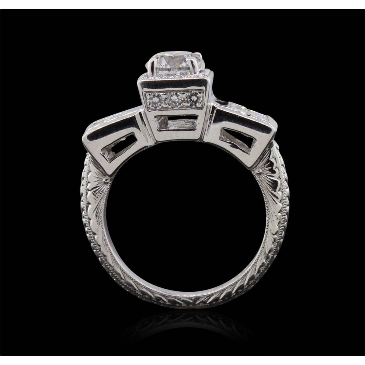 One electronically tested platinum Ladies combination cast & assembled engagement ring with a engraved finish. Identified with markings of "PLAT". Condition is excellent. Containing: One prong set round brilliant cut diamond, measuring 6.20 - 6.20 x 4.00mm (depth est.) approximate weight of 0.96ct. Clarity of I-2, Color of J, Cut is Good. Six bead set round brilliant cut diamonds, measuring 1.60 - 1.60 x 0.00mm (depth est.) approximate total weight of 6 Stones = 0.10ct. Clarity of SI-1, Color of G - H, Cut is Good. Eight invisible set princess cut diamonds, measuring 2.20 x 2.20 x 1.65mm (depth est.) approximate total weight of 8 Stones = 0.90ct. Clarity of SI-1 to SI-2, Color of J - K. Total Weight of Diamonds 1.96ct. Total Weight of Ring 11.70gm. GGL Appraised at $17,725.00.
