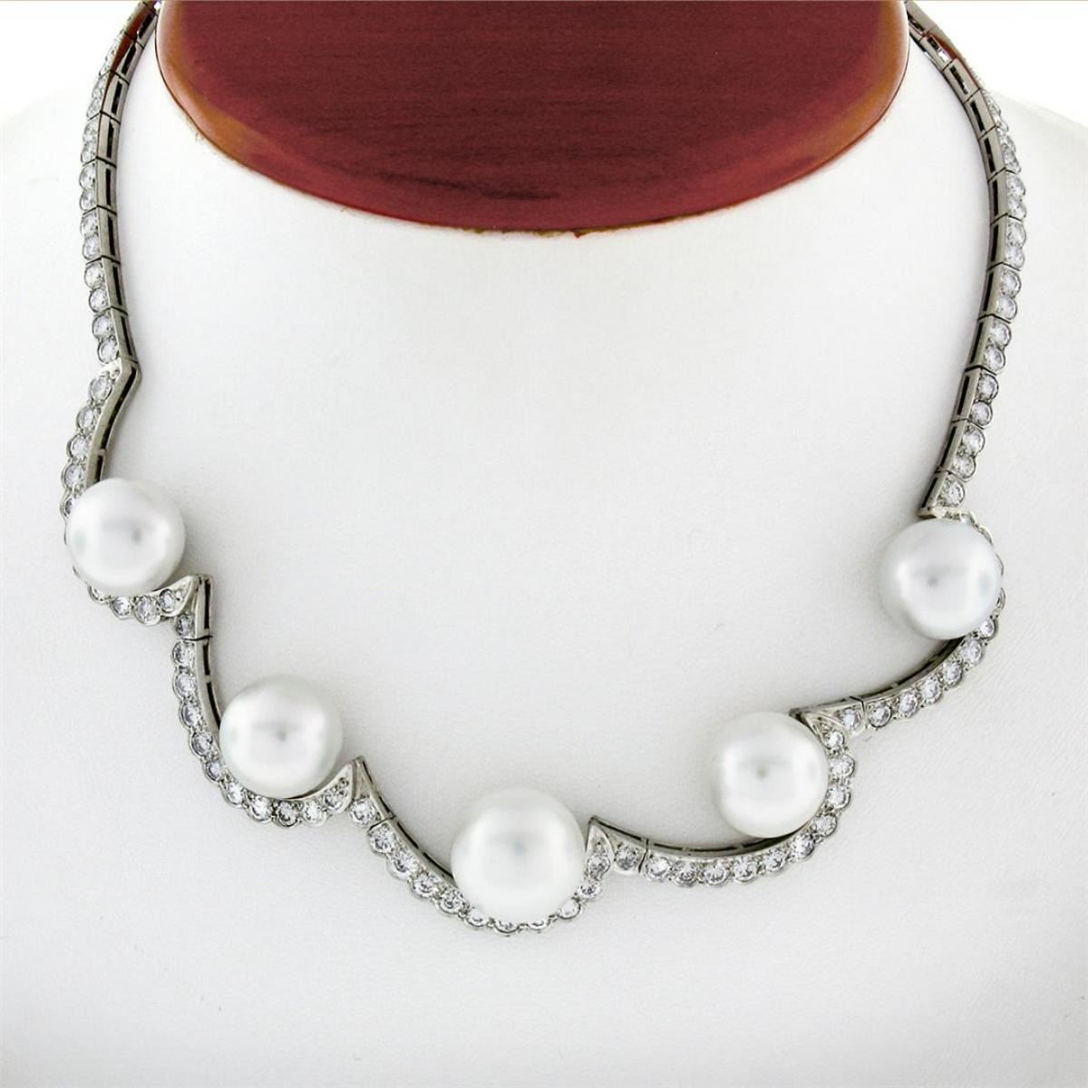 One Vintage Platinum 10.25ctw Diamond & Floating South Sea Pearl Statement Necklace. Item Details - Material: Solid Platinum, Weight: 58.76 Grams, Stone(s): (132) Natural Genuine Diamonds - Round Brilliant and Transitional Cut - Prong Set - VS1/VS2 Clarity - F/G Color - 10.25ctw (approx.), (5) Genuine South Sea Pearls - Round and Near Round Shape - Fine Blue White Color w/ Very Good Luster, Clean Surface, and Greenish-Pink Overtones - 12.70mm to 13.85mm (approx.), Chain Type: Prong Set Diamond Scalloped Link, Chain Length: Fits up to 15 Inches (can also be worn as a choker), Clasp: Secured Box Clasp w/ Fold Under Safety Latch, Width: The links Graduate from 3.3mm (near the clasp) to 4.0mm (by the center pearl), Height: Sits 14.0mm Above The Body (at the center pearl), Condition: Vintage estate statement piece. Excellent, all original condition and ready to wear.