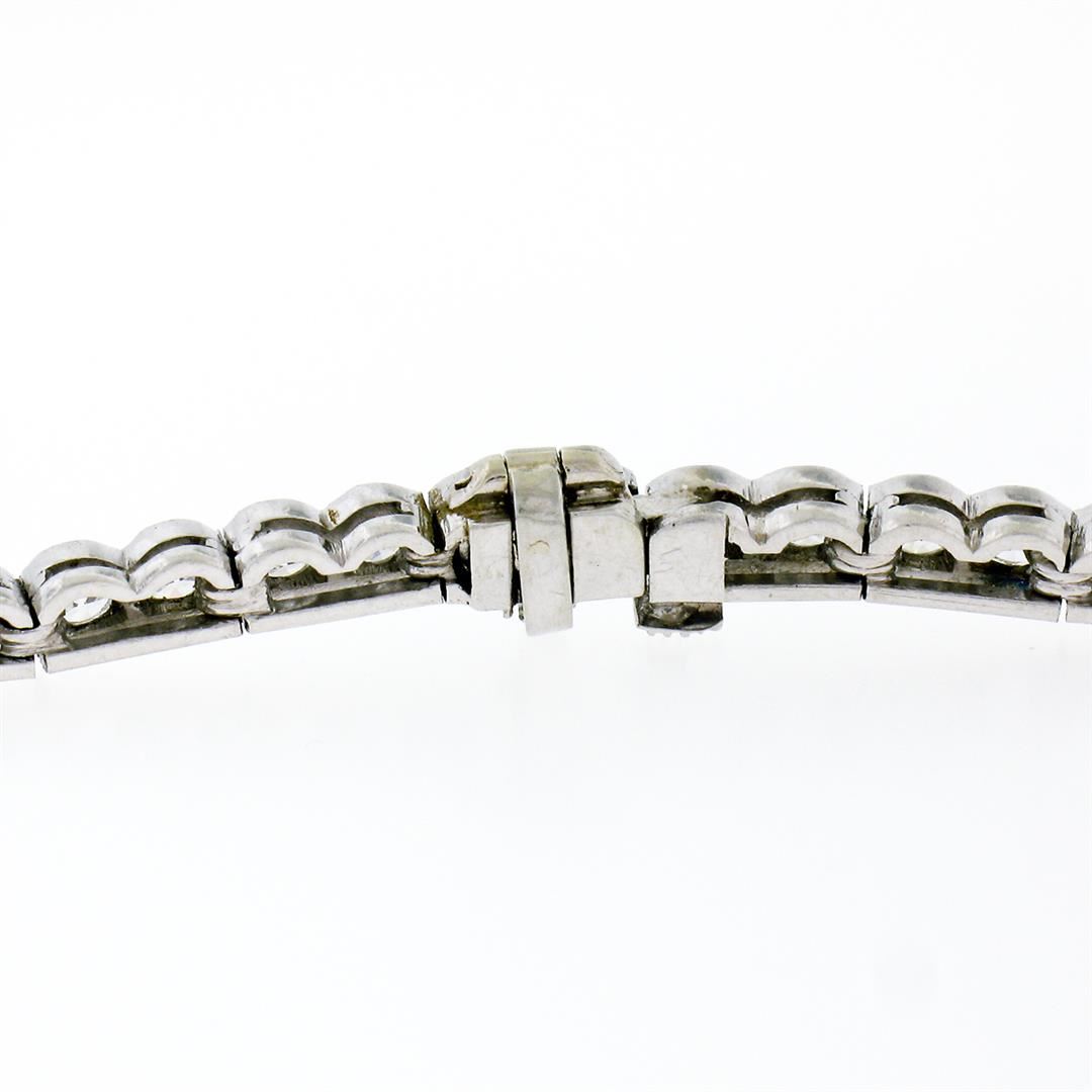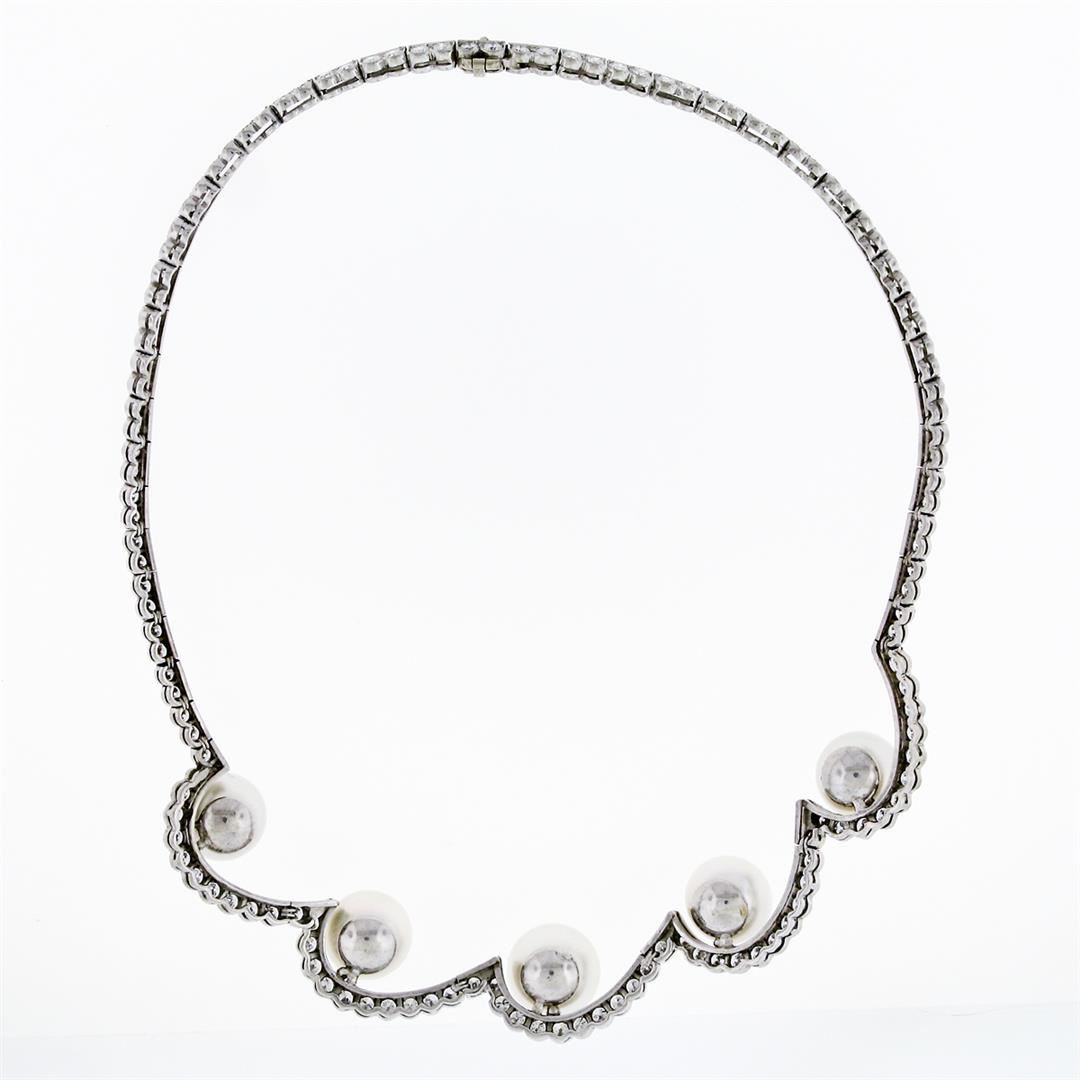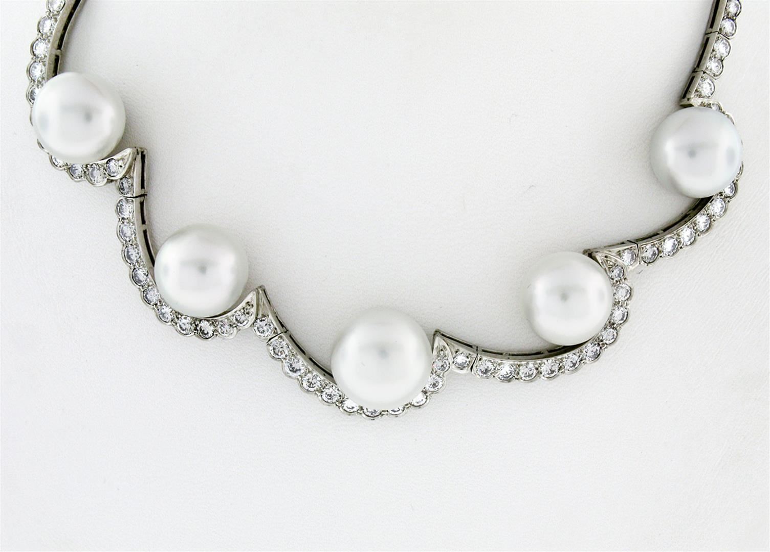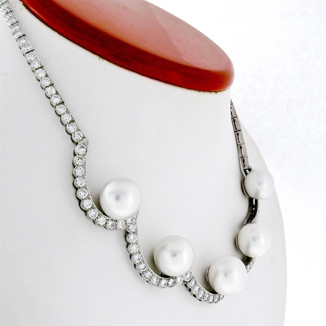 One Vintage Platinum 10.25ctw Diamond & Floating South Sea Pearl Statement Necklace. Item Details - Material: Solid Platinum, Weight: 58.76 Grams, Stone(s): (132) Natural Genuine Diamonds - Round Brilliant and Transitional Cut - Prong Set - VS1/VS2 Clarity - F/G Color - 10.25ctw (approx.), (5) Genuine South Sea Pearls - Round and Near Round Shape - Fine Blue White Color w/ Very Good Luster, Clean Surface, and Greenish-Pink Overtones - 12.70mm to 13.85mm (approx.), Chain Type: Prong Set Diamond Scalloped Link, Chain Length: Fits up to 15 Inches (can also be worn as a choker), Clasp: Secured Box Clasp w/ Fold Under Safety Latch, Width: The links Graduate from 3.3mm (near the clasp) to 4.0mm (by the center pearl), Height: Sits 14.0mm Above The Body (at the center pearl), Condition: Vintage estate statement piece. Excellent, all original condition and ready to wear.