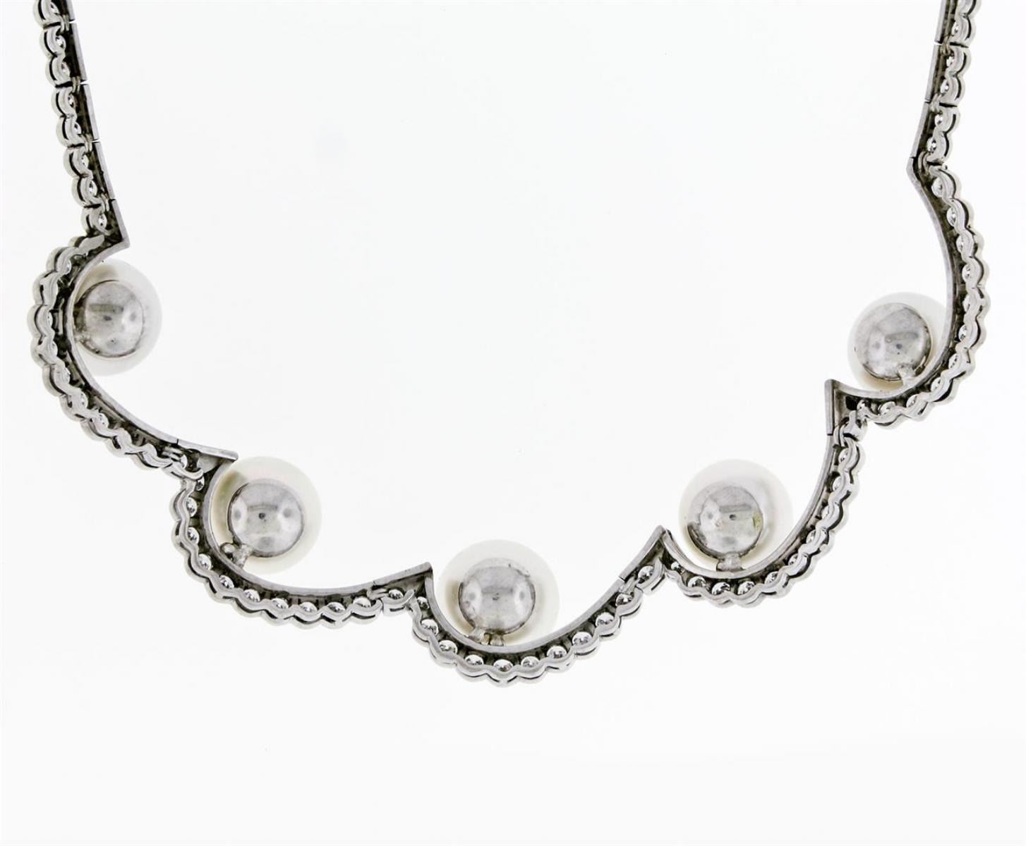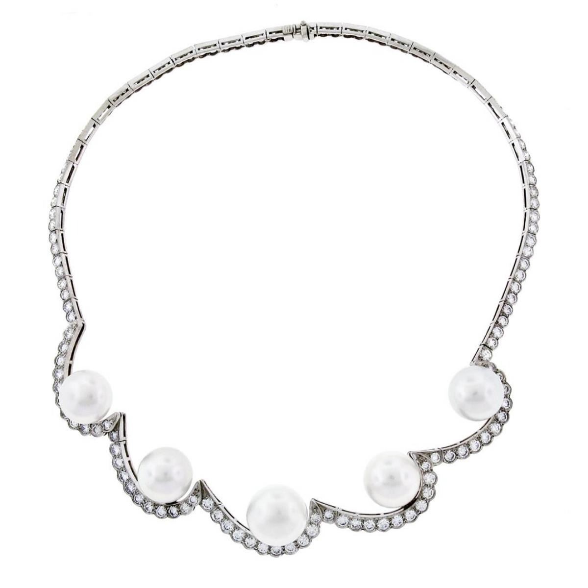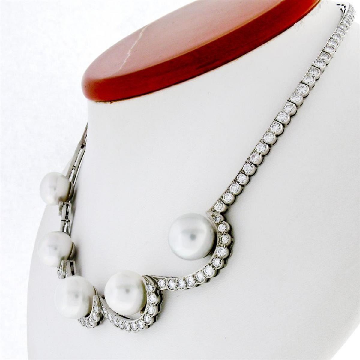 One Vintage Platinum 10.25ctw Diamond & Floating South Sea Pearl Statement Necklace. Item Details - Material: Solid Platinum, Weight: 58.76 Grams, Stone(s): (132) Natural Genuine Diamonds - Round Brilliant and Transitional Cut - Prong Set - VS1/VS2 Clarity - F/G Color - 10.25ctw (approx.), (5) Genuine South Sea Pearls - Round and Near Round Shape - Fine Blue White Color w/ Very Good Luster, Clean Surface, and Greenish-Pink Overtones - 12.70mm to 13.85mm (approx.), Chain Type: Prong Set Diamond Scalloped Link, Chain Length: Fits up to 15 Inches (can also be worn as a choker), Clasp: Secured Box Clasp w/ Fold Under Safety Latch, Width: The links Graduate from 3.3mm (near the clasp) to 4.0mm (by the center pearl), Height: Sits 14.0mm Above The Body (at the center pearl), Condition: Vintage estate statement piece. Excellent, all original condition and ready to wear.