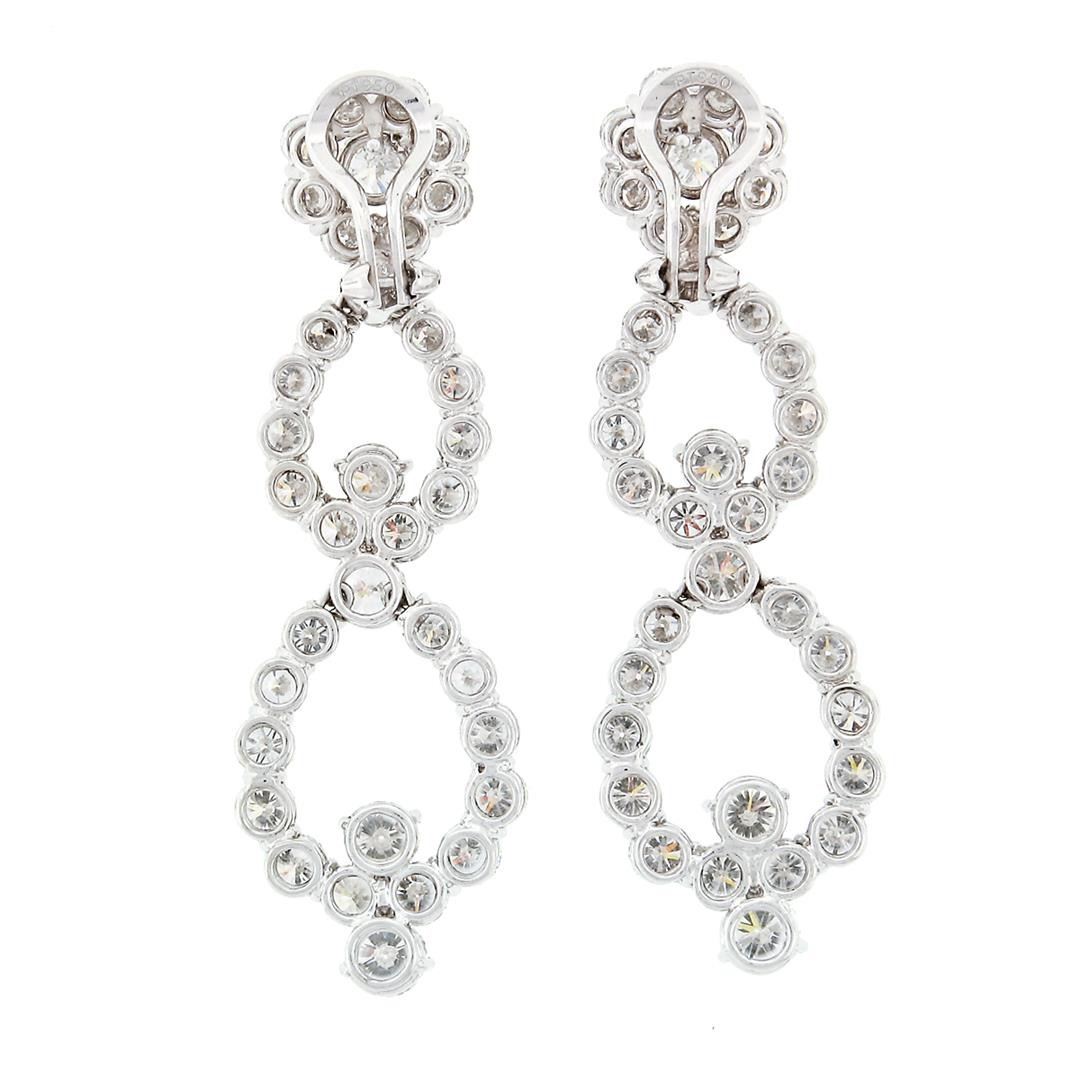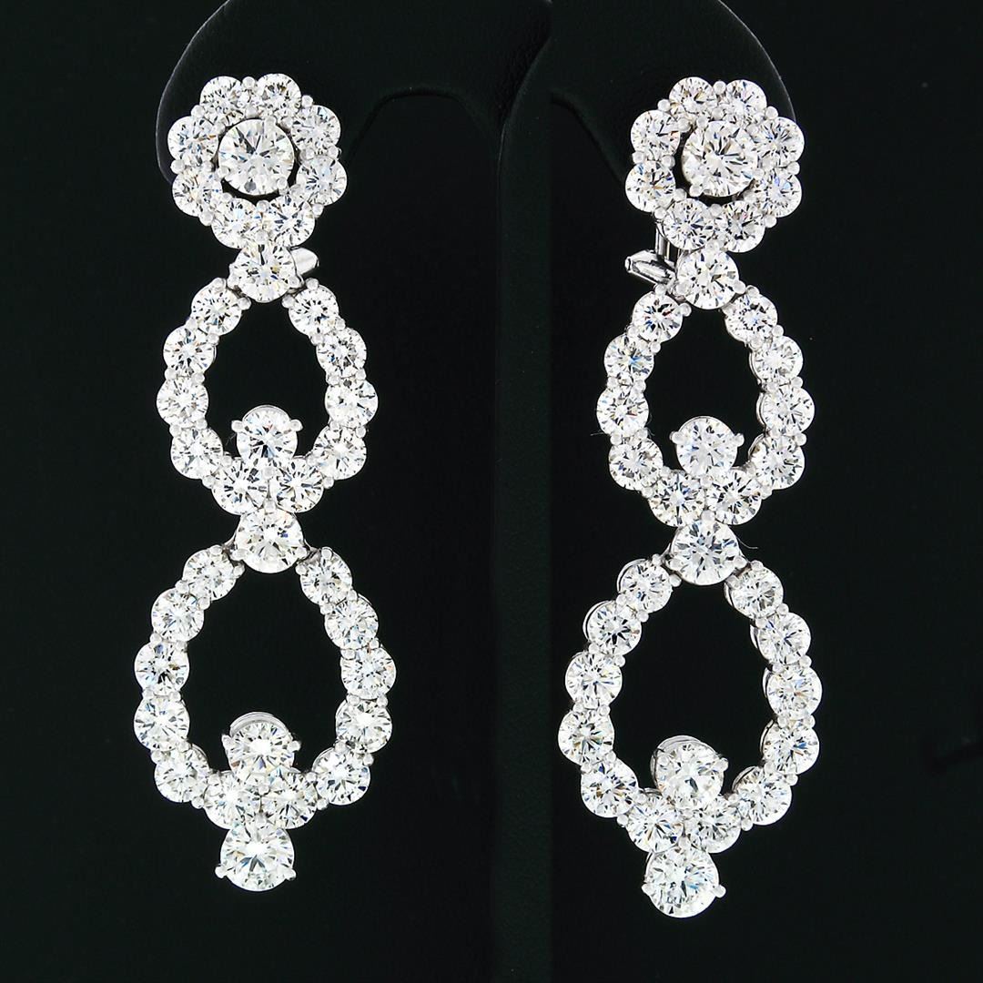 A pair of solid platinum long dangle drop earrings, with 72 round brilliant cut natural diamonds (G/H - VVS2/VS1; 14.92ctw). The earrings measure approximately 55.5x17.7mm and weigh a total of 21.47 grams.
