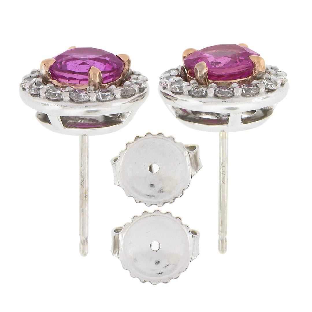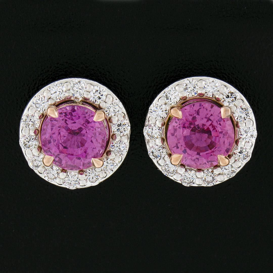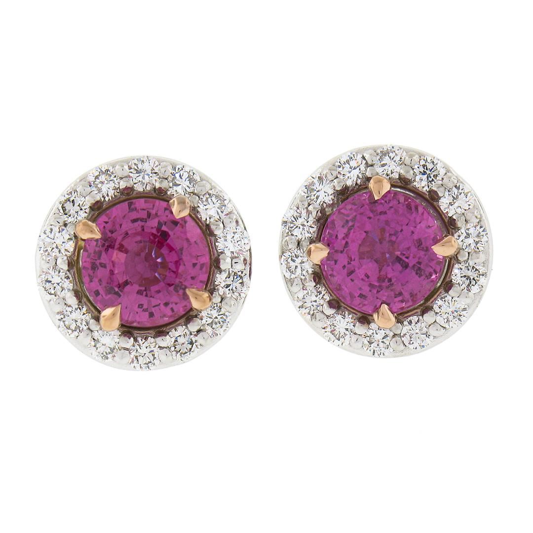 A new solid platinum & 14k rose gold stud earrings, with 2 GIA graded round cut pink sapphire (2.47ctw ), surrounded with a halo of round cut natural diamonds (G/H - VS1/VS2 ; 0.59ctw). The earrings measure approximately 10.5mm in diameter and weigh a total of 6.44 grams. Comes with all original relevant certifications.