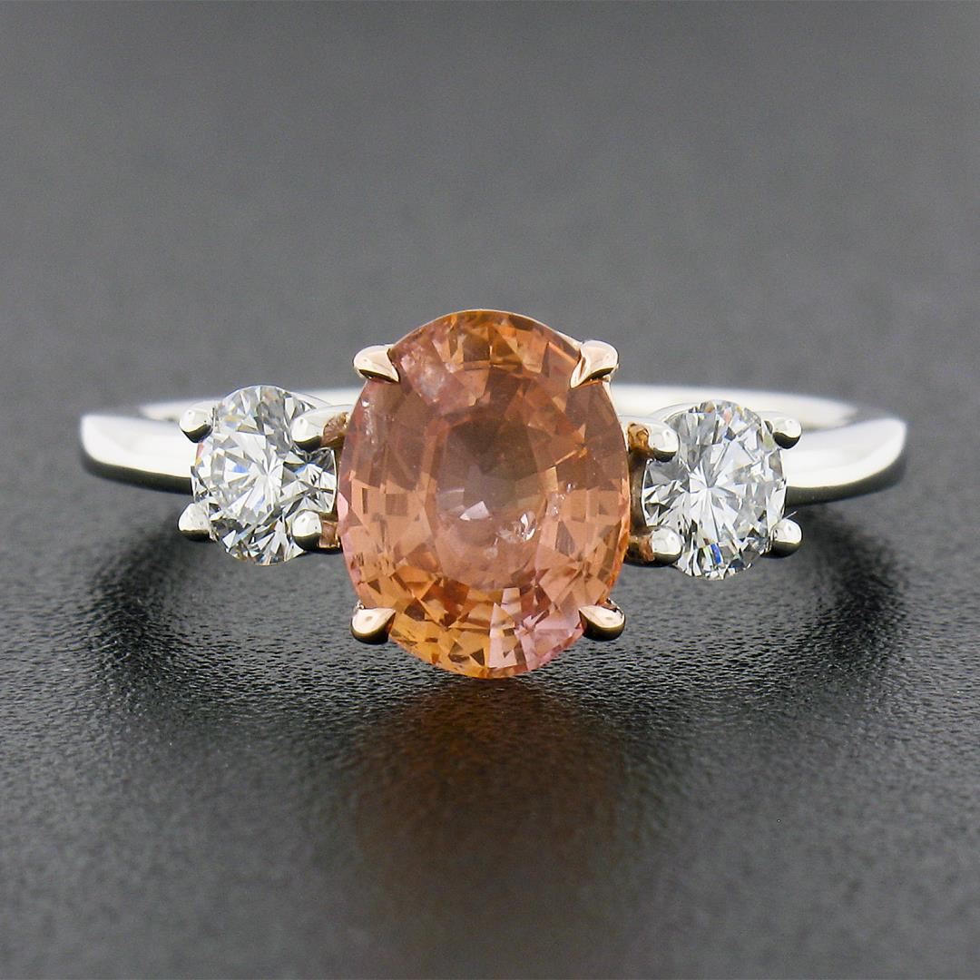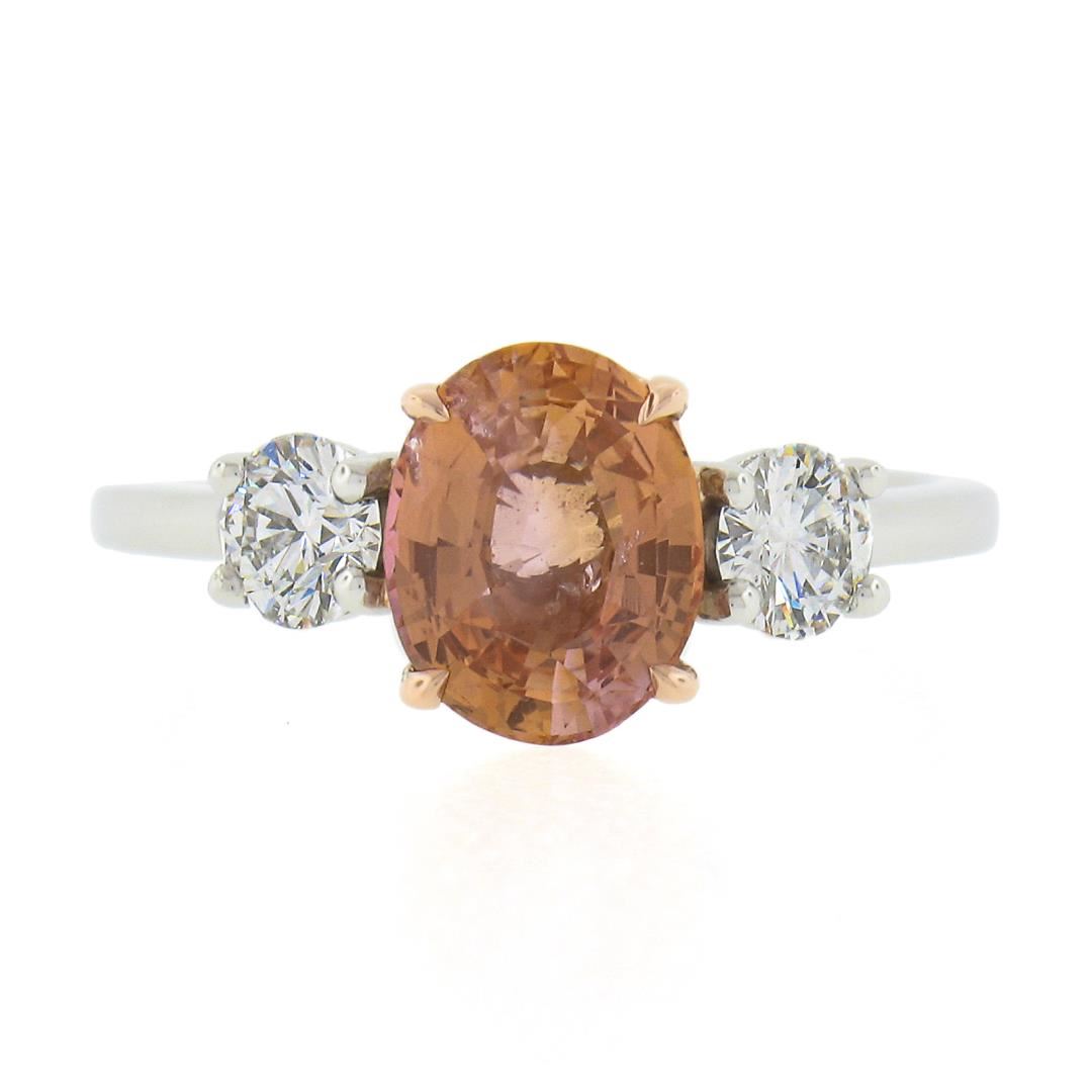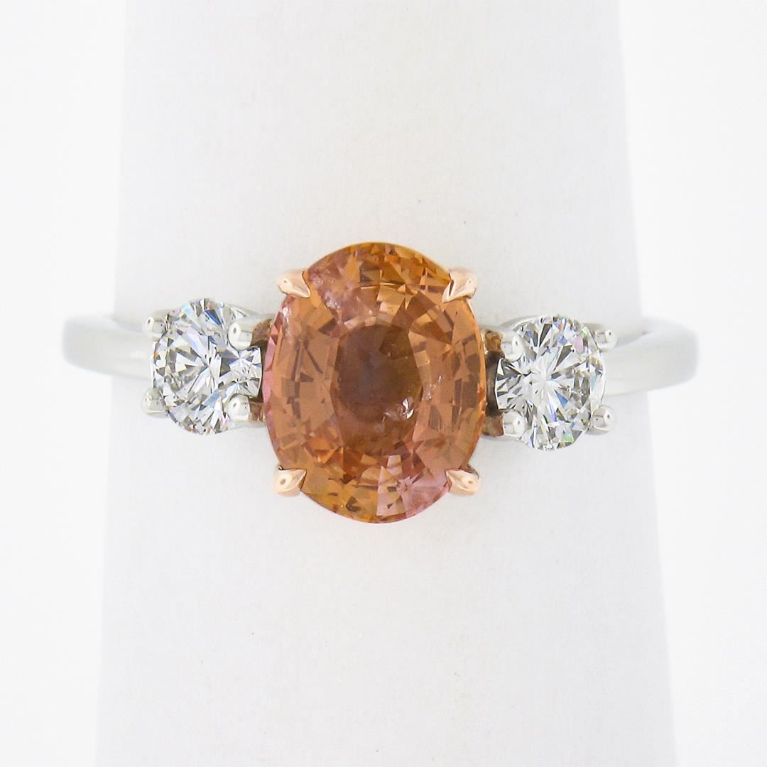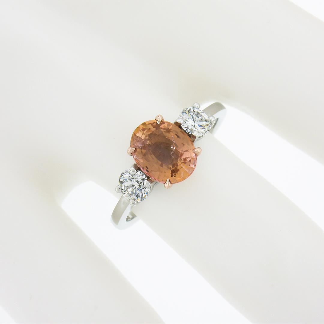 A new solid platinum & 14k rose gold ring, with 1 AGL graded oval cut natural orange sapphire (2.04ct ), and 2 round cut natural diamonds (F/G - VS1/VS2 ; 0.50ctw). The ring is size 6.5, weighs a total of 4.42 grams, and measures 8.4mm wide. Comes with all original relevant certifications.