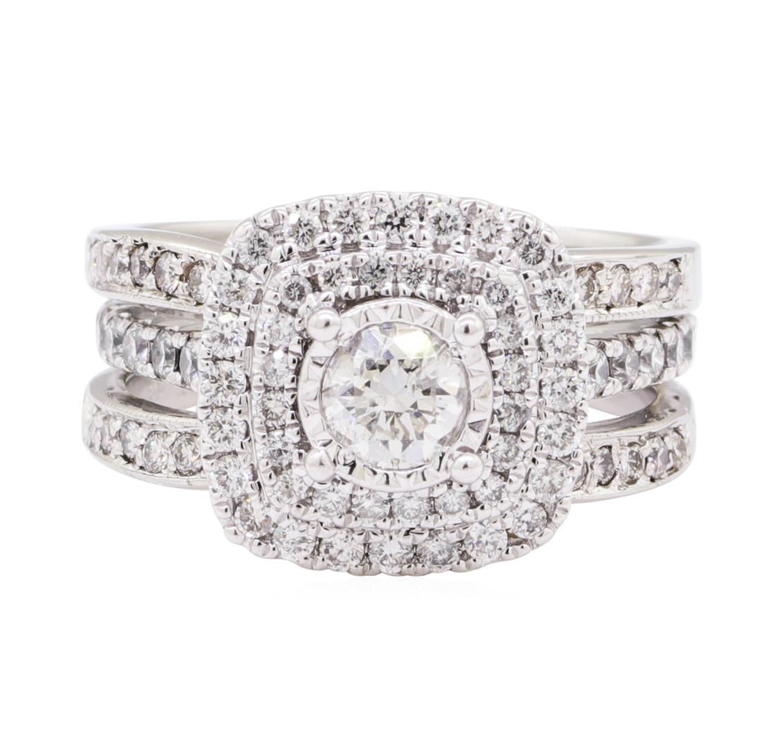 One set electronically tested platinum & 14KT white gold lady's combination cast & assembled engagement ring and ring guard with a bright polish with milgrain detailing finish. The featured lady's ring guard is cast and assembled in platinum, and the ring is cast in 14KT white gold. The ring set has a triple shank measuring 5.50 millimeters wide. Identified with markings of '14K / PLAT 950'. Condition is new, good workmanship. Containing: One prong set round brilliant cut diamond, measuring 4.80 - 4.75 x 3.01mm approximate weight of 0.45ct. Graded in the setting. Color H - I, Clarity I-1, Cut Good Fifty prong set round brilliant cut diamonds, measuring 1.70 - 1.50 x 0.99mm (depth est.) approximate total weight of 50 Stones = 0.80ct. Graded in the setting. Color H - I, Clarity SI-1 to SI-2, Cut Good Forty-Four prong set round brilliant cut diamonds, measuring 1.30 - 1.20 x 0.78mm (depth est.) approximate total weight of 44 Stones = 0.34ct. Graded in the setting. Color H - I, Clarity SI-1 to SI-2, Cut Good. Total Weight of Diamonds 1.59ct. Total Weight of Ring And Ring Guard 9.20gm. GAS Appraised.