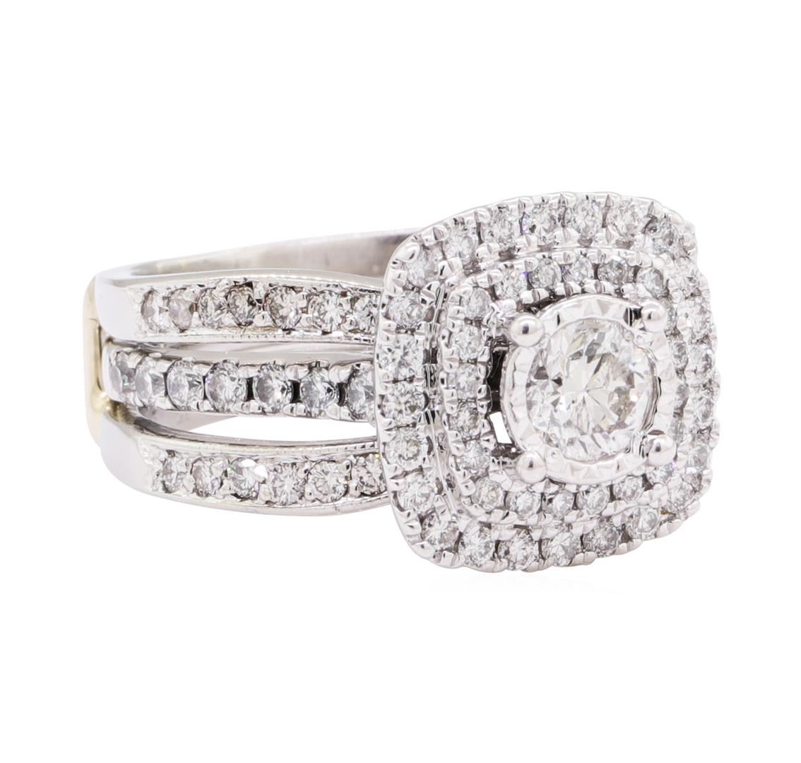 One set electronically tested platinum & 14KT white gold lady's combination cast & assembled engagement ring and ring guard with a bright polish with milgrain detailing finish. The featured lady's ring guard is cast and assembled in platinum, and the ring is cast in 14KT white gold. The ring set has a triple shank measuring 5.50 millimeters wide. Identified with markings of '14K / PLAT 950'. Condition is new, good workmanship. Containing: One prong set round brilliant cut diamond, measuring 4.80 - 4.75 x 3.01mm approximate weight of 0.45ct. Graded in the setting. Color H - I, Clarity I-1, Cut Good Fifty prong set round brilliant cut diamonds, measuring 1.70 - 1.50 x 0.99mm (depth est.) approximate total weight of 50 Stones = 0.80ct. Graded in the setting. Color H - I, Clarity SI-1 to SI-2, Cut Good Forty-Four prong set round brilliant cut diamonds, measuring 1.30 - 1.20 x 0.78mm (depth est.) approximate total weight of 44 Stones = 0.34ct. Graded in the setting. Color H - I, Clarity SI-1 to SI-2, Cut Good. Total Weight of Diamonds 1.59ct. Total Weight of Ring And Ring Guard 9.20gm. GAS Appraised.