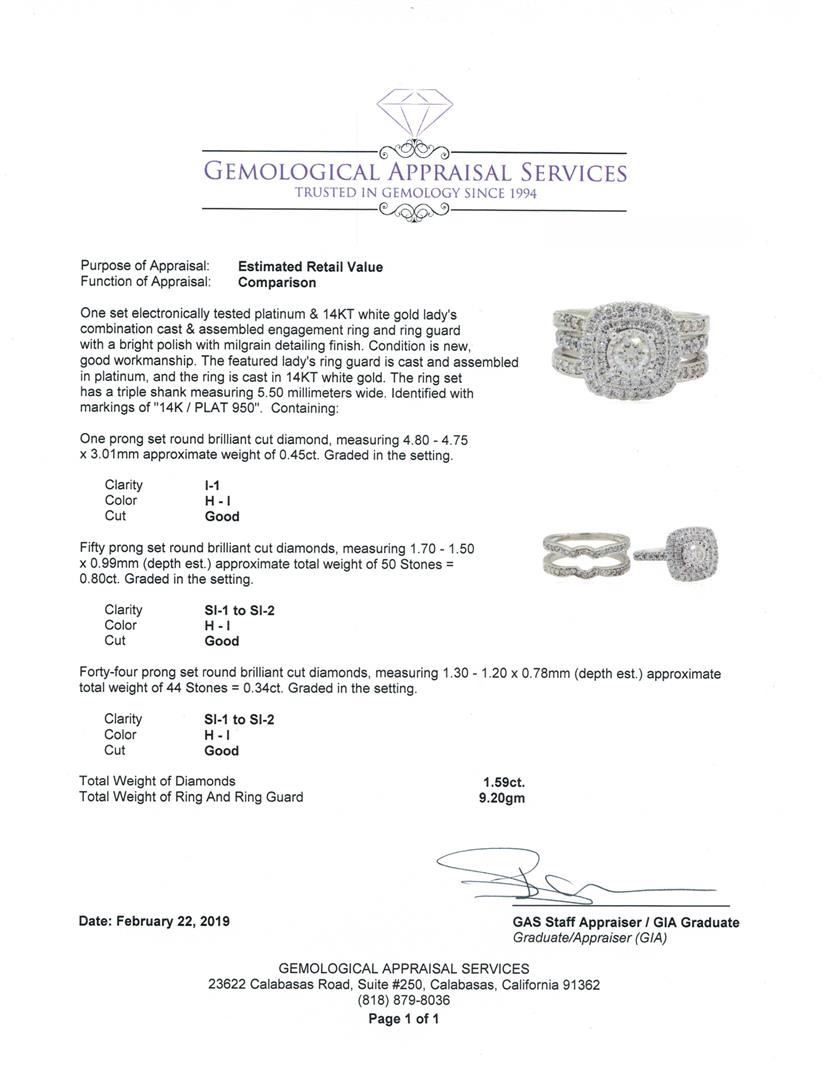 One set electronically tested platinum & 14KT white gold lady's combination cast & assembled engagement ring and ring guard with a bright polish with milgrain detailing finish. The featured lady's ring guard is cast and assembled in platinum, and the ring is cast in 14KT white gold. The ring set has a triple shank measuring 5.50 millimeters wide. Identified with markings of '14K / PLAT 950'. Condition is new, good workmanship. Containing: One prong set round brilliant cut diamond, measuring 4.80 - 4.75 x 3.01mm approximate weight of 0.45ct. Graded in the setting. Color H - I, Clarity I-1, Cut Good Fifty prong set round brilliant cut diamonds, measuring 1.70 - 1.50 x 0.99mm (depth est.) approximate total weight of 50 Stones = 0.80ct. Graded in the setting. Color H - I, Clarity SI-1 to SI-2, Cut Good Forty-Four prong set round brilliant cut diamonds, measuring 1.30 - 1.20 x 0.78mm (depth est.) approximate total weight of 44 Stones = 0.34ct. Graded in the setting. Color H - I, Clarity SI-1 to SI-2, Cut Good. Total Weight of Diamonds 1.59ct. Total Weight of Ring And Ring Guard 9.20gm. GAS Appraised.