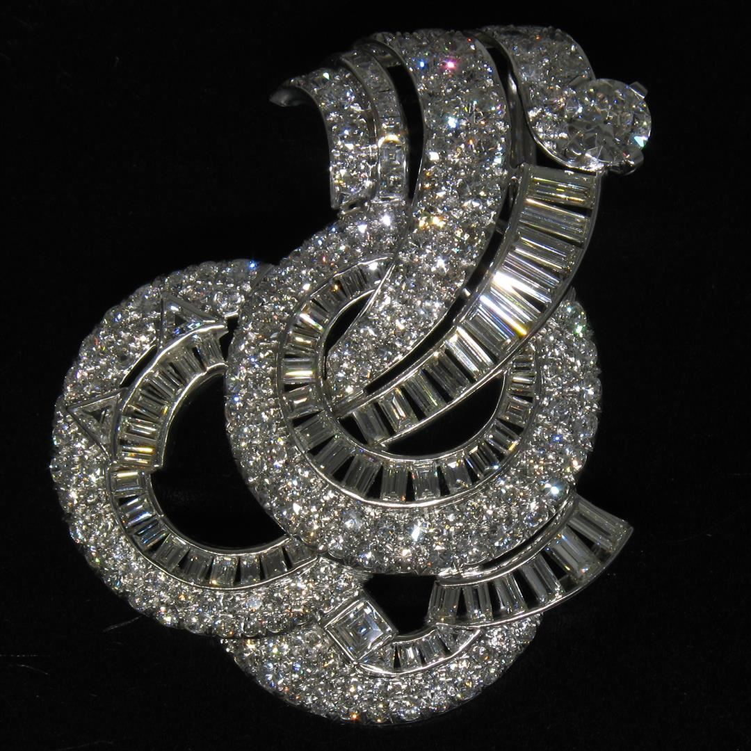 One Antique Art Deco Platinum 15.52ctw Diamond Covered Large Open Swirl Slide Pendant. Item Details - Material: Solid .900 Platinum, Weight: 27.86 Grams, Stone(s): (1) Natural Genuine Diamond - Old European Cut - Prong Set - VS2 Clarity - G Color - 0.94ct (approx.), (1) Natural Genuine Diamond - Asscher Cut - Bezel Set - VVS2 Clarity - I Color - 0.38ct (approx.), (2) Natural Genuine Diamonds - Trillion Cut - Bezel Set - VS1 Clarity - I Color - 0.30ctw (approx.), (9) Natural Genuine Diamonds - Asscher Cut - Channel Set - VVS2/VS1 Clarity - G/H Color - 0.40ctw (approx.), (54) Natural Genuine Diamonds - Baguette Cut - Channel Set - VVS2/VS1 Clarity - H/I Color - 4.85ctw (approx.), (155) Natural Genuine Diamonds - Old European and Transitional Cut - Pave Set - VS1/VS2 Clarity - G/H Color - 8.65ctw (approx.), Total Carat Weight: 15.52 (approx.), Overall Width: 44.3mm (1.70") at its widest, Overall Height: 53.7mm (2.10"), Inside Bail Dimensions: Smaller Bail: 12.0x8.6mm, Larger Bail: 16.5x8.5mm, Condition: Antique art deco period piece. All original, MINT and ready to wear condition!