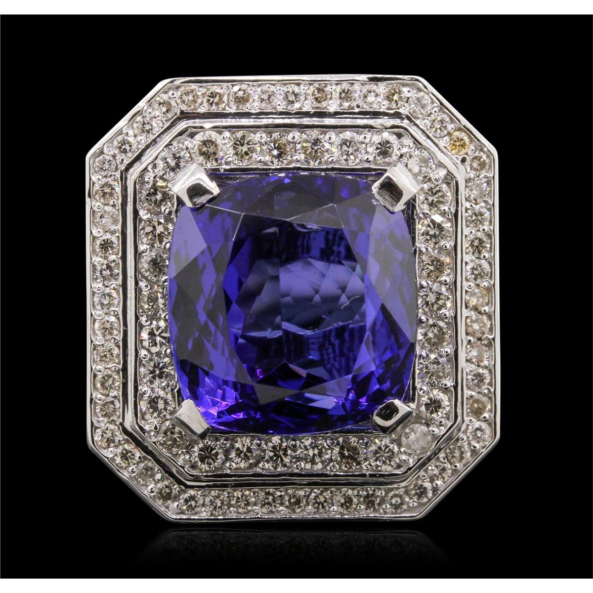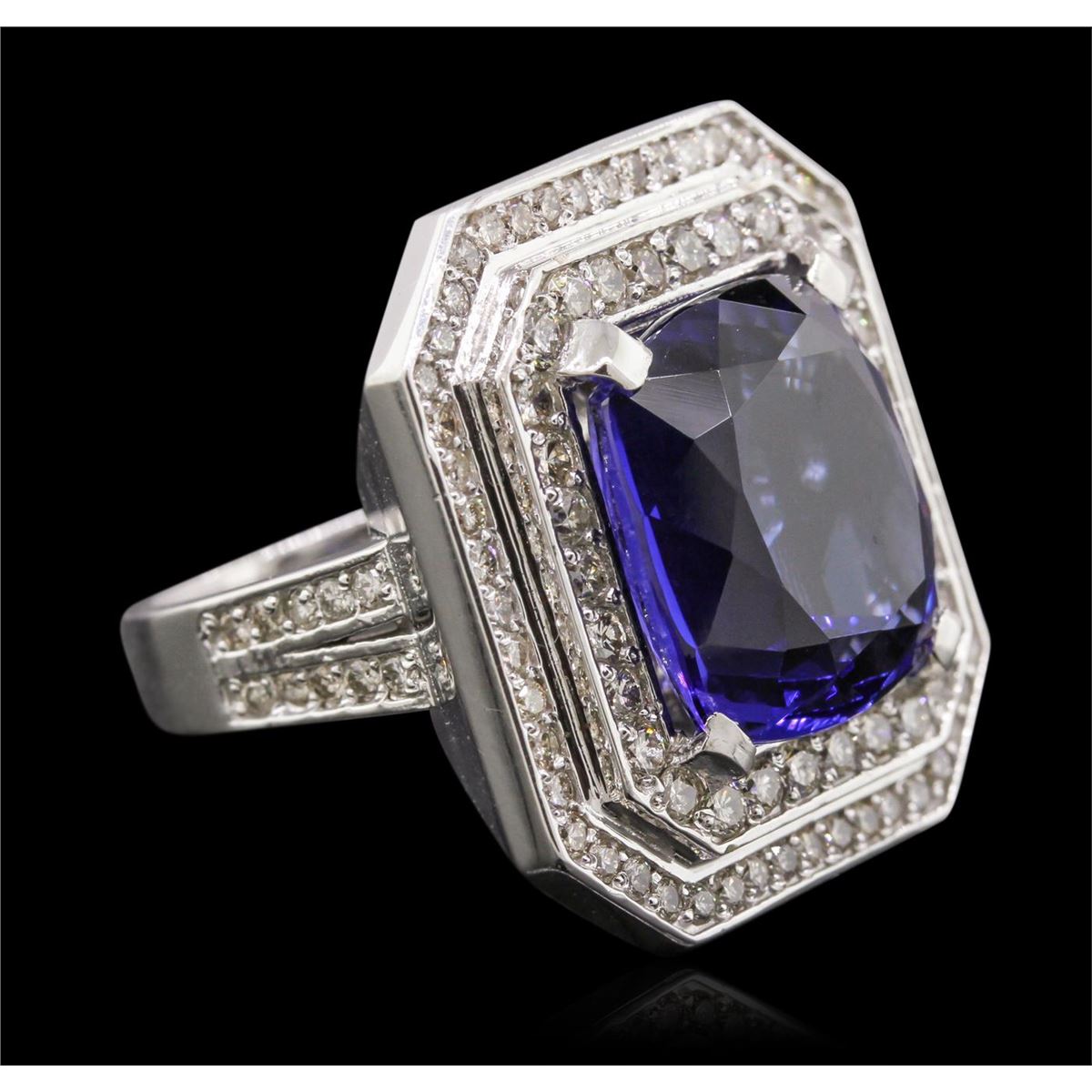 One electronically tested platinum lady's combination cast and assembled ring with a bright polish finish. Condition is new. Containing: One prong set square cushion modified brilliant cut natural tanzanite, measuring 14.73 x 14.24 x 9.60mm, approximate weight of 15.86ct., clarity is eye clean, type I, medium, moderately strong, violetish blue color, (GIA vB 5/4), cut is very good. Colored gemstones are presumed to have been subjected to commonly used color/clarity enhancement processes. One Hundred Two prong set round brilliant cut diamonds, measuring 2.00 - 1.50 x 1.05mm (depth est.) approximate. Total Weight of 102 Stones = 2.07ct. Clarity: I-1 to I-2. Color: I - J, Cut is Very Good. Total Weight of Colored Stones 15.86ct. Total Weight of Diamonds 2.07ct. Total Weight of Ring 21.30 grams. GGL Appraised at $37,580.00.