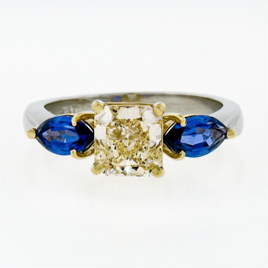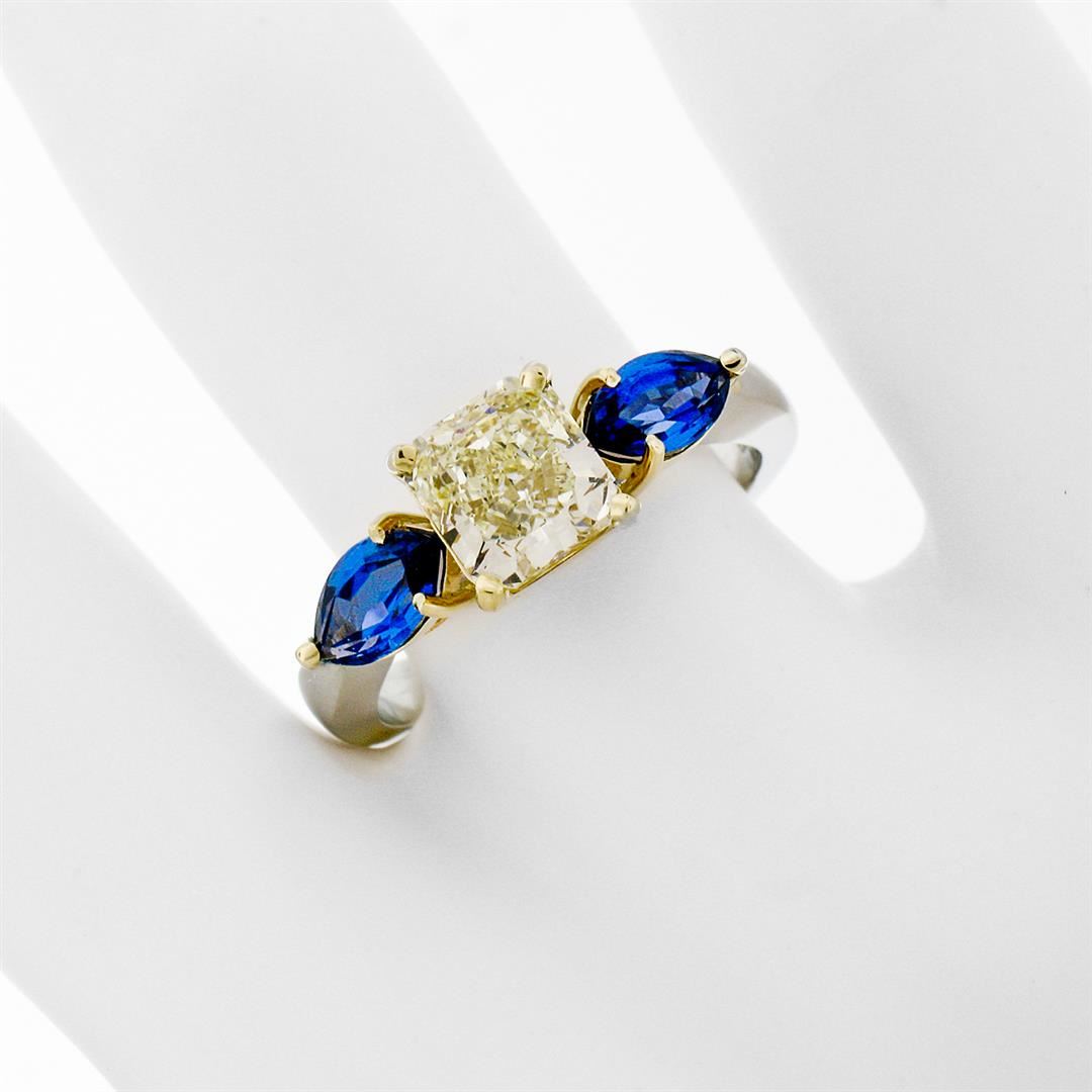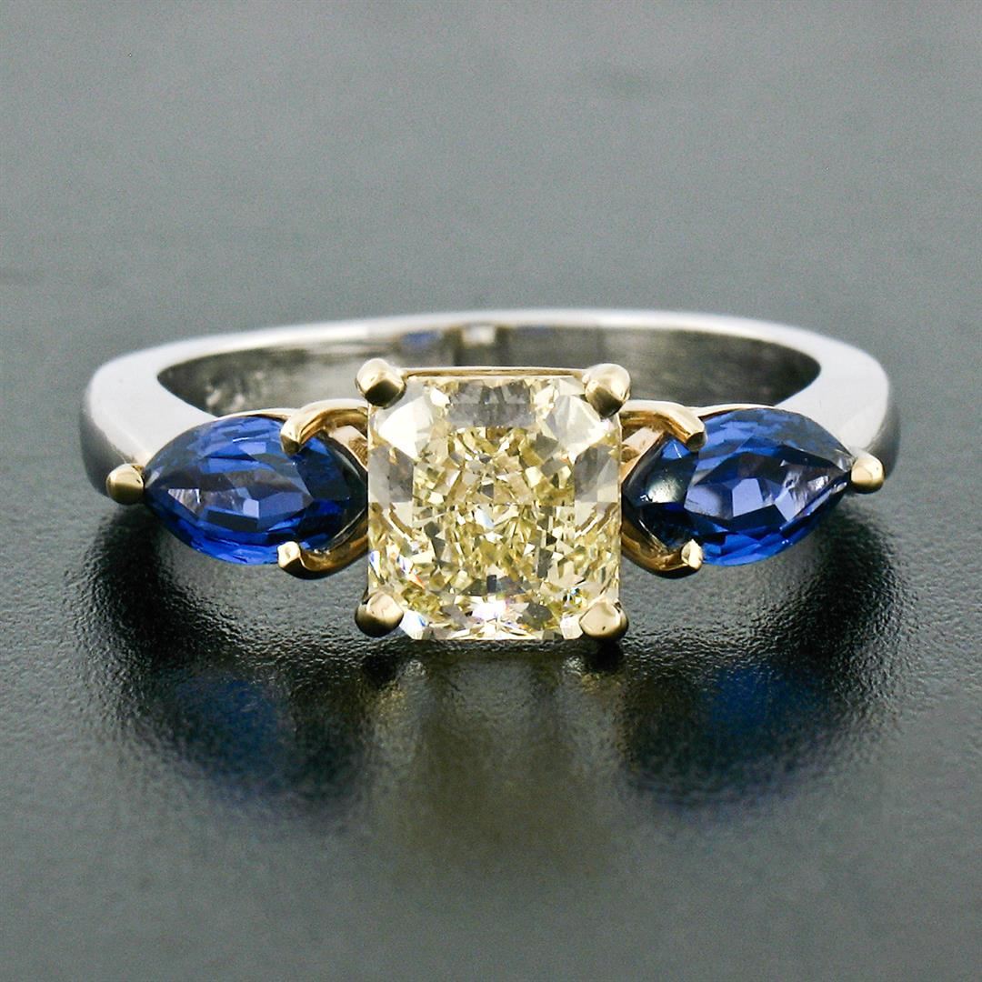 A new solid platinum and 18k yellow gold 3 stones ring, featuring 1 Gia certified Radiant Cut natural yellow diamond (VVS1; 1.46ct), and 2 marquise cut natural sapphires (1.15ctw). The ring is size 7.0, weighs a total of 6.40 grams, and measures 19.5mm wide. Comes with all original relevant certifications.