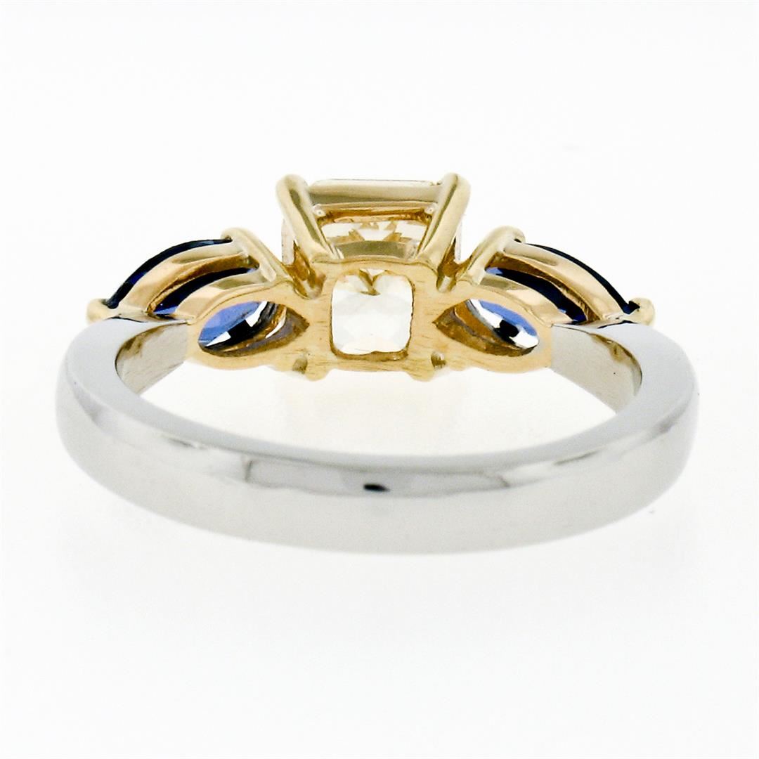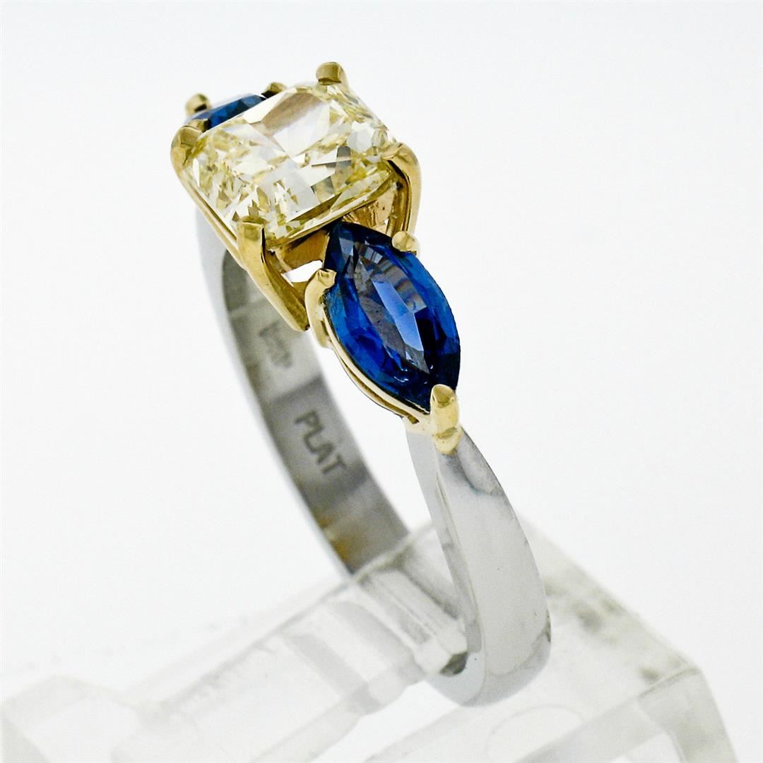 A new solid platinum and 18k yellow gold 3 stones ring, featuring 1 Gia certified Radiant Cut natural yellow diamond (VVS1; 1.46ct), and 2 marquise cut natural sapphires (1.15ctw). The ring is size 7.0, weighs a total of 6.40 grams, and measures 19.5mm wide. Comes with all original relevant certifications.