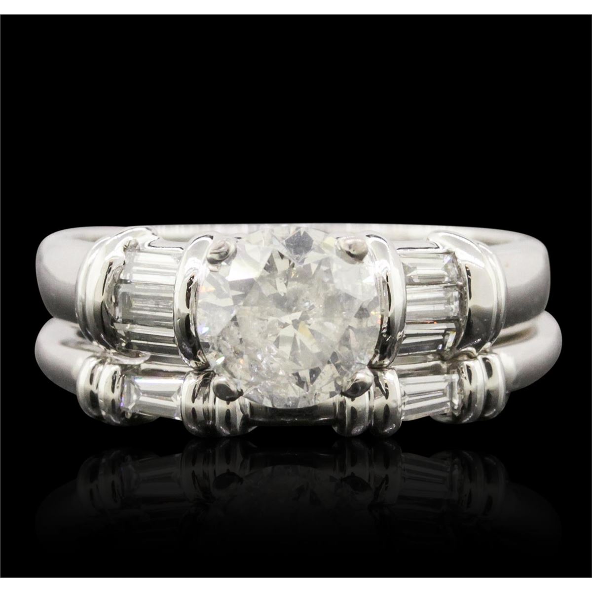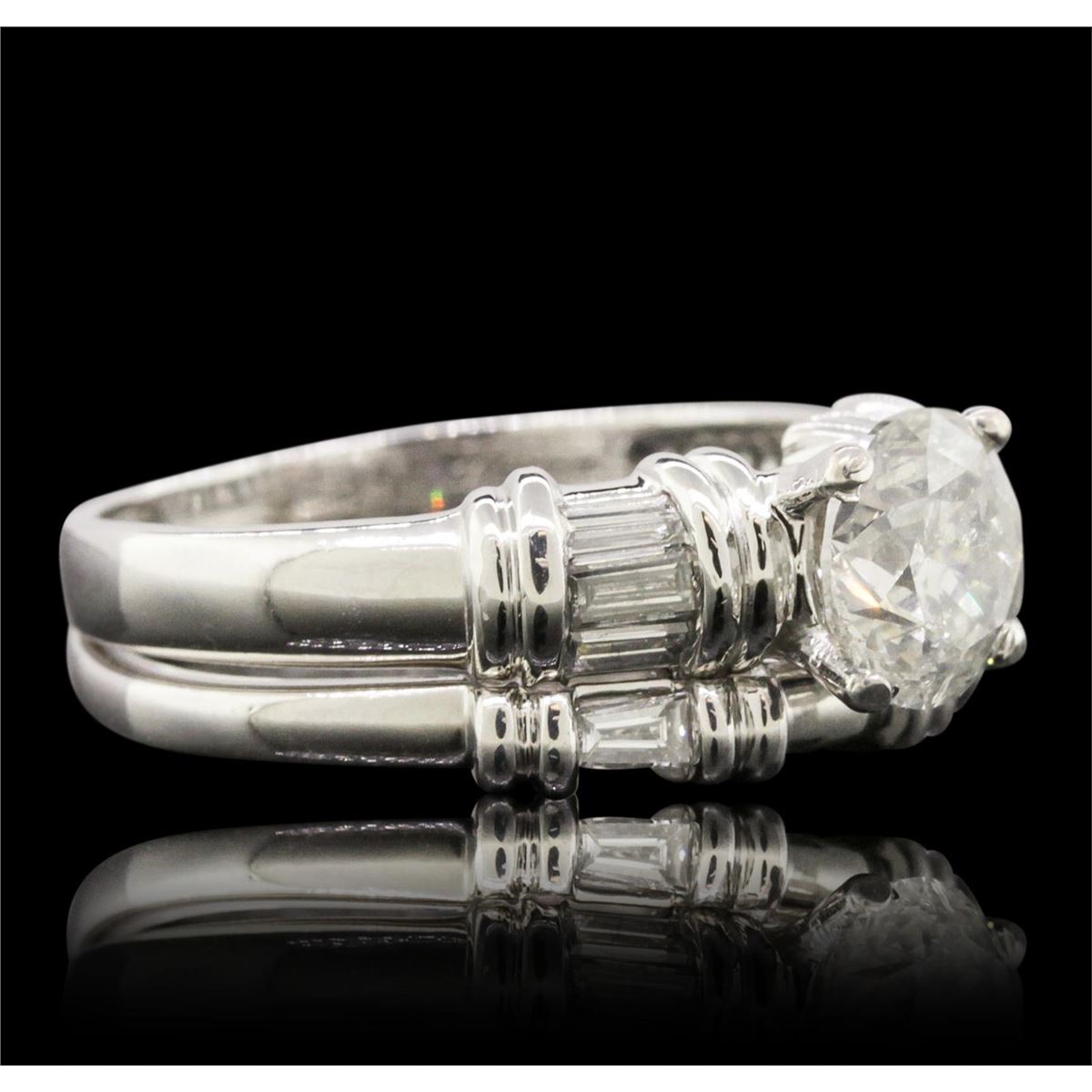 One electronically tested platinum ladies combination cast & assembled engagement ring & wedding band with a bright polish finish. Condition is new. Identified with markings of "PT 950". Containing: One prong set round brilliant cut diamond, measuring 7.60 - 7.50 x 4.53mm (depth est.) approximate weight of 1.58ct. Clarity: I-2. Color: J, Cut is Good. Eight channel set baguette cut diamonds, measuring 3.00 x 1.50 x 1.28mm (depth est.) approximate. Total Weight of 8 Stones = 0.42ct. Clarity: SI-1. Color: H - I, Cut is Good. All diamonds are graded in the mounting, unless otherwise stated. Total Weight of Diamonds 2.00ct. Total Weight of Ring & Wedding Band 13.60 grams. GGL Appraised at $21,680.00.