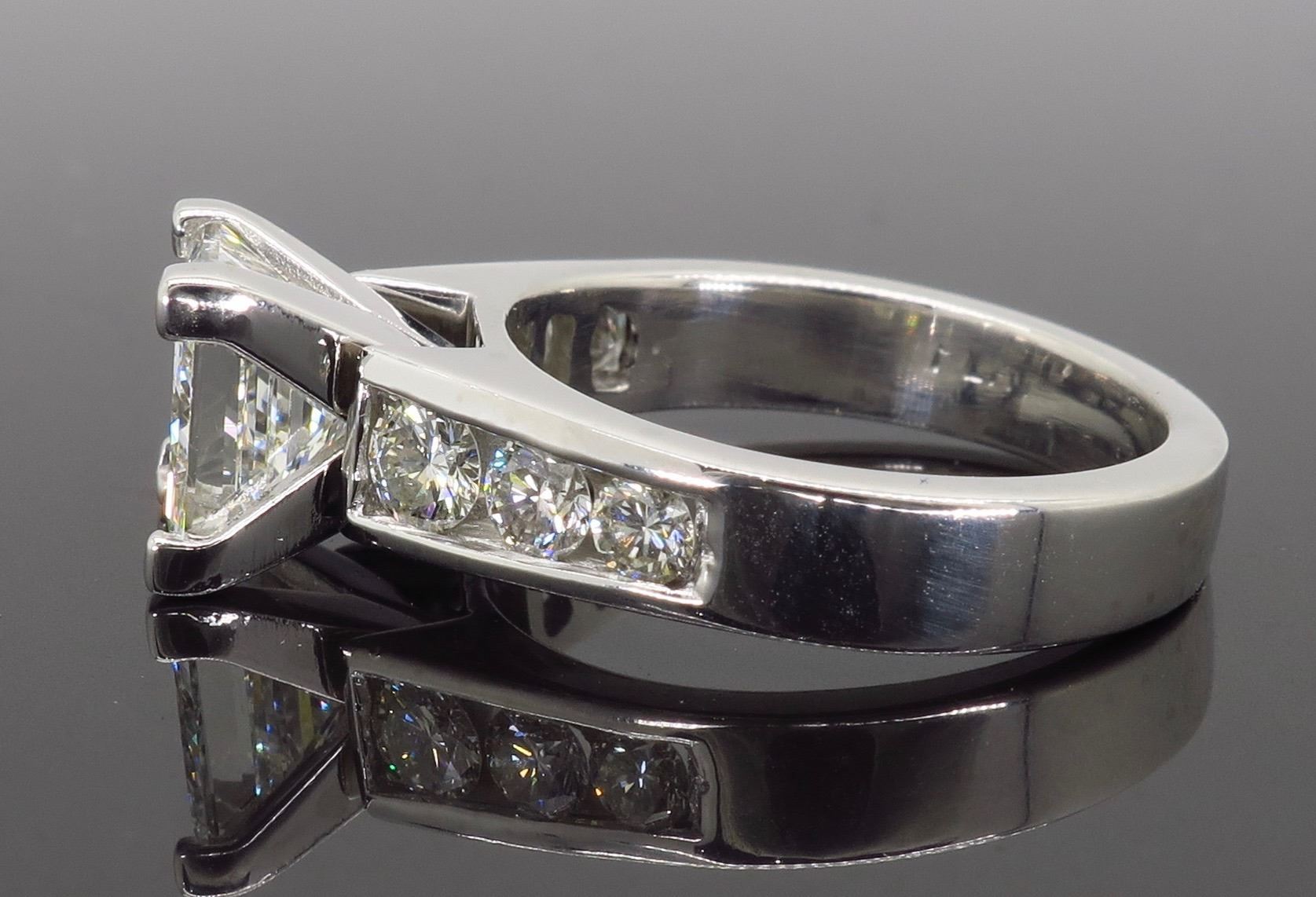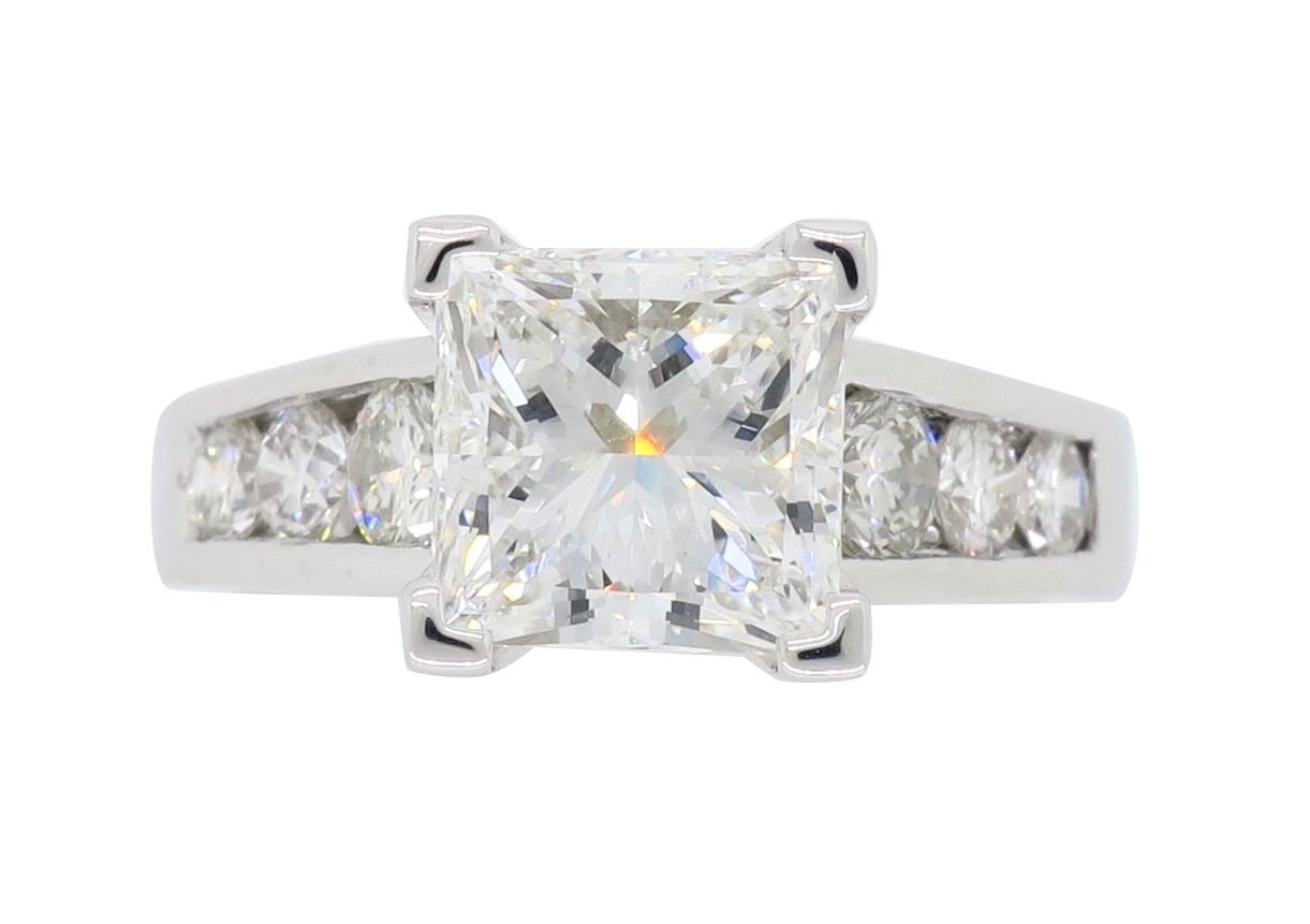 One Platinum 2.01ct GIA Cert Diamond Ring. (1) GIA Certified princess cut Diamond with a total weight of 2.01cts with a color of F and clarity of VS-1. (6) round Diamonds with a total weight of 0.65cts with a color of VS-2 to SI-2. Total weight of this ring is 9 grams. Ring size is 5.25. GIA Certified, Electronic Copy Only, and GIA verification report Diamond is laser Scribed- GIA 12323650.