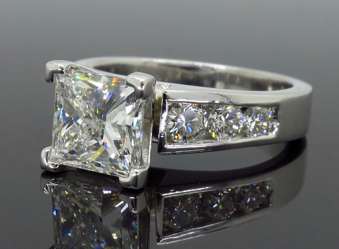 One Platinum 2.01ct GIA Cert Diamond Ring. (1) GIA Certified princess cut Diamond with a total weight of 2.01cts with a color of F and clarity of VS-1. (6) round Diamonds with a total weight of 0.65cts with a color of VS-2 to SI-2. Total weight of this ring is 9 grams. Ring size is 5.25. GIA Certified, Electronic Copy Only, and GIA verification report Diamond is laser Scribed- GIA 12323650.