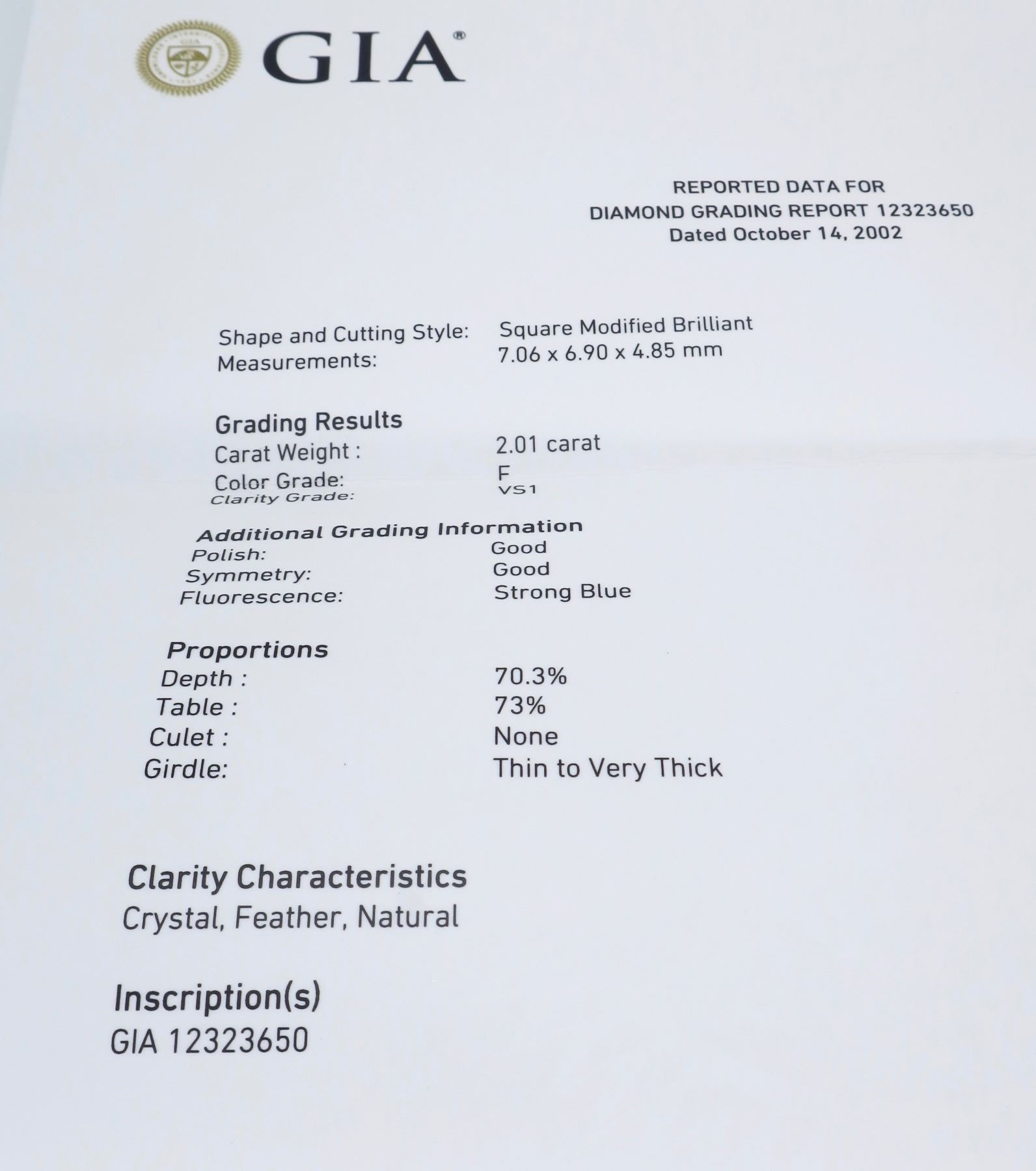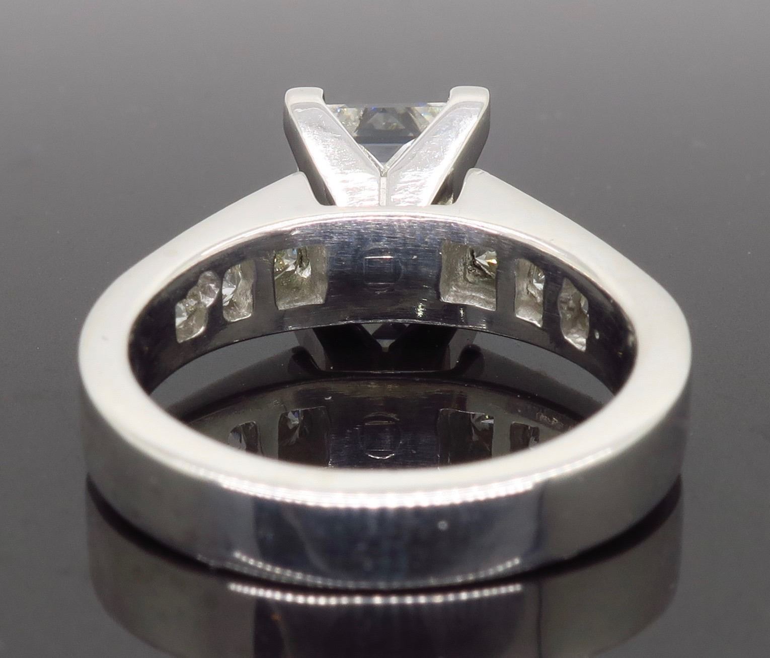 One Platinum 2.01ct GIA Cert Diamond Ring. (1) GIA Certified princess cut Diamond with a total weight of 2.01cts with a color of F and clarity of VS-1. (6) round Diamonds with a total weight of 0.65cts with a color of VS-2 to SI-2. Total weight of this ring is 9 grams. Ring size is 5.25. GIA Certified, Electronic Copy Only, and GIA verification report Diamond is laser Scribed- GIA 12323650.