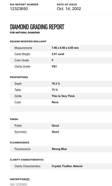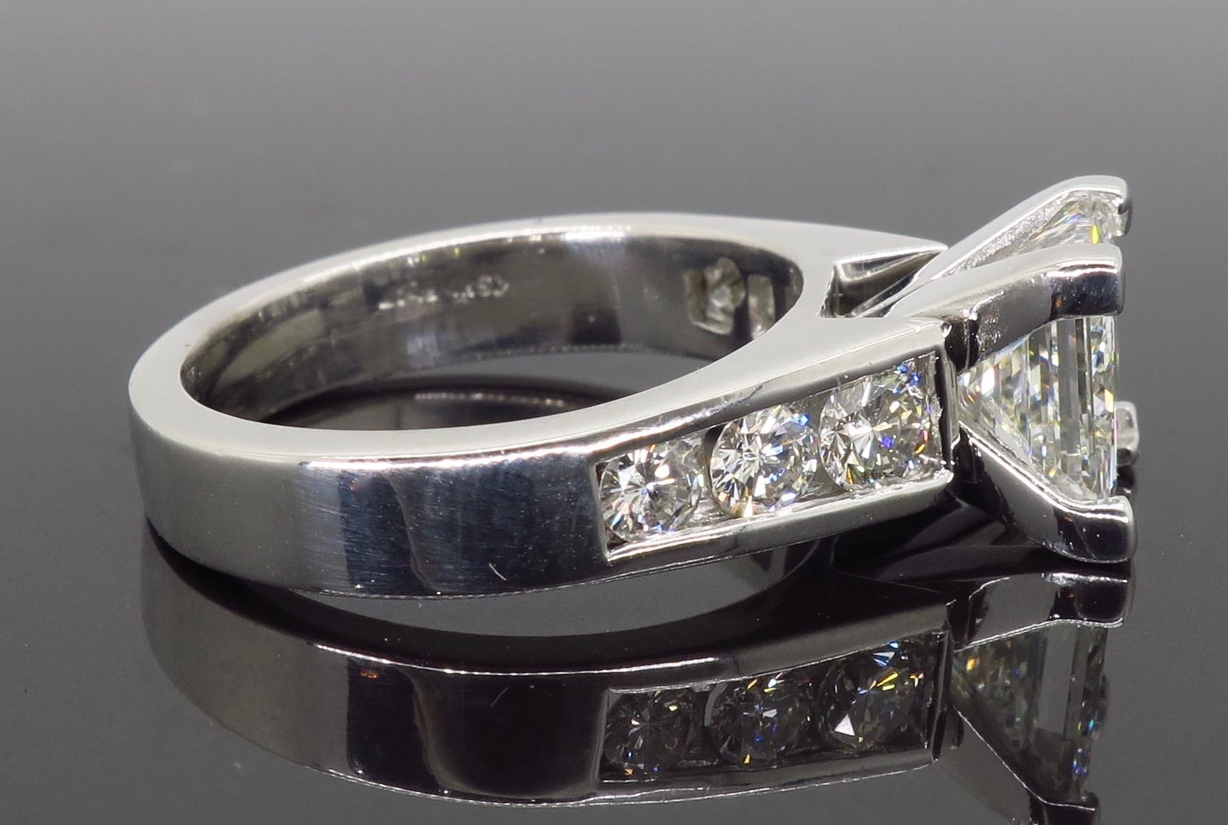 One Platinum 2.01ct GIA Cert Diamond Ring. (1) GIA Certified princess cut Diamond with a total weight of 2.01cts with a color of F and clarity of VS-1. (6) round Diamonds with a total weight of 0.65cts with a color of VS-2 to SI-2. Total weight of this ring is 9 grams. Ring size is 5.25. GIA Certified, Electronic Copy Only, and GIA verification report Diamond is laser Scribed- GIA 12323650.