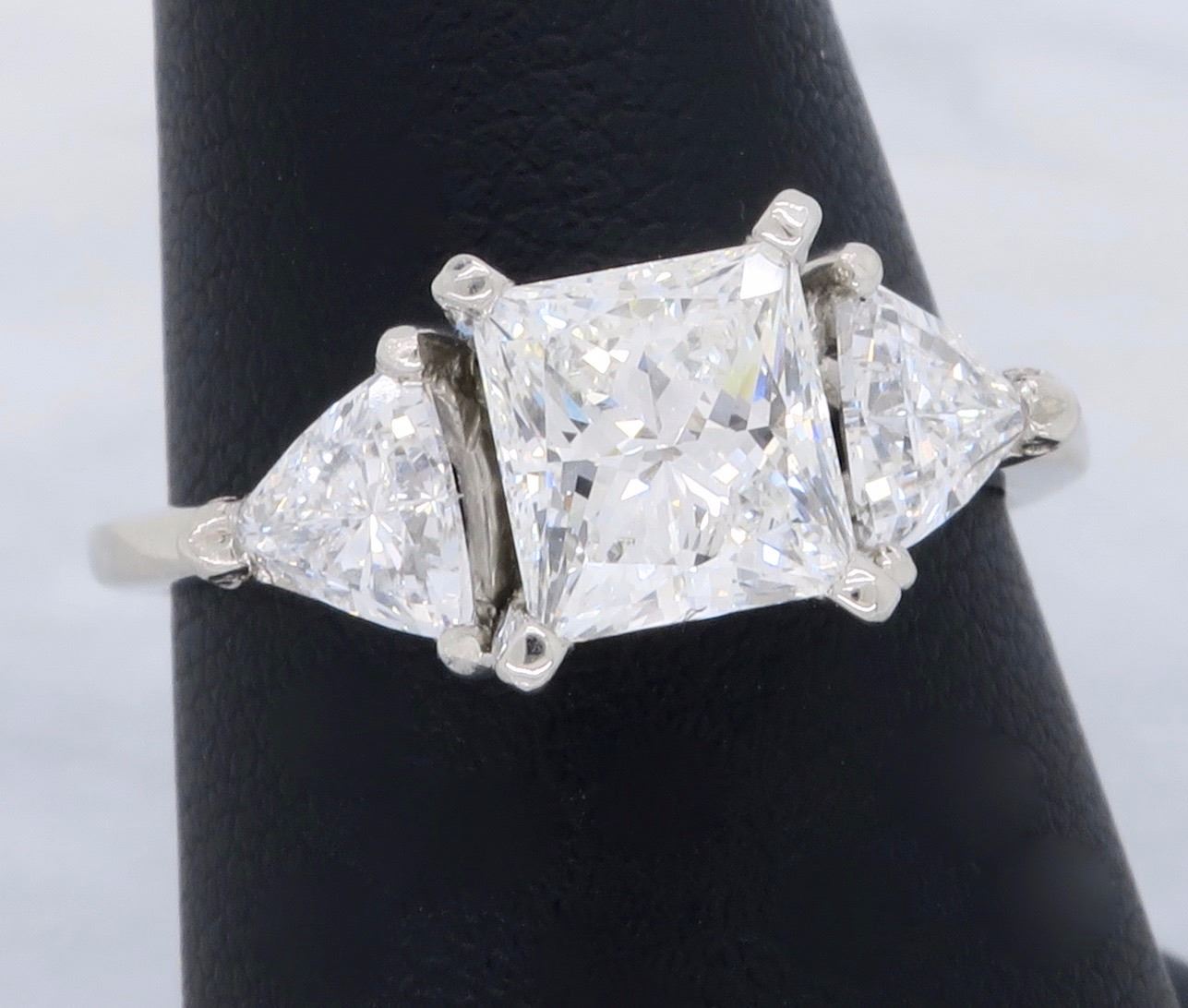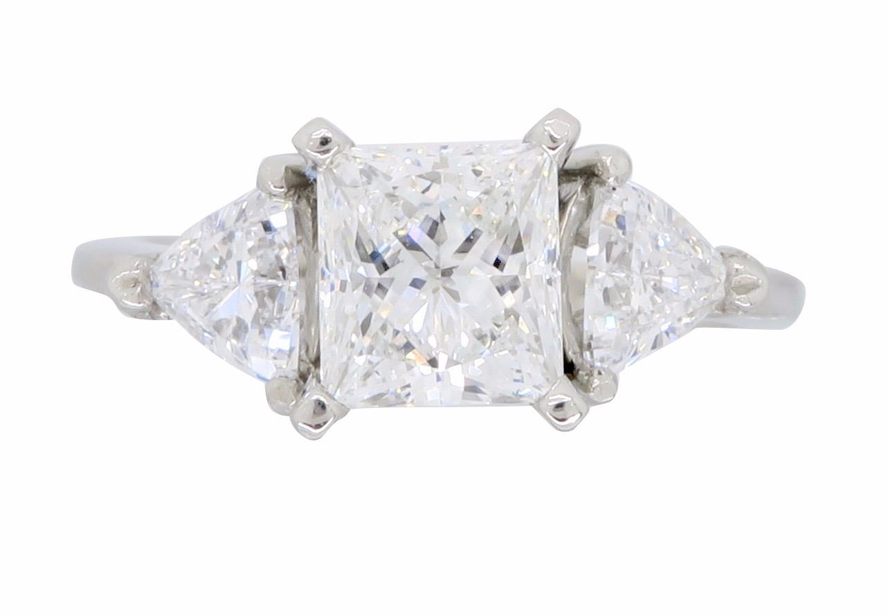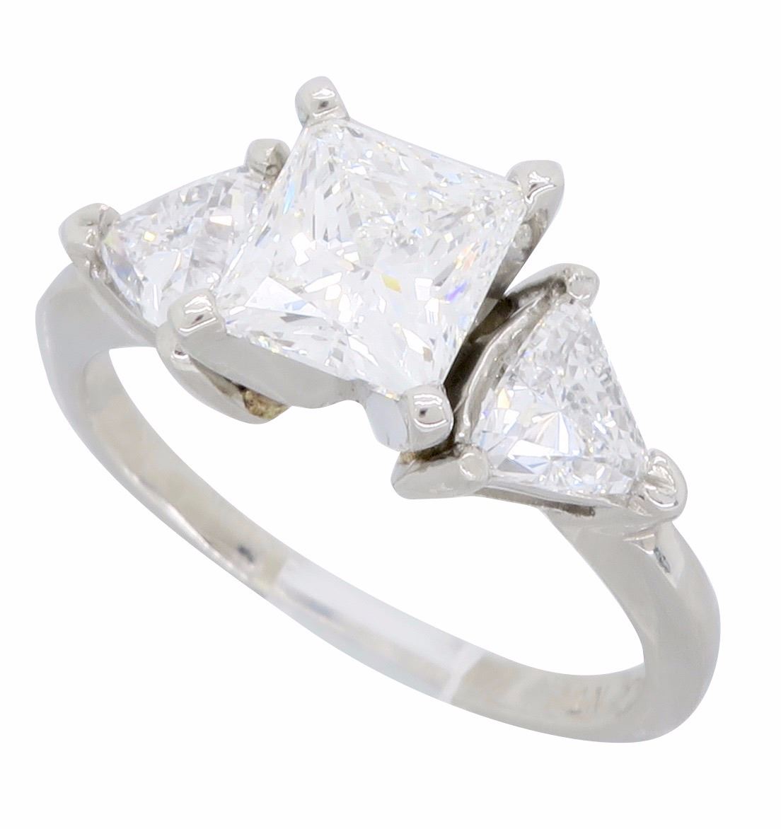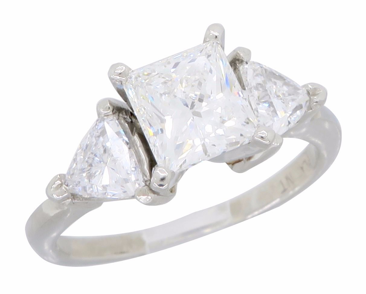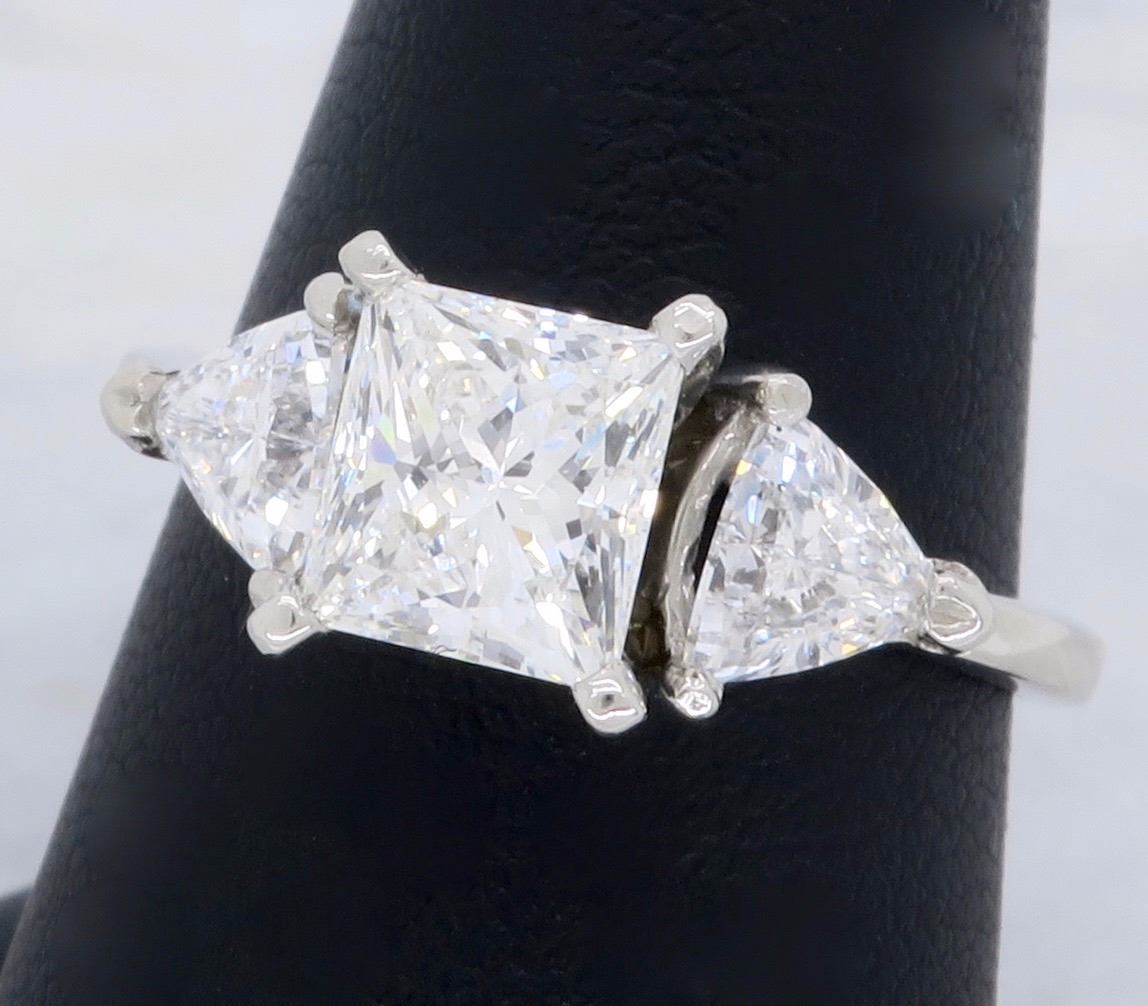 One Platinum 2.02ctw Diamond Ring. (1) Princess cut center Diamond with a total weight of 1.23cts with a color of G and clarity of VS-2. (2) Trillion cut side Diamonds with a total weight of 0.79cts. Total weight of this ring is 5.2 grams.