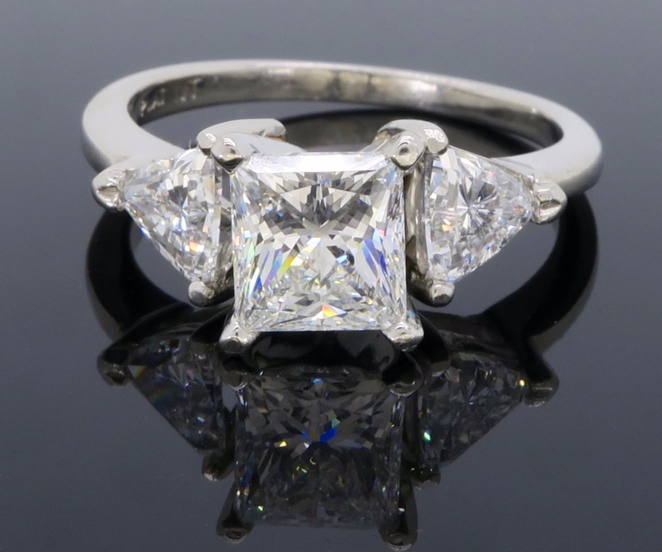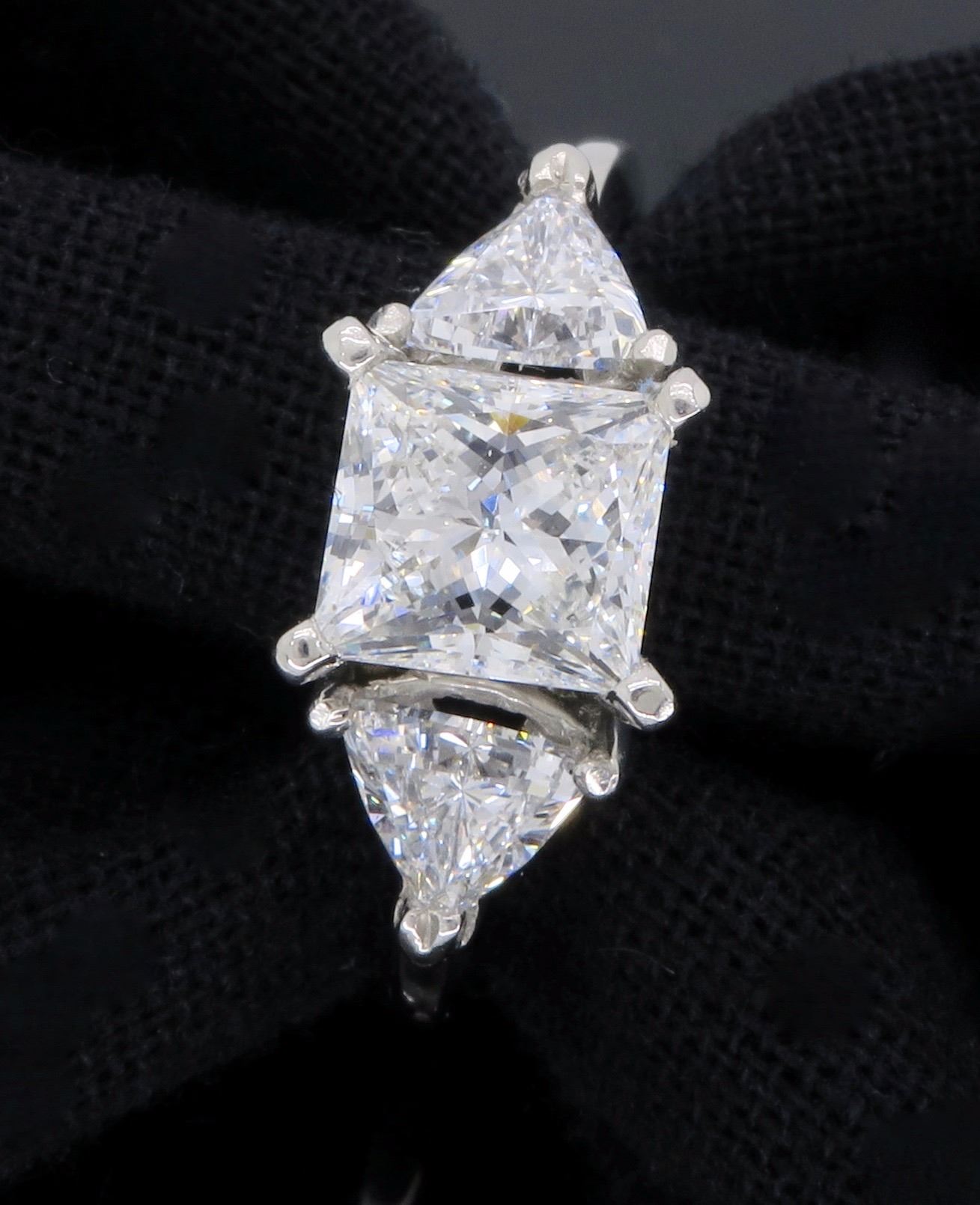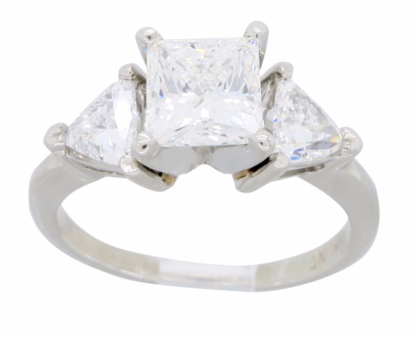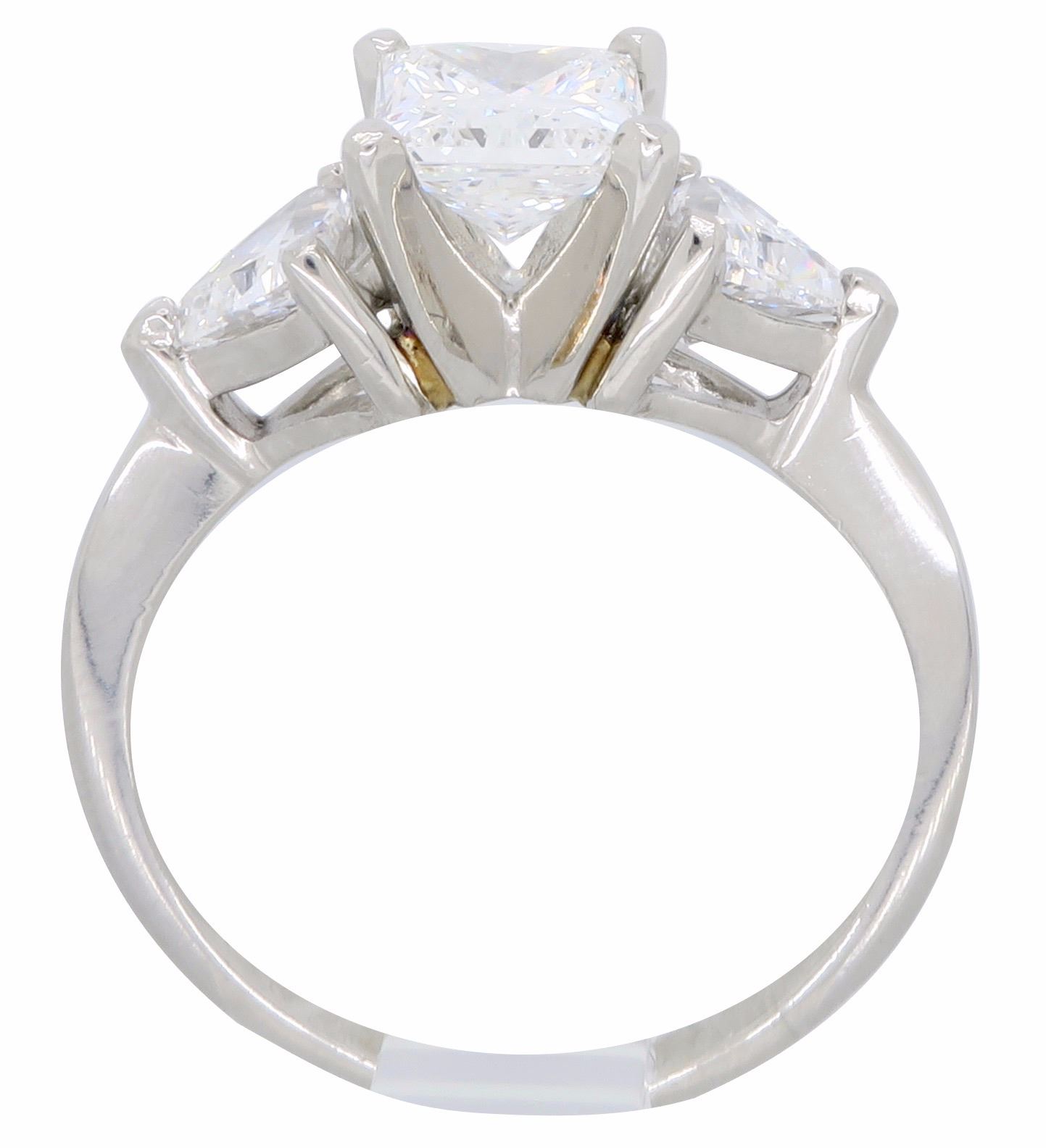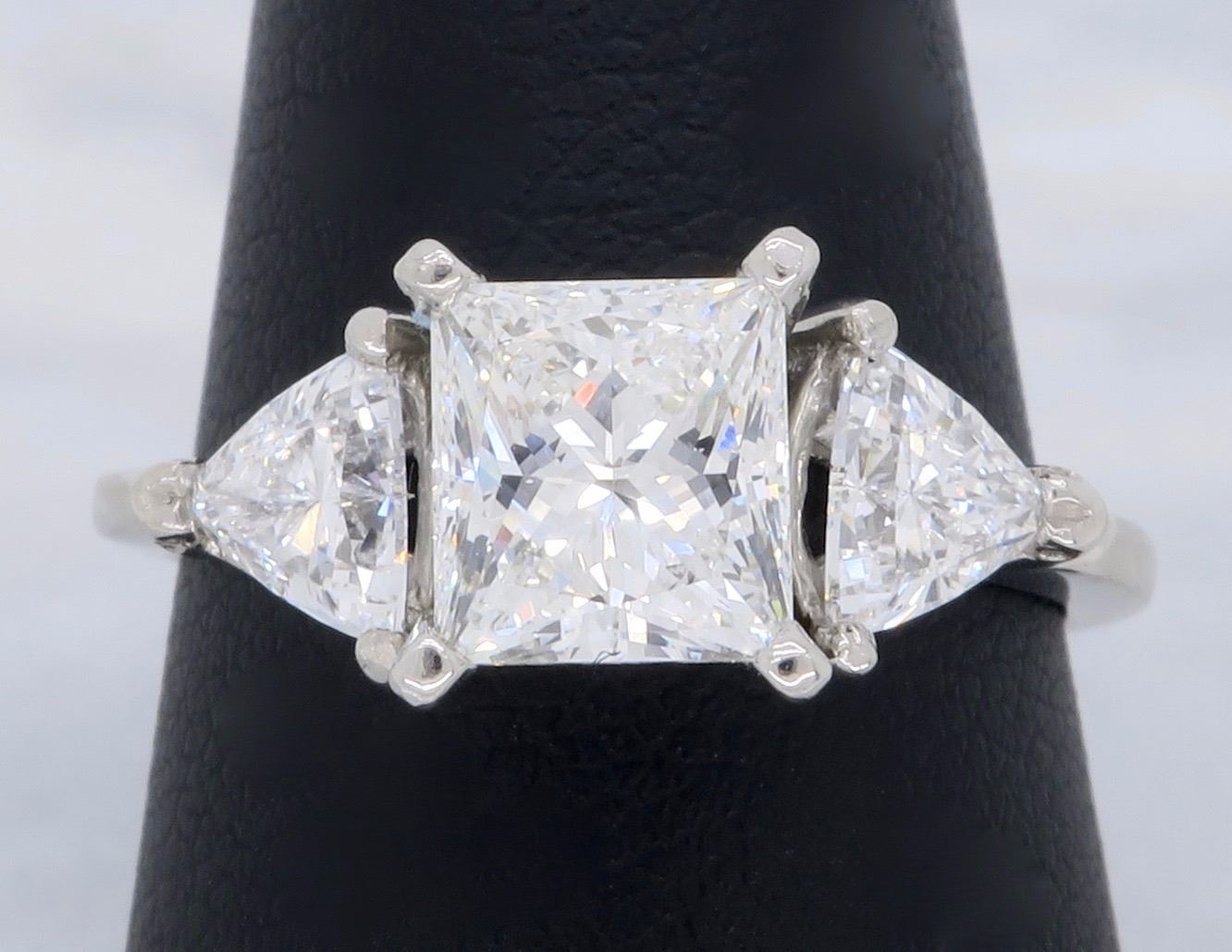 One Platinum 2.02ctw Diamond Ring. (1) Princess cut center Diamond with a total weight of 1.23cts with a color of G and clarity of VS-2. (2) Trillion cut side Diamonds with a total weight of 0.79cts. Total weight of this ring is 5.2 grams.