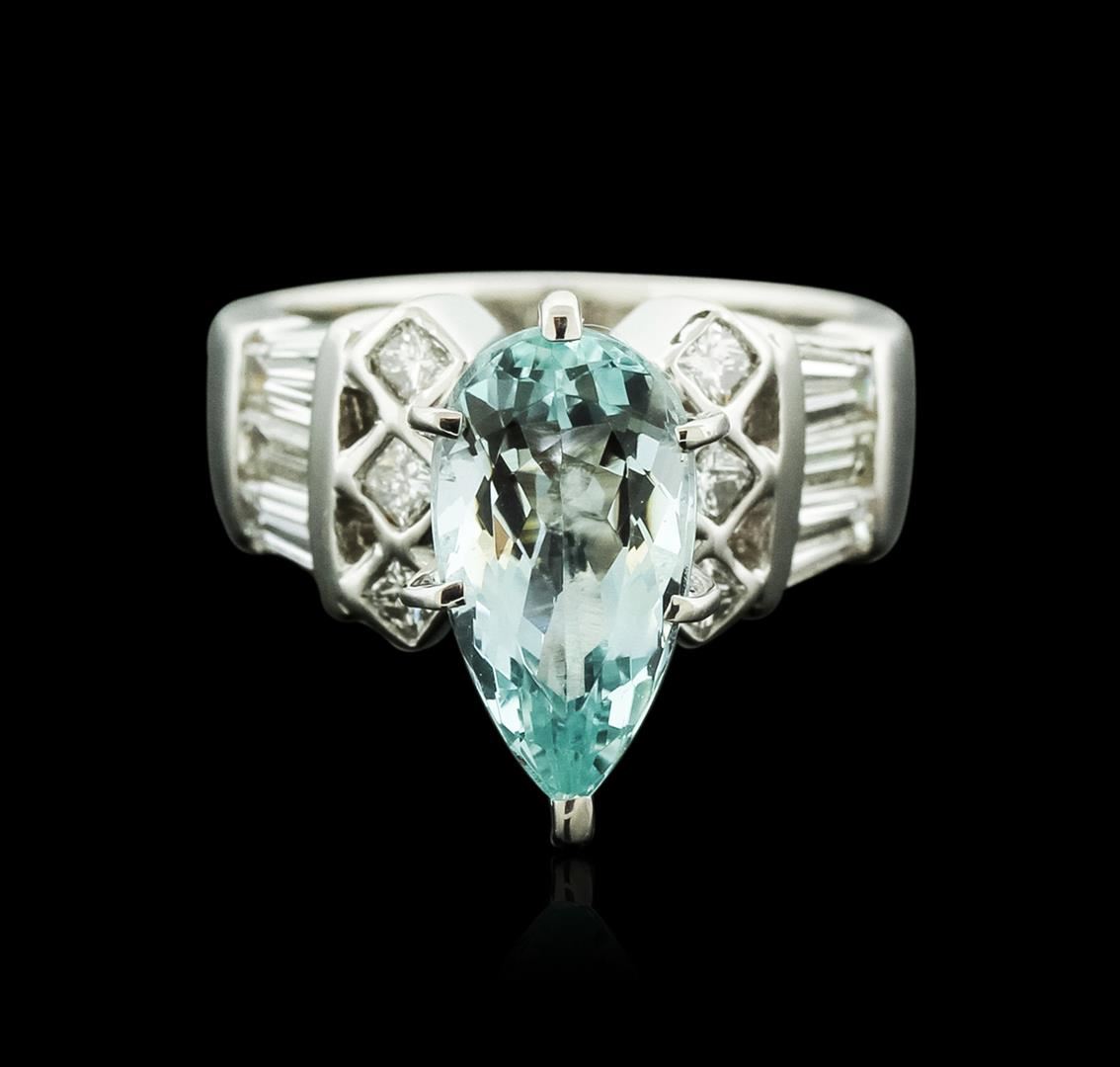 One electronically tested platinum ladies cast aquamarine and diamond ring with a flat shank with rounded edges with a bright polish finish. Identified with markings of "PLAT". Condition is new. Containing: One prong set pear modified brilliant cut natural aquamarine, measuring 11.72 x 7.07 x 4.60mm, approximate weight of 2.07ct., clarity is eye clean, type I, medium light, very slightly grayish, very slightly greenish blue color, (GIA vslgB 4/3), cut is good. Six channel set baguette cut diamonds, measuring 4.00 x 2.00 x 1.70mm (depth est.) approximate total weight of 6 Stones = 0.75ct. Clarity: VS-2. Color: H - I, Cut is Good. Six bezel set princess cut diamonds, measuring 1.90 x 1.90 x 1.43mm (depth est.) approximate total weight of 6 Stones = 0.25ct. Clarity: VS-2 to SI-1. Color: I - J, Cut is Good. All diamonds and colored gemstones are graded in the mounting, unless otherwise stated. Colored gemstones are presumed to have been subjected to commonly used enhancement processes. Total Weight of Colored Stones 2.07ct. Total Weight of Diamonds 1.00ct. Total Weight of Ring 15.50 grams. GGL Appraised at $6,295.00.
