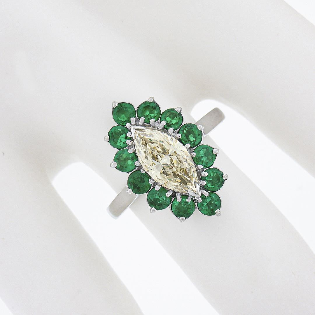 A solid platinum ring, with 1 marquise cut natural light yellow diamond (S/T - VS1 ; 1.10ct), and a halo of 12 round brilliant cut natural emeralds (1.20ctw ). The ring is size 5.5, weighs a total of 6.75 grams, and measures 18.9mm wide.