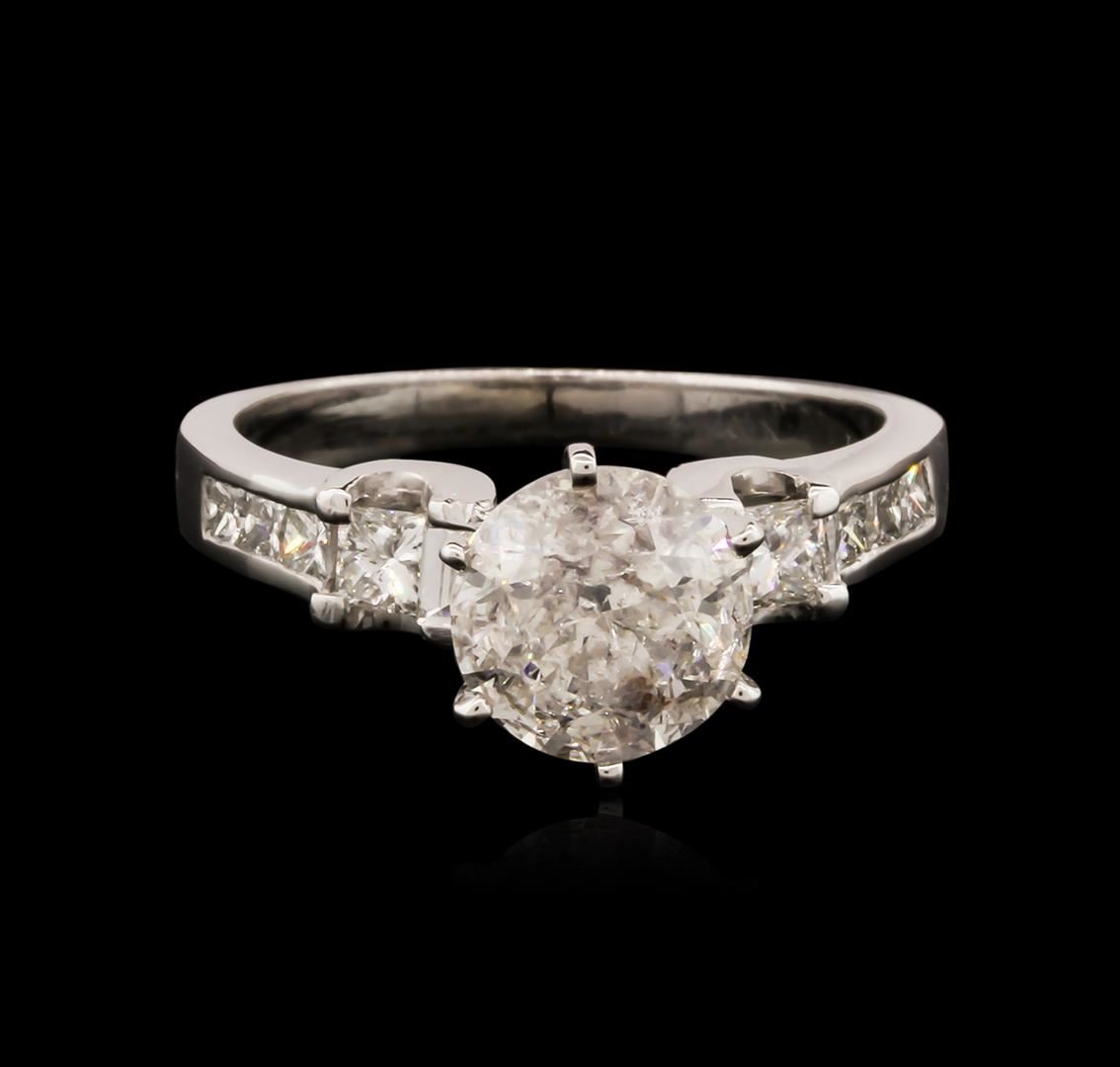 One electronically tested platinum ladies cast diamond engagement ring with a bright polish finish. Identified with markings of "950". Condition is new. Containing: One prong set round brilliant cut diamond, measuring 7.80 - 7.80 x 4.68mm (depth est.) approximate weight of 1.74ct. Clarity: I-3. Color: J. Eight channel set princess cut diamonds, measuring 2.50 x 2.00 x 1.51mm (depth est.) approximate total weight of 8 Stones = 0.50ct. Clarity: SI-1 to SI-2. Color: I - J, Cut is Good. Two prong set baguette cut diamonds, measuring 2.00 x 1.50 x 1.28mm (depth est.) approximate total weight of 2 Stones = 0.07ct. Clarity: SI-1. Color: I - J, Cut is Good. All diamonds are graded in the mounting, unless otherwise stated. Total Weight of Diamonds 2.30ct. Total Weight of Engagement Ring 5.90 grams. GGL Appraised at $7,630.00.