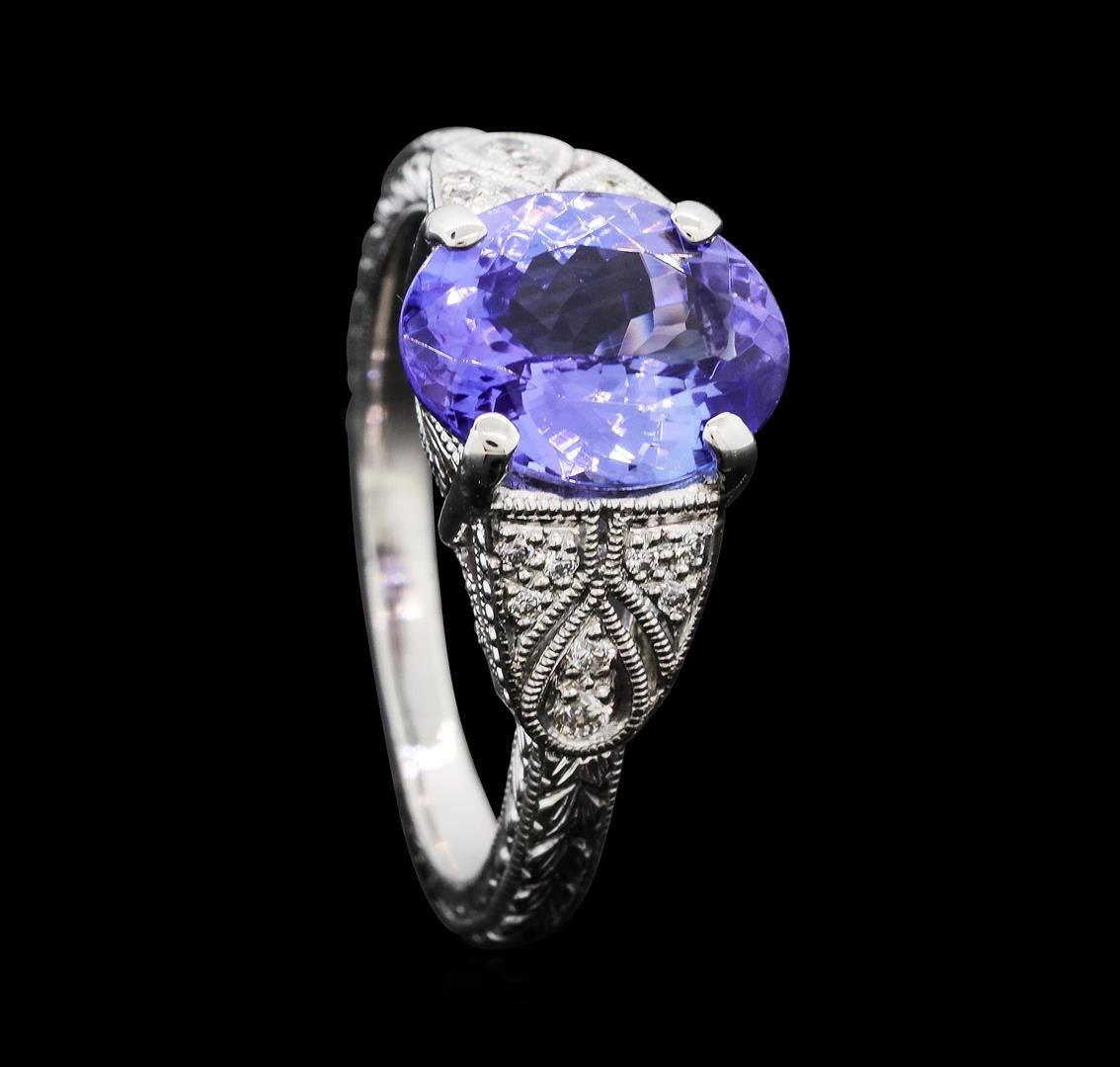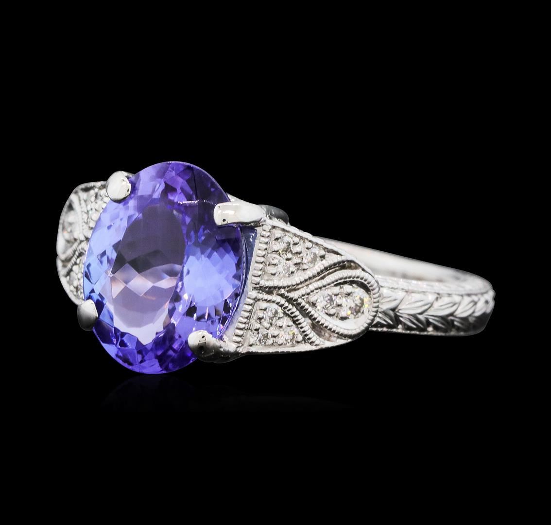 One electronically tested platinum lady's cast vintage style fashion ring with a cathedral shank with a bright polish with milgrain detailing finish. The featured lady's ring has a shank measuring 1.80 millimeters wide. Identified with markings of "PT 900". Condition is new, good workmanship. Containing: One prong set oval modified brilliant cut natural tanzanite, measuring 9.93 x 7.85 x 4.44mm, (depth est.) approximate weight of 2.42ct., clarity is slightly included, medium light, moderately strong, violet color, (GIA V 4/4), cut is very good. Transmitting light with no distortion, transparent. Colored gemstones are presumed to have been subjected to commonly used enhancement processes. Graded in the setting. Two prong set round brilliant cut diamonds, measuring 1.40 - 1.30 x 0.84mm (depth est.) approximate. Total Weight of 2 Stones = 0.02ct. Graded in the setting. Color HClarity VS-2 to SI-1 Cut Very Good Fourteen prong set round brilliant cut diamonds, measuring 1.20 - 1.00 x 0.68mm (depth est.) approximate. Total Weight of 14 Stones = 0.07ct. Graded in the setting. Color G - HClarity VS-2 to SI-1 Cut Very Good. Total Weight of Colored Stones 2.42ct.. Total Weight of Diamonds 0.09ct.. Total Weight of Ring 6.30gm. GAS Appraised.