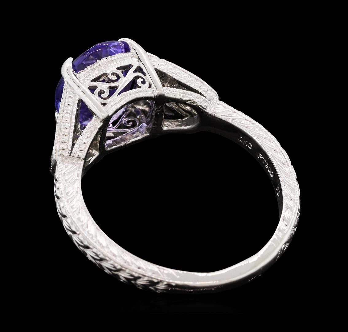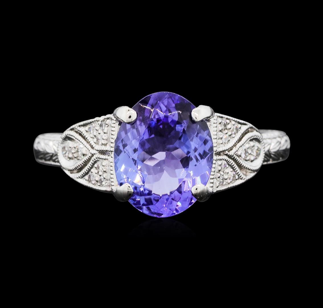 One electronically tested platinum lady's cast vintage style fashion ring with a cathedral shank with a bright polish with milgrain detailing finish. The featured lady's ring has a shank measuring 1.80 millimeters wide. Identified with markings of "PT 900". Condition is new, good workmanship. Containing: One prong set oval modified brilliant cut natural tanzanite, measuring 9.93 x 7.85 x 4.44mm, (depth est.) approximate weight of 2.42ct., clarity is slightly included, medium light, moderately strong, violet color, (GIA V 4/4), cut is very good. Transmitting light with no distortion, transparent. Colored gemstones are presumed to have been subjected to commonly used enhancement processes. Graded in the setting. Two prong set round brilliant cut diamonds, measuring 1.40 - 1.30 x 0.84mm (depth est.) approximate. Total Weight of 2 Stones = 0.02ct. Graded in the setting. Color HClarity VS-2 to SI-1 Cut Very Good Fourteen prong set round brilliant cut diamonds, measuring 1.20 - 1.00 x 0.68mm (depth est.) approximate. Total Weight of 14 Stones = 0.07ct. Graded in the setting. Color G - HClarity VS-2 to SI-1 Cut Very Good. Total Weight of Colored Stones 2.42ct.. Total Weight of Diamonds 0.09ct.. Total Weight of Ring 6.30gm. GAS Appraised.