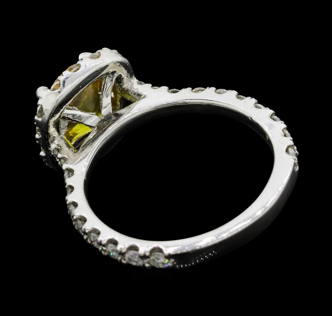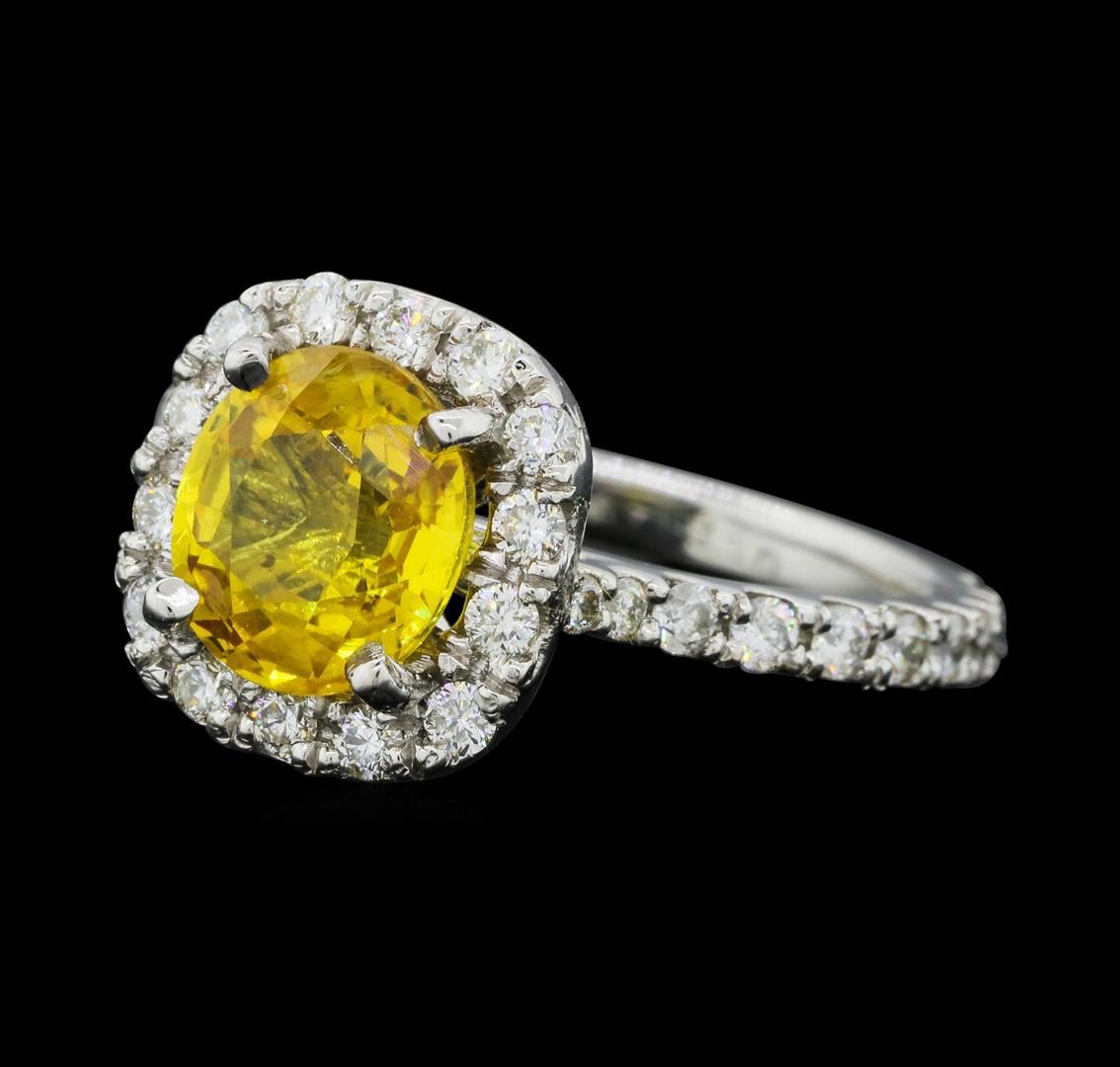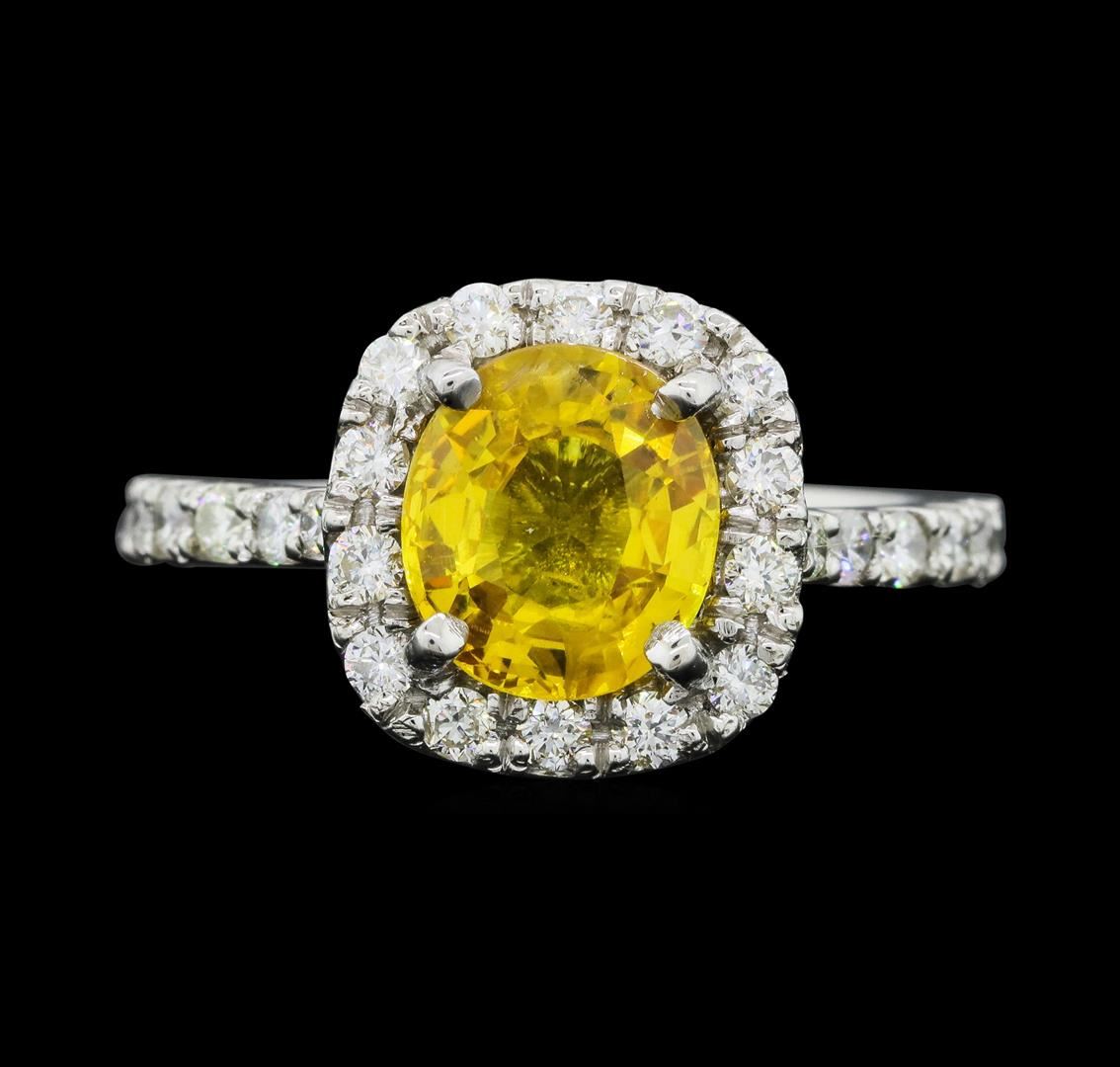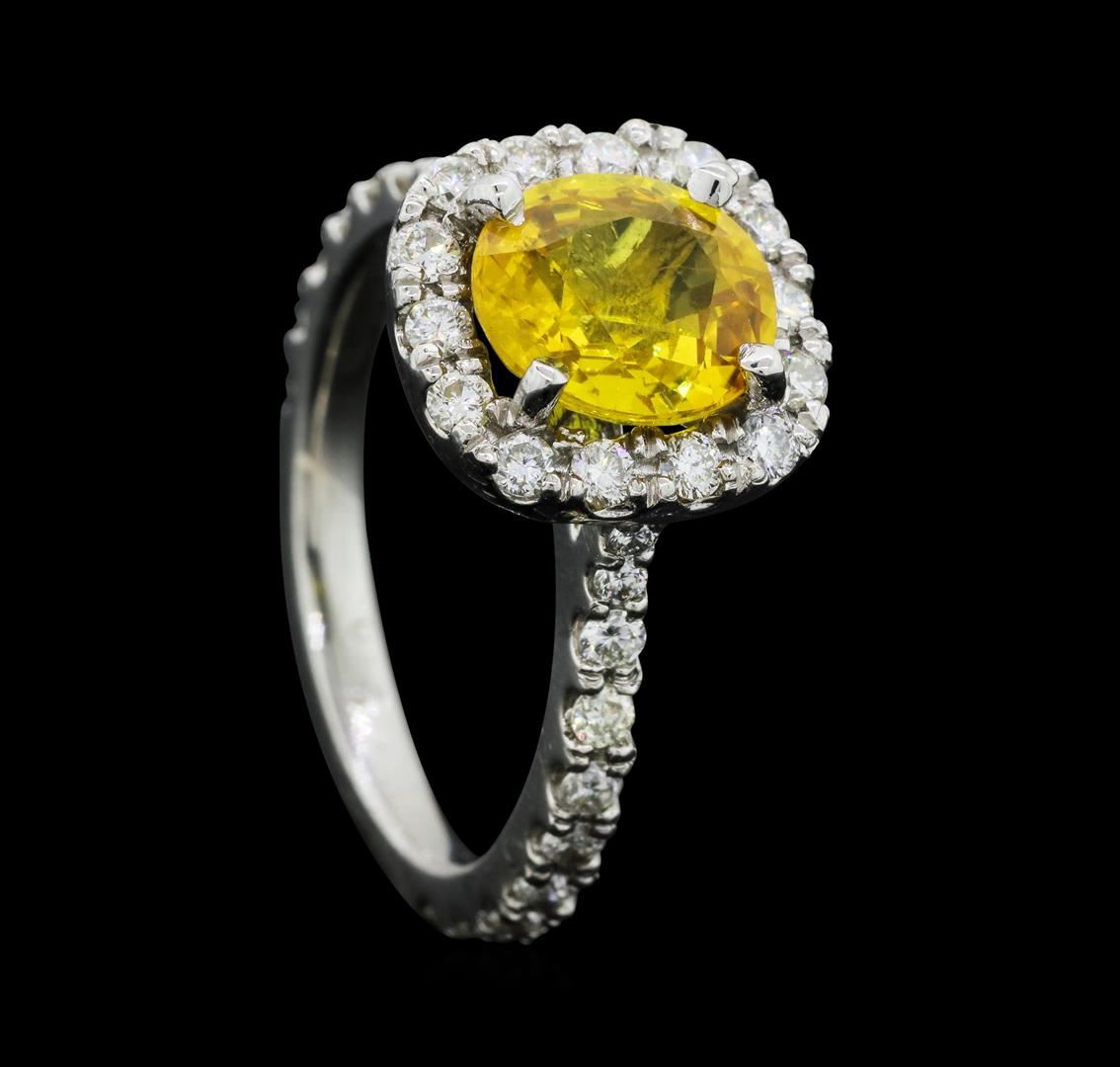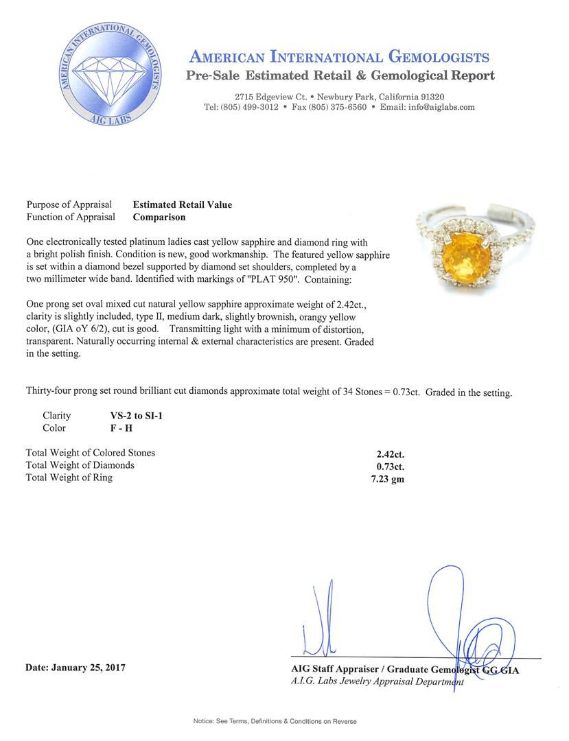 One electronically tested platinum ladies cast yellow sapphire and diamond ring with a bright polish finish. The featured yellow sapphire is set within a diamond bezel supported by diamond set shoulders, completed by a two millimeter wide band. Identified with markings of "PLAT 950". Condition is new, good workmanship. Containing: One prong set oval mixed cut natural yellow sapphire approximate weight of 2.42ct., clarity is slightly included, type II, medium dark, slightly brownish, orangy yellow color, (GIA oY 6/2), cut is good. Transmitting light with a minimum of distortion, transparent. Naturally occurring internal & external characteristics are present. Graded in the setting. Thirty-Four prong set round brilliant cut diamonds approximate total weight of 34 Stones = 0.73ct. Graded in the setting. Clarity: VS-2 to SI-1. Color: F - H. Total Weight of Colored Stones 2.42ct. Total Weight of Diamonds 0.73ct. Total Weight of Ring 7.23gm. AIG Appraised.