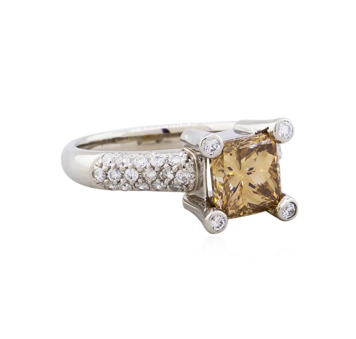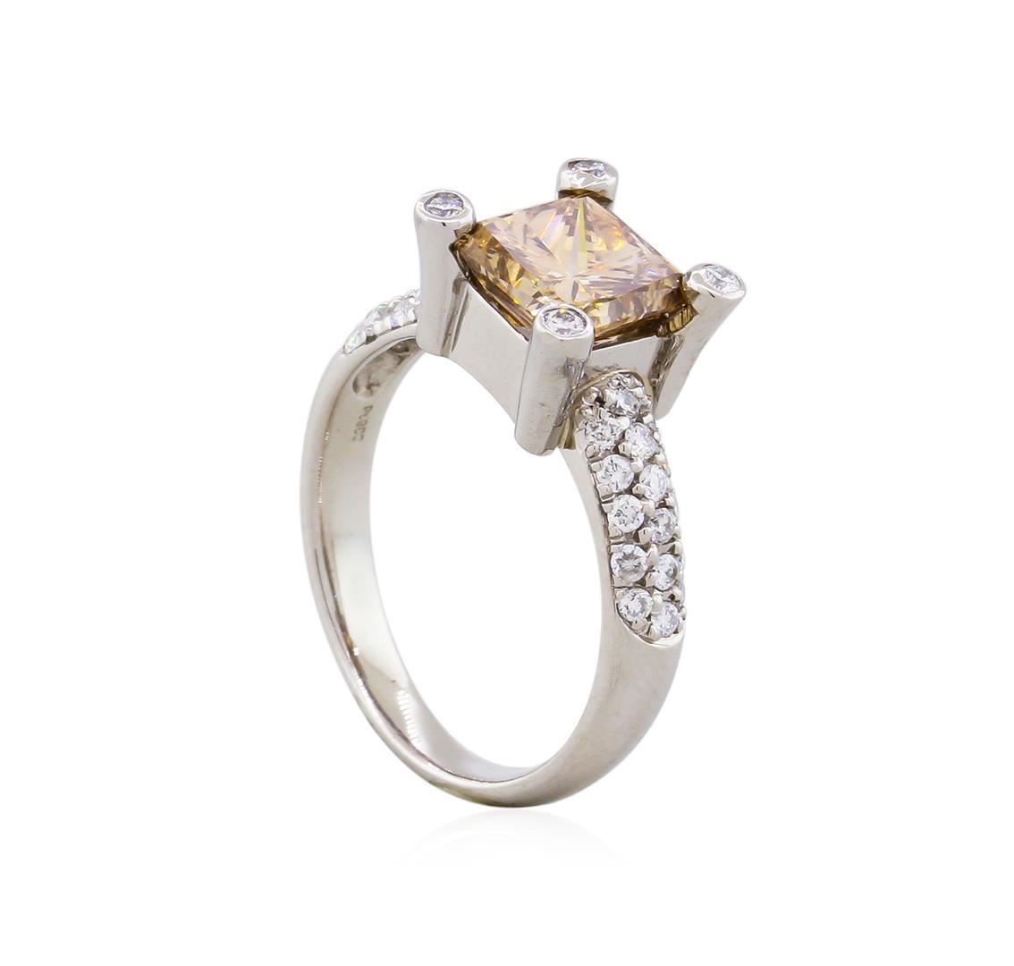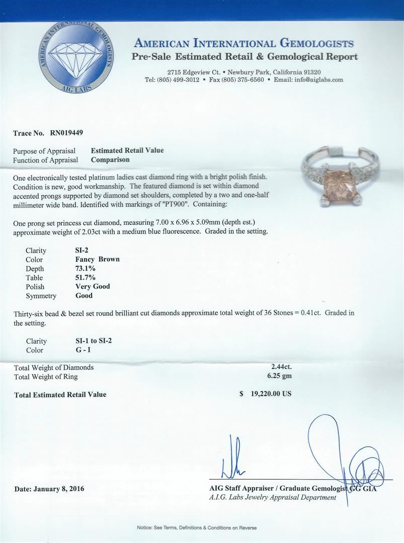 One electronically tested platinum ladies cast diamond ring with a bright polish finish. The featured diamond is set within diamond accented prongs supported by diamond set shoulders, completed by a two and one-half millimeter wide band. Identified with markings of "PT900". Condition is new, good workmanship. Containing: One prong set princess cut diamond, measuring 7.00 x 6.96 x 5.09mm (depth est.) approximate weight of 2.03ct with a medium blue fluorescence. Graded in the setting. Clarity: SI-2. Depth: 73.1%. Table 51.7%. Thirty-Six bead & bezel set round brilliant cut diamonds approximate. Total Weight of 36 Stones = 0.41ct. Graded in the setting. Clarity: SI-1 to SI-2. Color: G - I. Total Weight of Diamonds 2.44ct. Total Weight of Ring 6.25gm. AIG Appraised at $19,220.00.