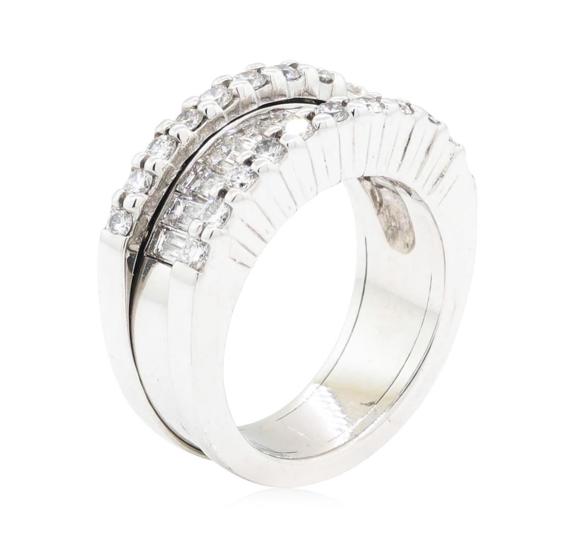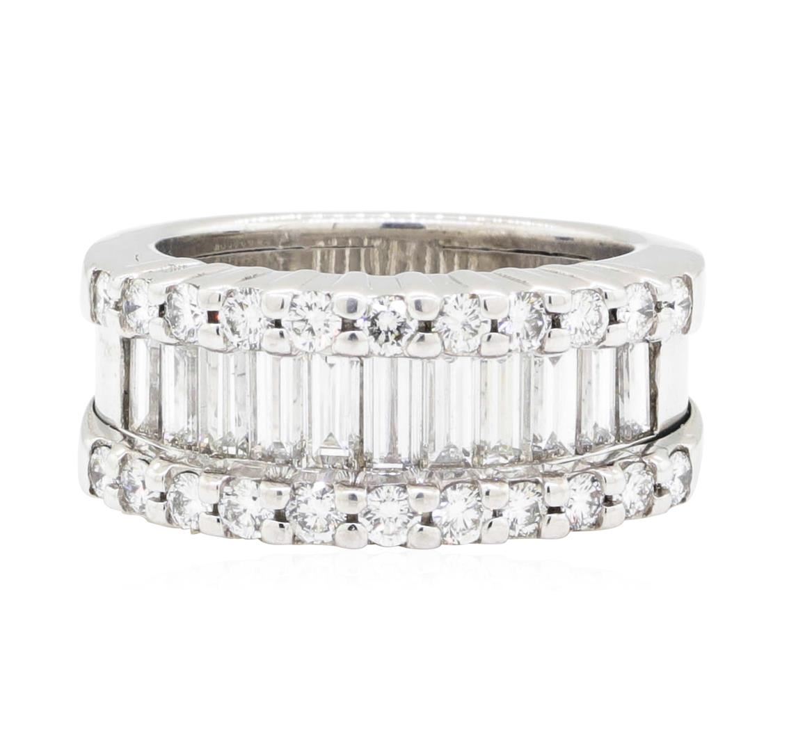 One electronically tested platinum Ladies cast fashion wedding band with a three row wide band with a bright polish finish. The featured Ladies ring has a shank measuring 6.3 millimeters in width. Identified with markings of 'PLAT'. Condition is new, good workmanship. Containing: Eleven channel set baguette cut diamonds, measuring from 3.85 x 2.00 x 1.70mm (depth est.) to 4.00 x 2.40 x 2.04mm (depth est.) approximate total weight of 11 Stones = 1.80ct. Graded in the setting. Color G - H Clarity VS-1 to VS-2 Cut Very Good Twenty-Two prong set round brilliant cut diamonds, measuring 2.00 - 1.95 x 1.21mm (depth est.) approximate total weight of 22 Stones = 0.65ct. Graded in the setting. Color G - H Clarity VS-2 to SI-1 Cut Very Good. Total Weight of Diamonds 2.45ct.. Total Weight of Wedding Band 17.20gm. GAS Appraised.