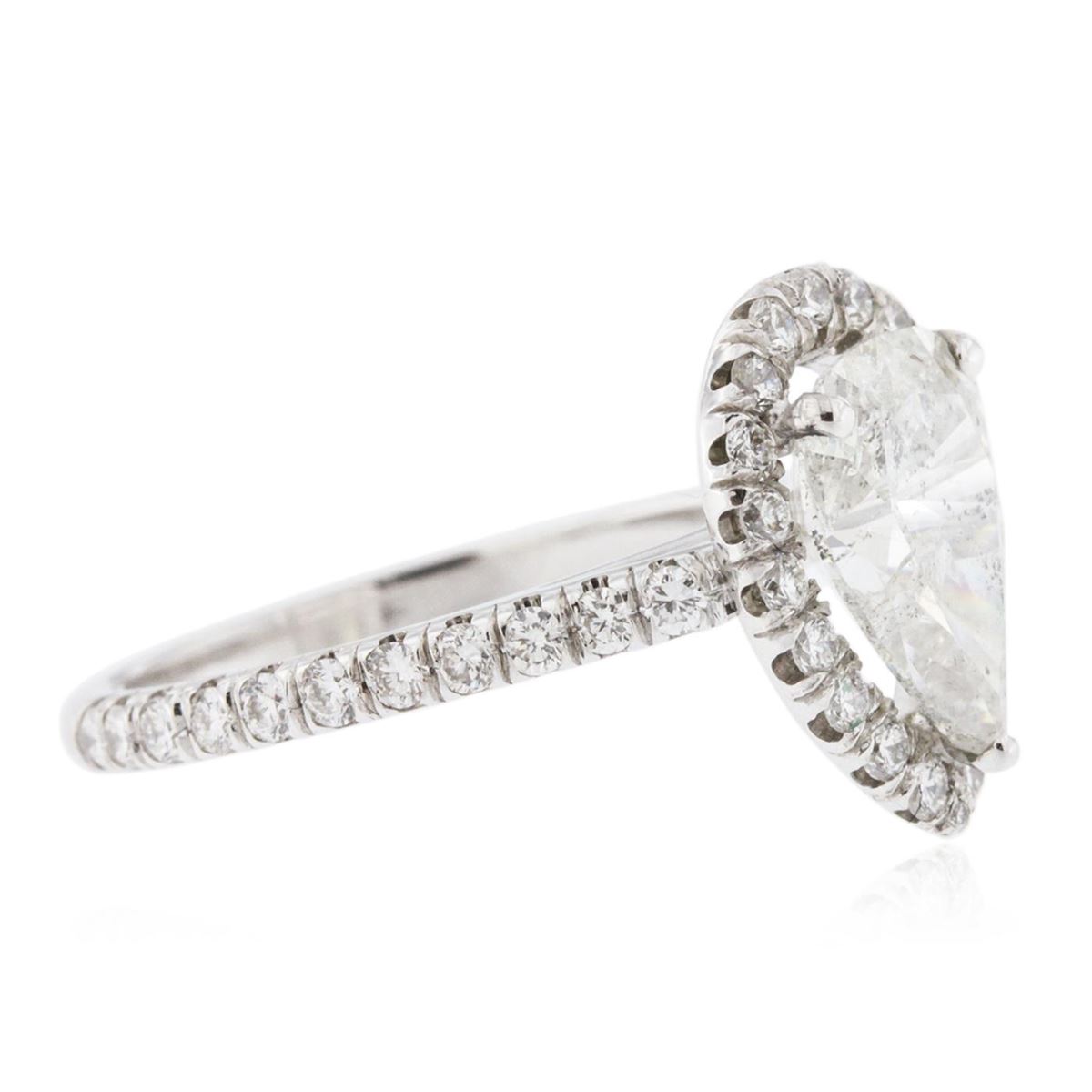 One electronically tested platinum ladies cast diamond unity ring with a bright polish finish. Condition is new, good workmanship. The featured diamond is set within a diamond bezel supported by diamond set shoulders, completed by a one and one-half millimeter wide band. Identified with markings of "PLAT". Containing: One prong set pear shaped cut diamond, measuring 10.20 x 7.10 x 4.50mm (depth est.) approximate weight of 2.05ct with a medium blue fluorescence. Graded in the setting. Clarity I-2 Color I Depth 63.4% Table 59.9%. Forty-two prong set round brilliant cut diamonds, measuring 1.60 - 1.50 x 0.93mm (depth est.) approximate total weight of 42 Stones = 0.65ct. Graded in the setting. Clarity VVS-1 to VS-1. Color G-I. Total Weight of Diamonds 2.70ct. Total Weight of Ring 5.43 grams. AIG Appraised at $21,880.00.