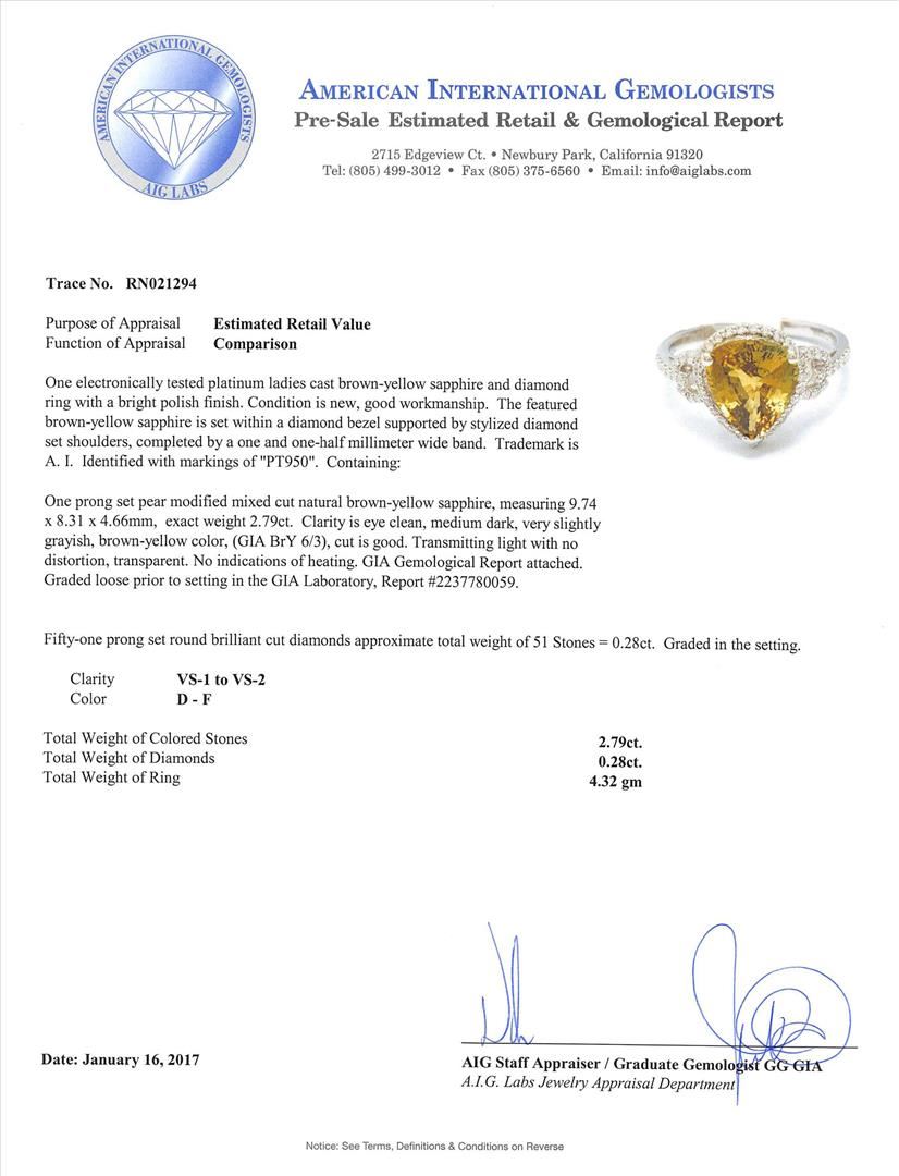 One electronically tested platinum ladies cast brown-yellow sapphire and diamond ring with a bright polish finish. The featured brown-yellow sapphire is set within a diamond bezel supported by stylized diamond set shoulders, completed by a one and one-half millimeter wide band. Trademark is A. I. Identified with markings of "PT950". Condition is new, good workmanship. Containing: One prong set pear modified mixed cut natural brown-yellow sapphire, measuring 9.74 x 8.31 x 4.66mm, exact weight 2.79ct. Clarity is eye clean, medium dark, very slightly grayish, brown-yellow color, (GIA BrY 6/3), cut is good. Transmitting light with no distortion, transparent. No indications of heating. GIA Gemological Report attached. Graded loose prior to setting in the GIA Laboratory, Report #2237780059.Fifty-One prong set round brilliant cut diamonds approximate total weight of 51 Stones = 0.28ct. Graded in the setting. Clarity: VS-1 to VS-2. Color: D - F. Total Weight of Colored Stones 2.79ct. Total Weight of Diamonds 0.28ct. Total Weight of Ring 4.32gm. AIG Appraised.
