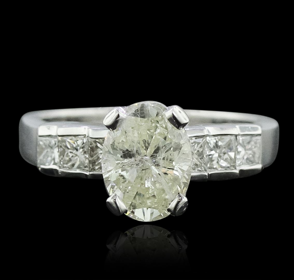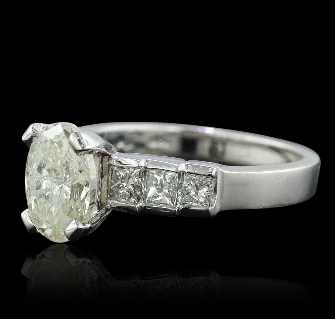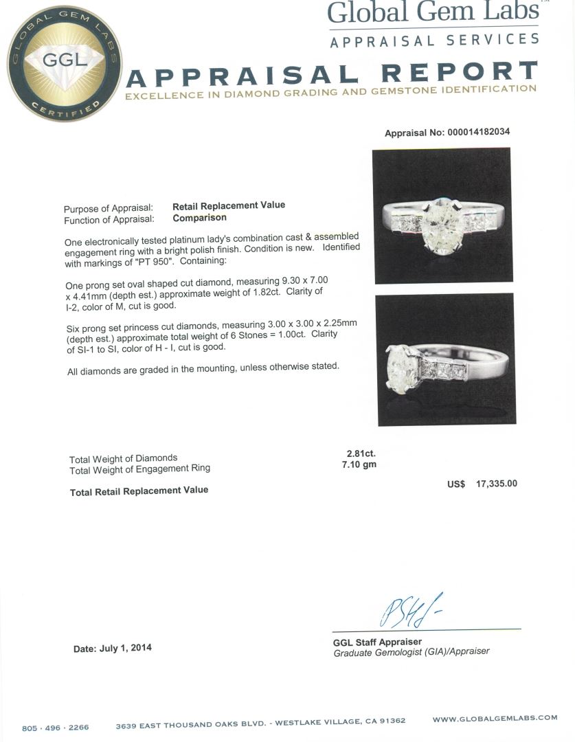 One electronically tested platinum Ladies combination cast & assembled engagement ring with a bright polish finish. Condition is new. Identified with markings of "PT 950". Containing: One prong set oval shaped cut diamond, measuring 9.30 x 7.00 x 4.41mm (depth est.) approximate weight of 1.82ct. Clarity: I-2. Color: M, Cut is Good. Six prong set princess cut diamonds, measuring 3.00 x 3.00 x 2.25mm (depth est.) approximate total weight of 6 Stones = 1.00ct. Clarity: SI-1 to SI. Color: H - I, Cut is Good. All diamonds are graded in the mounting, unless otherwise stated. Total Weight of Diamonds 2.81ct. Total Weight of Engagement Ring 7.10 grams. GGL Appraised at $17,335.00.